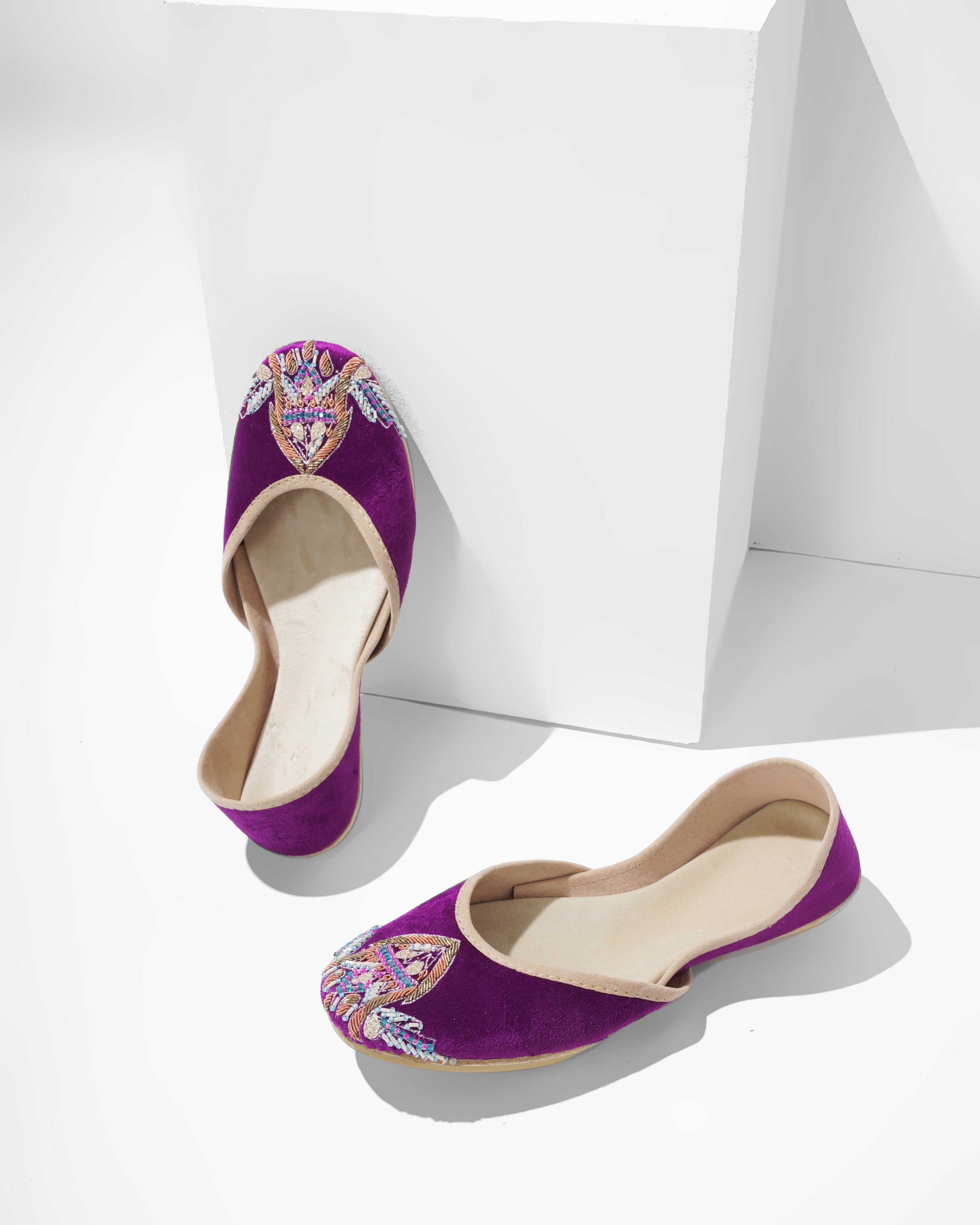Indulge in luxury with our 'Dulari', embellished with the finest kora dabka, golden cut-daana and semi-precious pearls. Each pair is crafted with meticulous attention to detail, resulting in a truly exquisite work of art for your feet. The purple velvet adds a touch of regal elegance to the khussa, while the intricate kora dabka work adds a beautiful texture and depth to the design. The golden cut-daana catches the light and adds a glamorous touch, while the semi-precious pearls create a subtle yet stunning contrast against the velvet