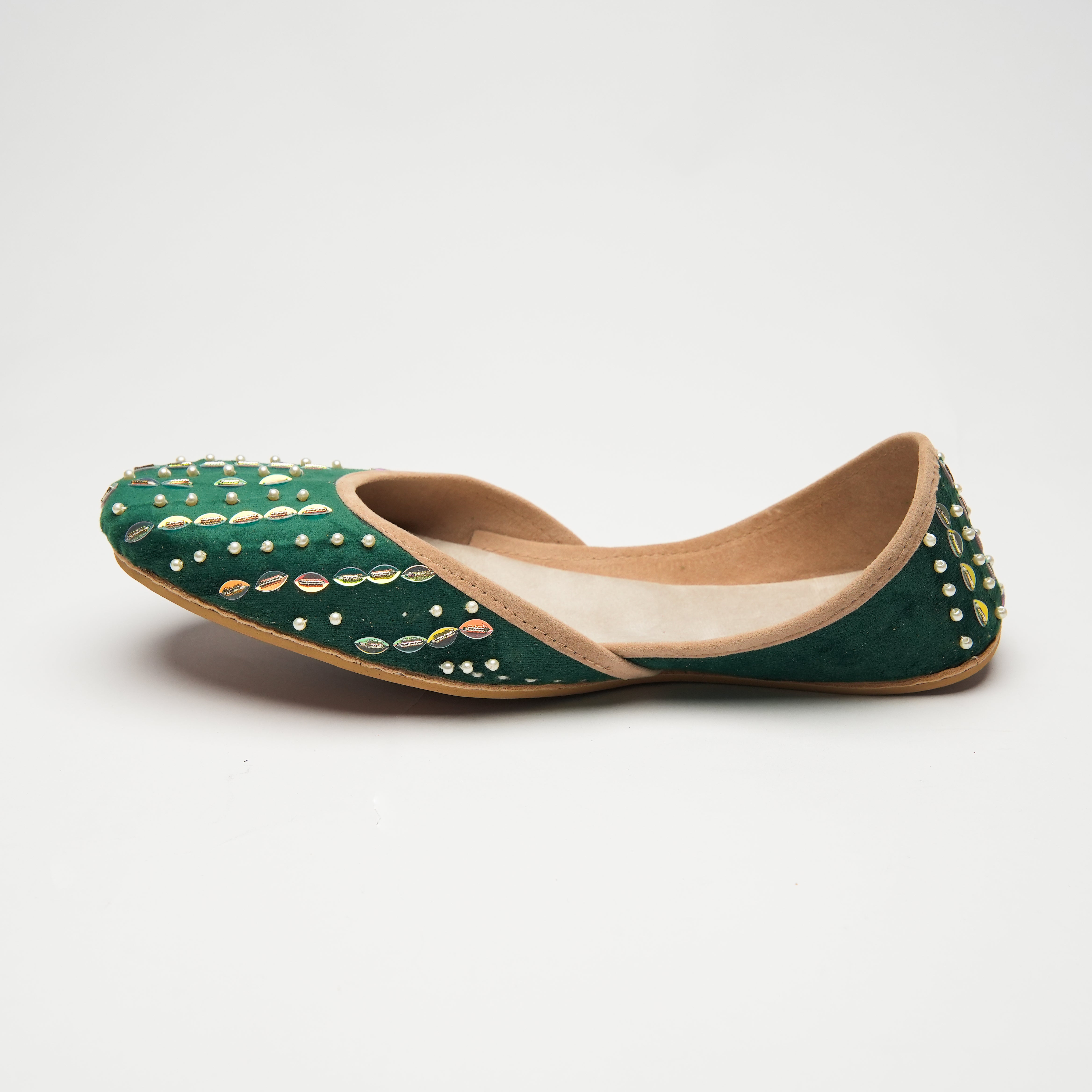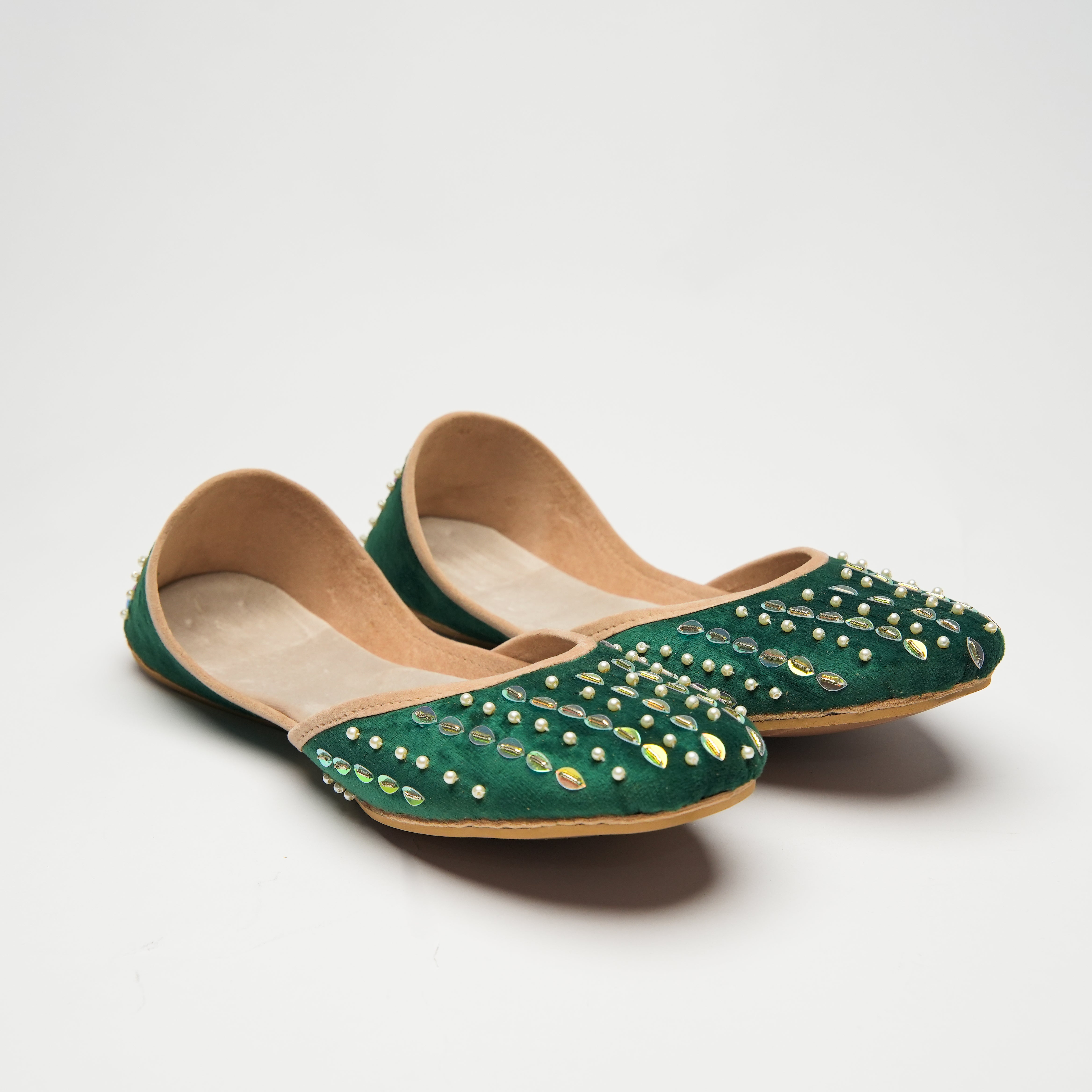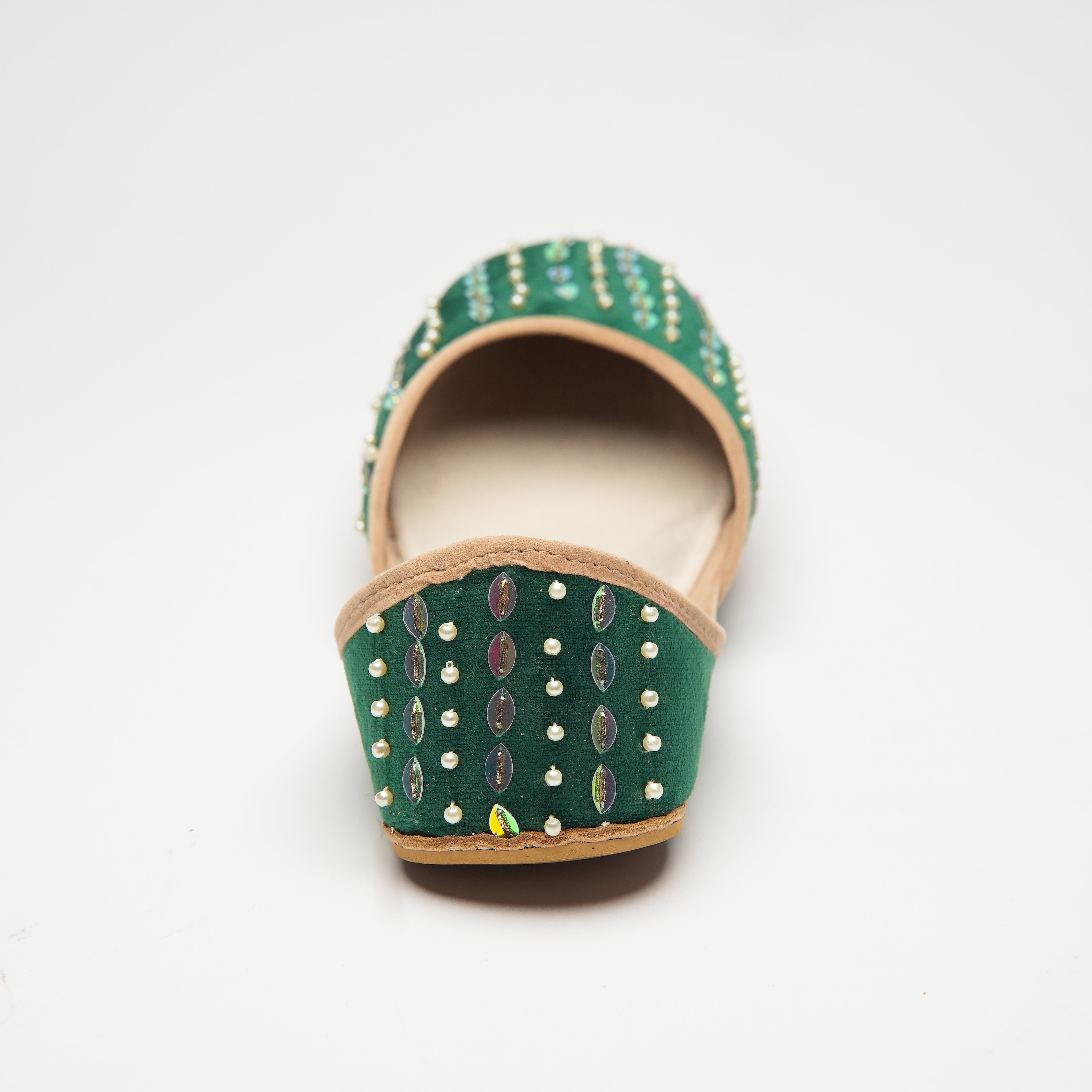 Kiran is a deep forest green khussa made on a velvet base. It consists of a simpler design element for the embellishments. Kiran represents the "beam of sunlight" and to honour that our team came up with a linear design for the front of the Khussa. Oval shaped light golden sequence has been used on top of which a light green bead is Layered. The light of the green bead reflects upon the golden sequence to provide a glowing finish. Alternating rows are embellished on with one row of the golden and green bead combination and the other row consisting of pearl white beads. Kiran is an Ethereal display of craftsmanship.