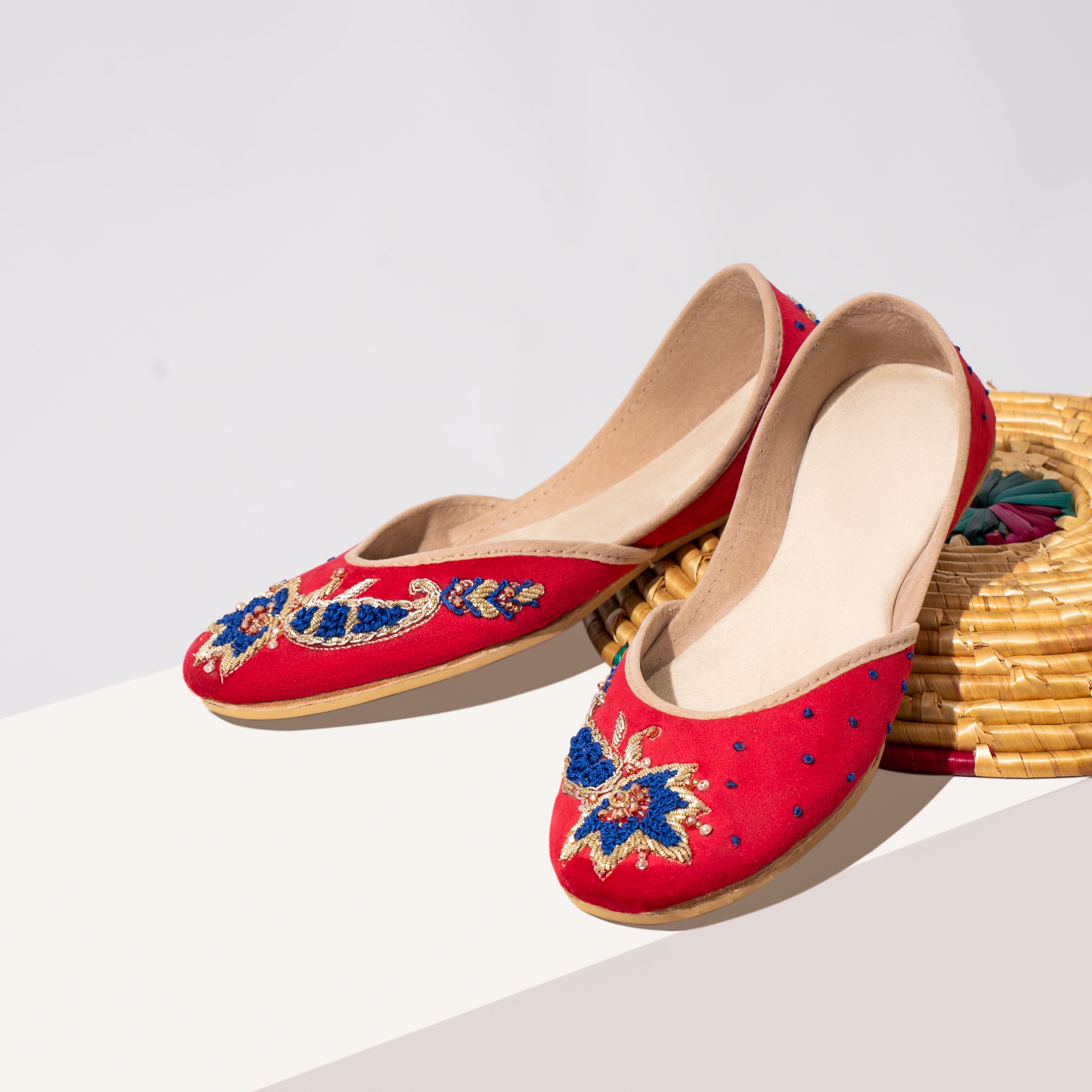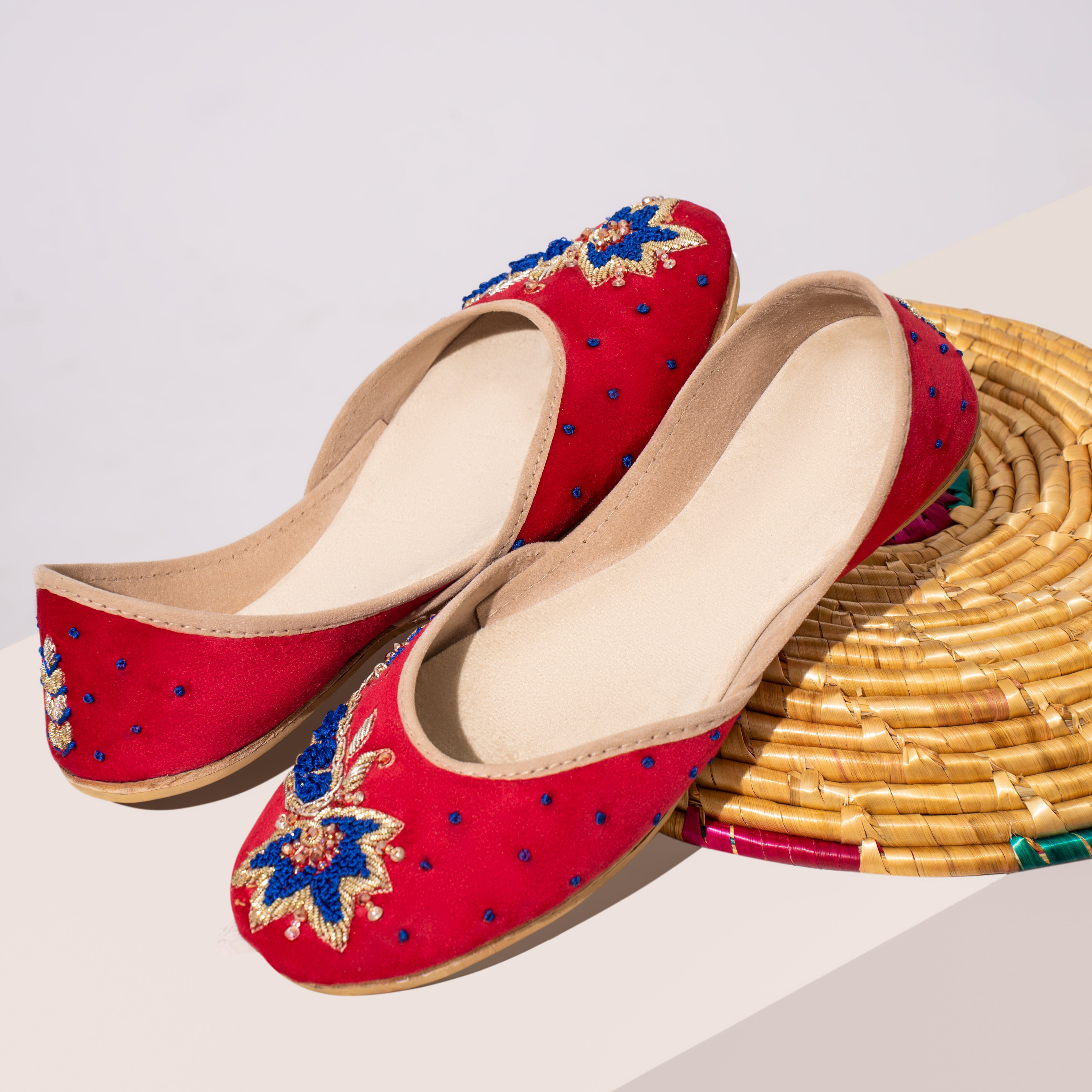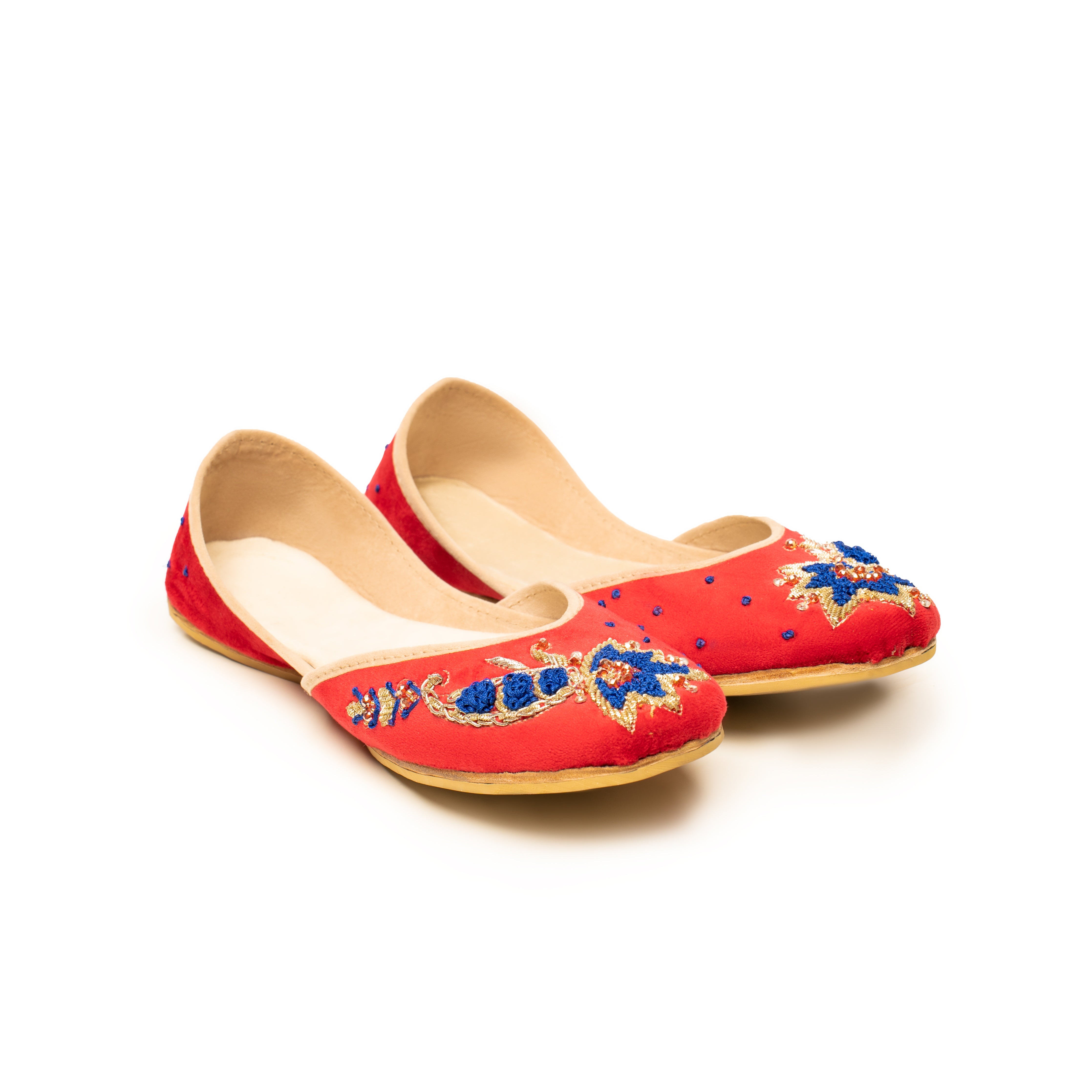 Immerse yourself in the beauty of the "Dark Magenta Dream" - handmade red khussa sandals decorated with intricate blue embroidery patterns. Its vibrant red color symbolizes sensuality, while the delicate blue pattern exudes artistry. You’ll experience the perfect blend of traditional and contemporary feel at every step. Embrace beauty and comfort both with our top quality velvet show stopper!