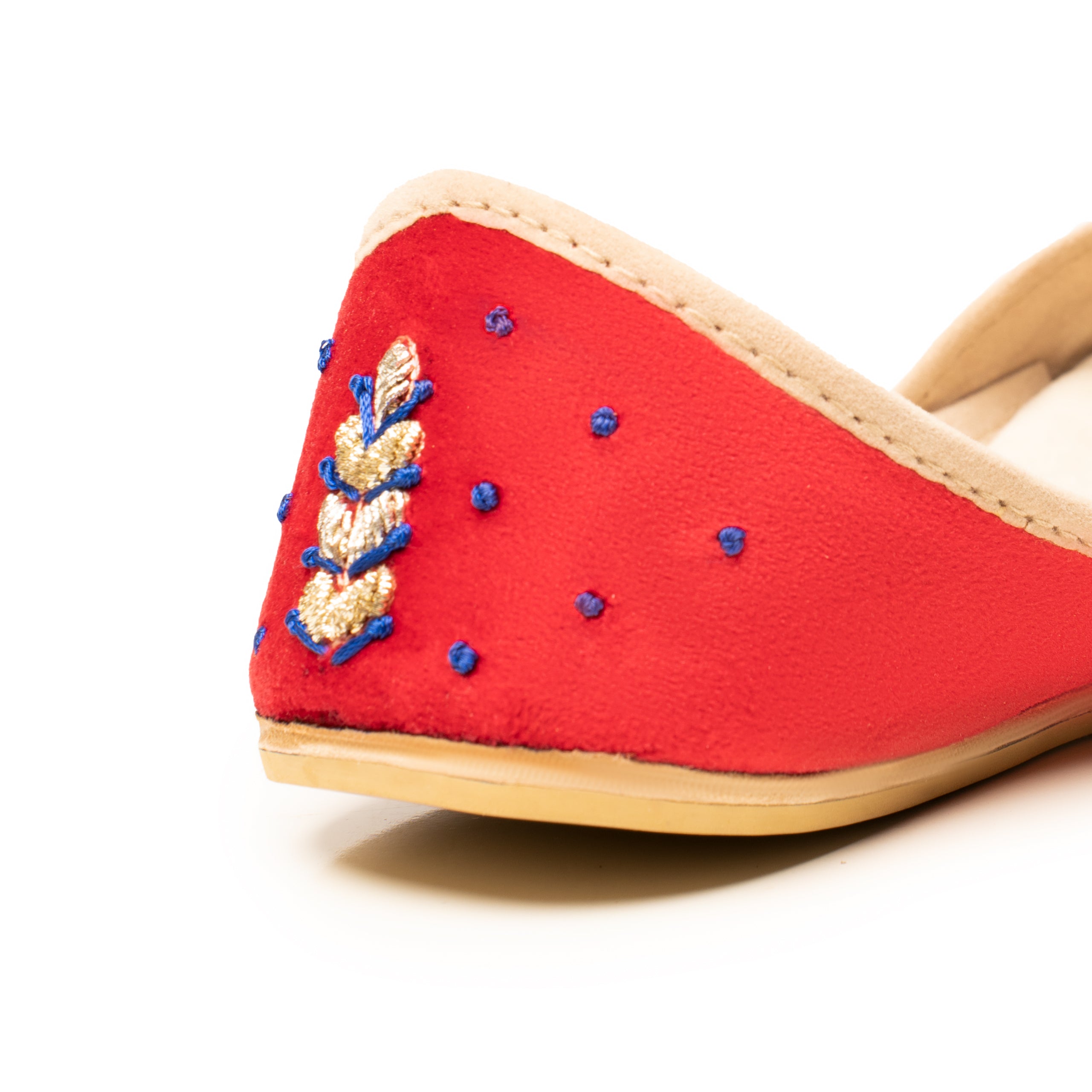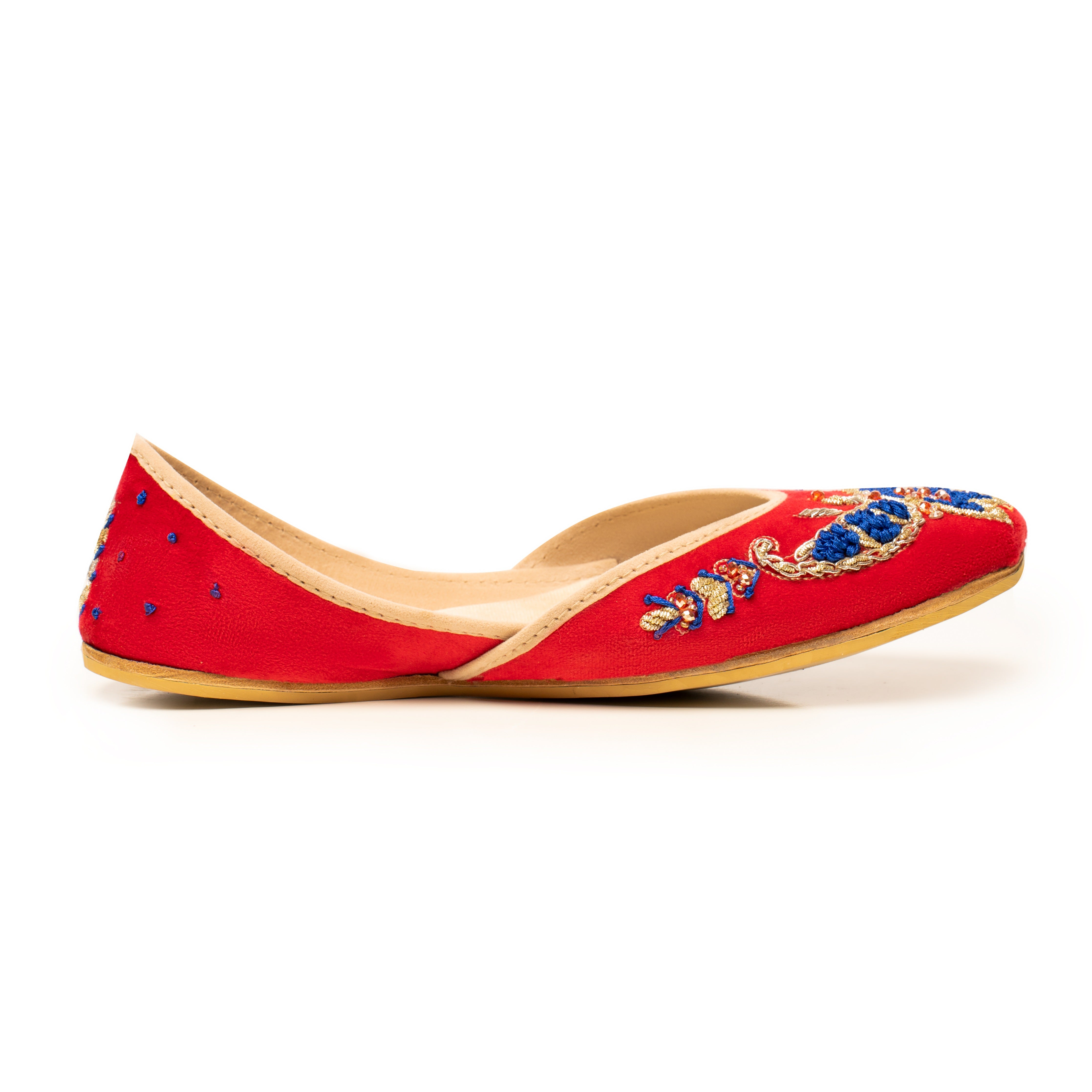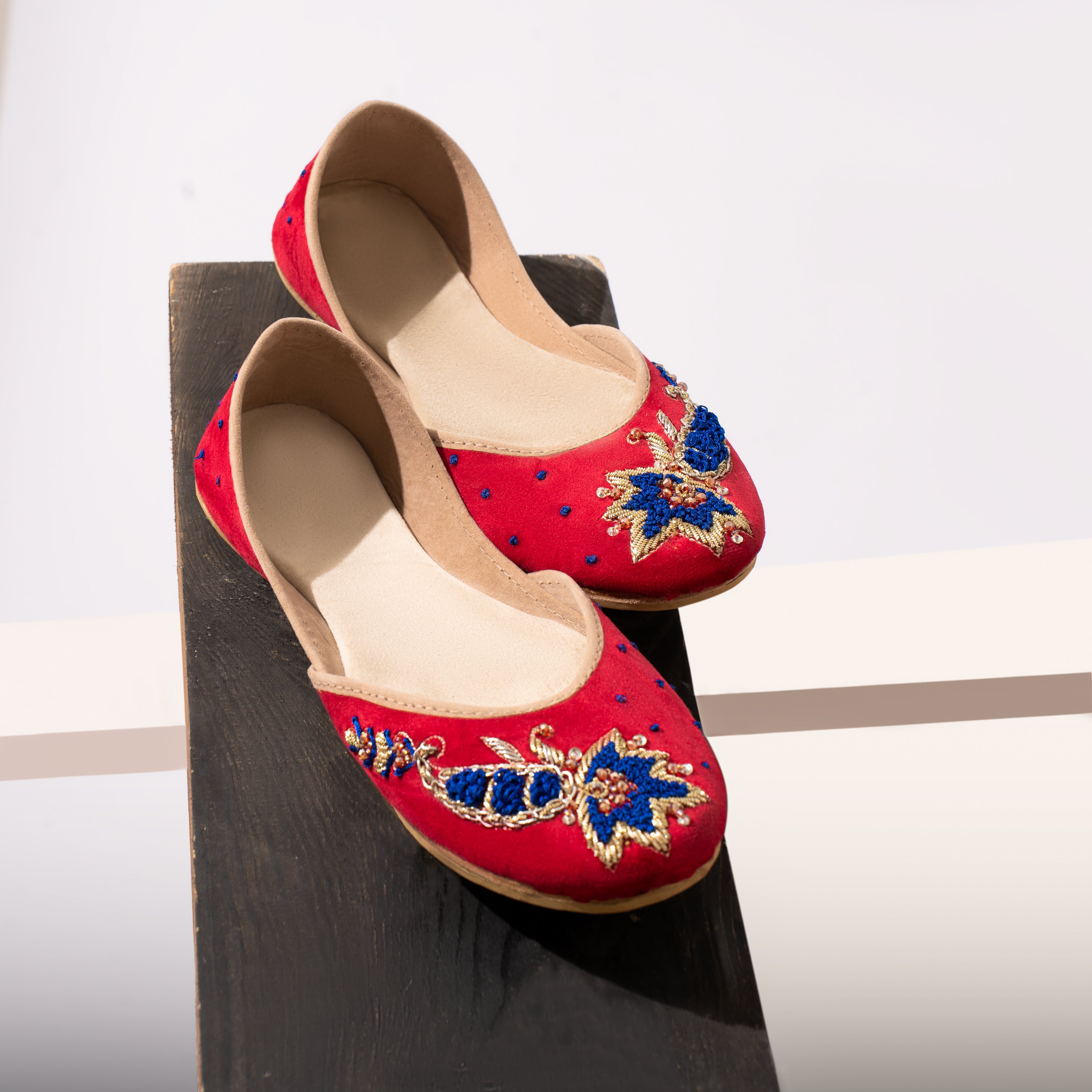 Immerse yourself in the beauty of the "Dark Magenta Dream" - handmade red khussa sandals decorated with intricate blue embroidery patterns. Its vibrant red color symbolizes sensuality, while the delicate blue pattern exudes artistry. You’ll experience the perfect blend of traditional and contemporary feel at every step. Embrace beauty and comfort both with our top quality velvet show stopper!