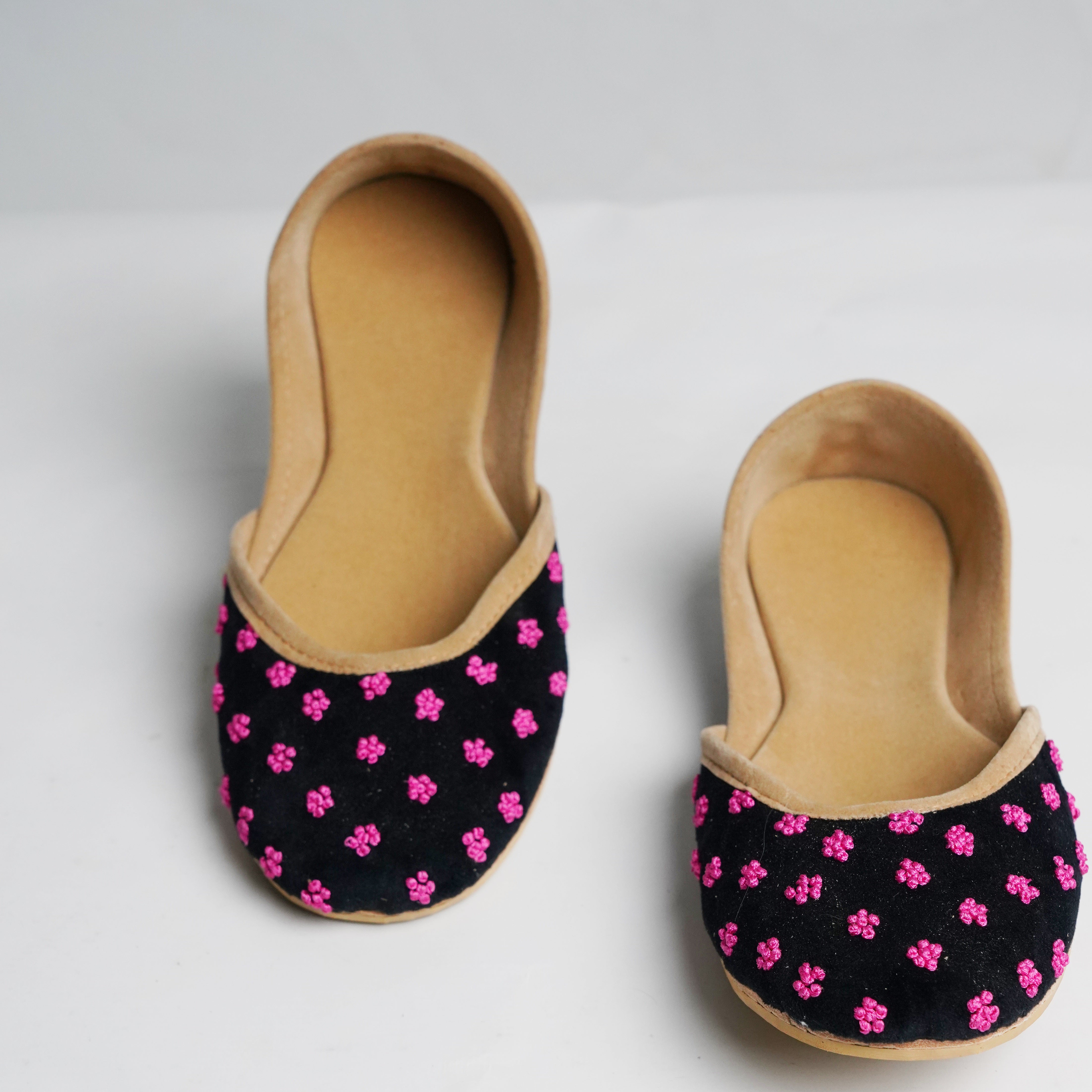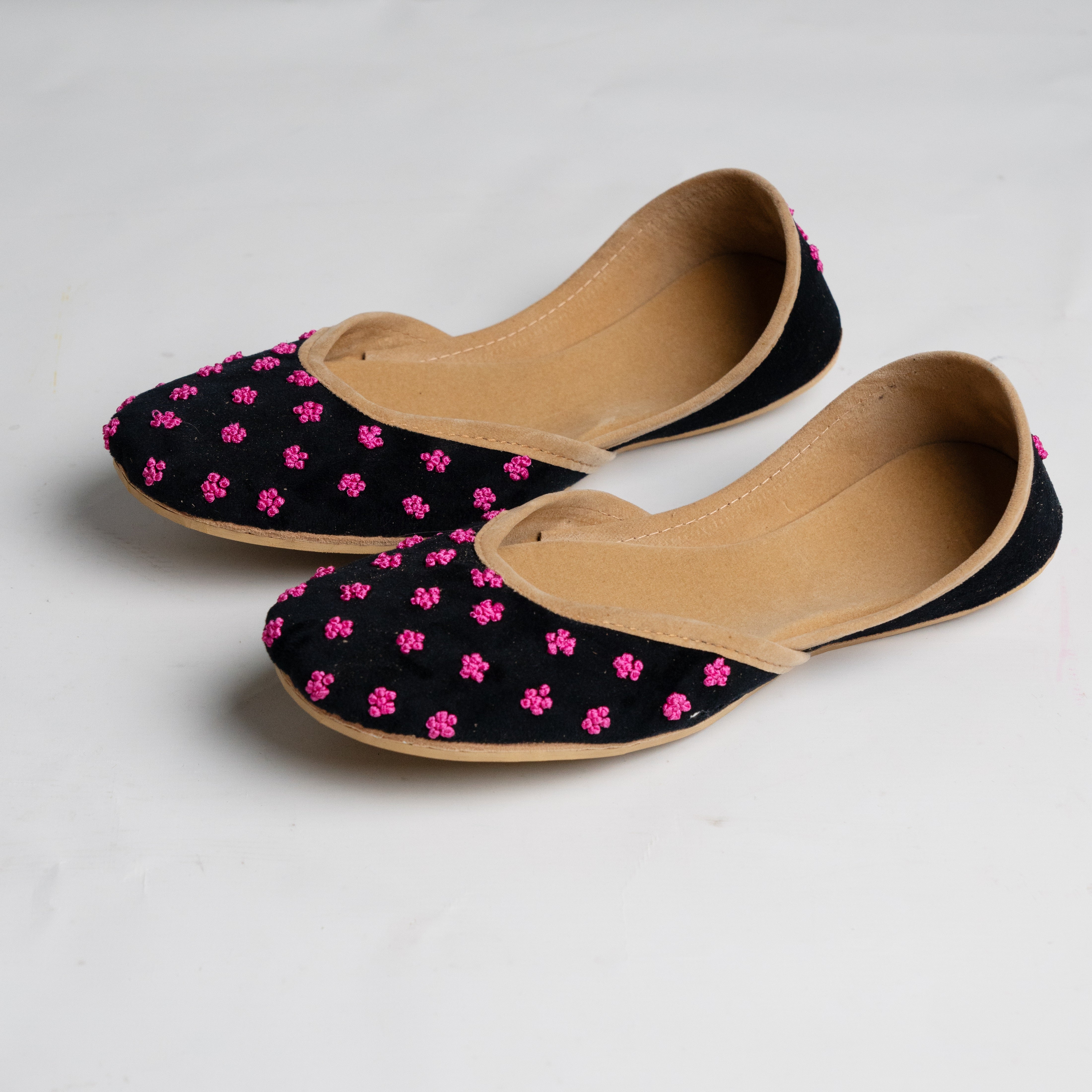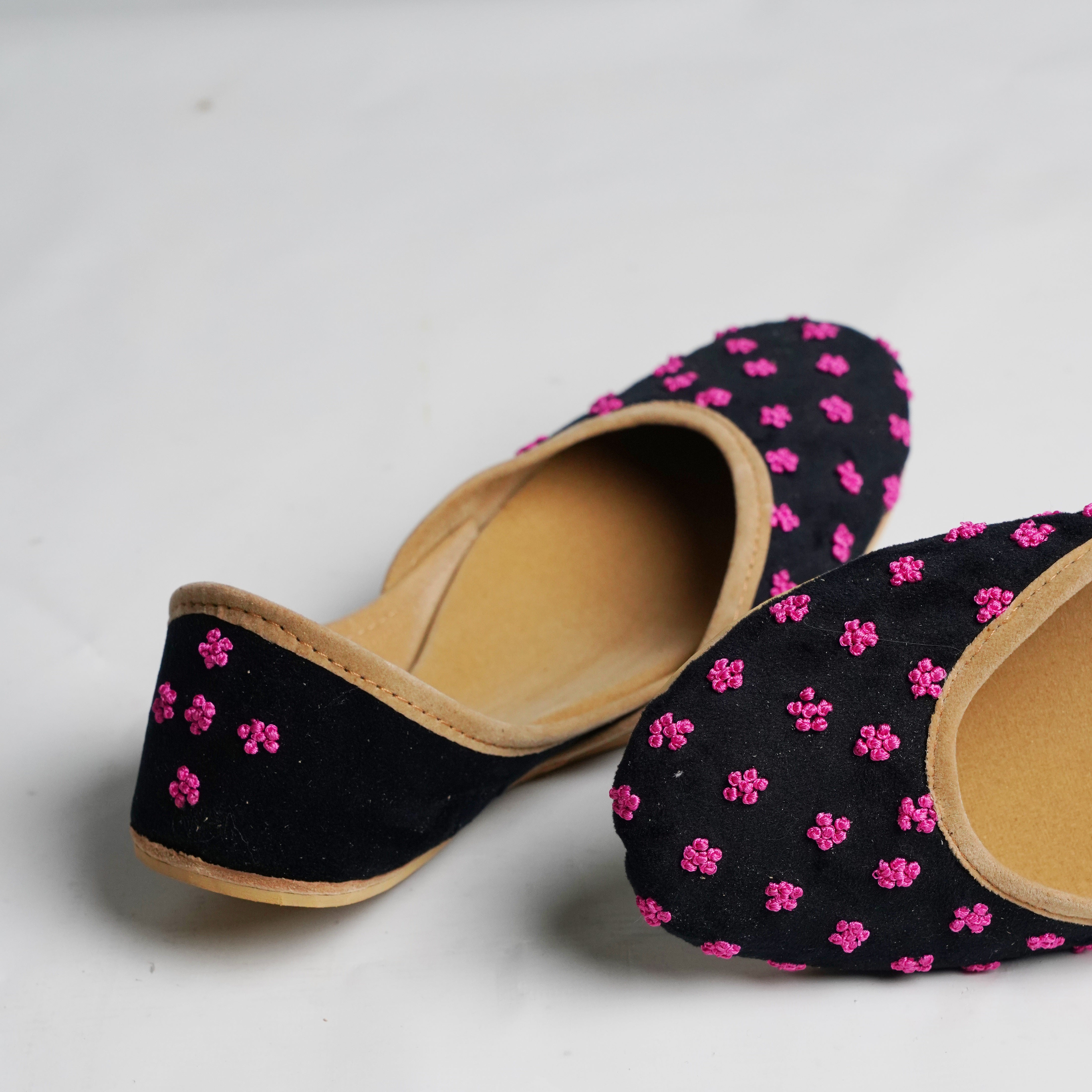 Mehak is a solid black Khussa with white French knot embroidery. It is primarily inspired by "Raat ki rani - Jasmine". The simple yet symbolic design is perfect for every occasion