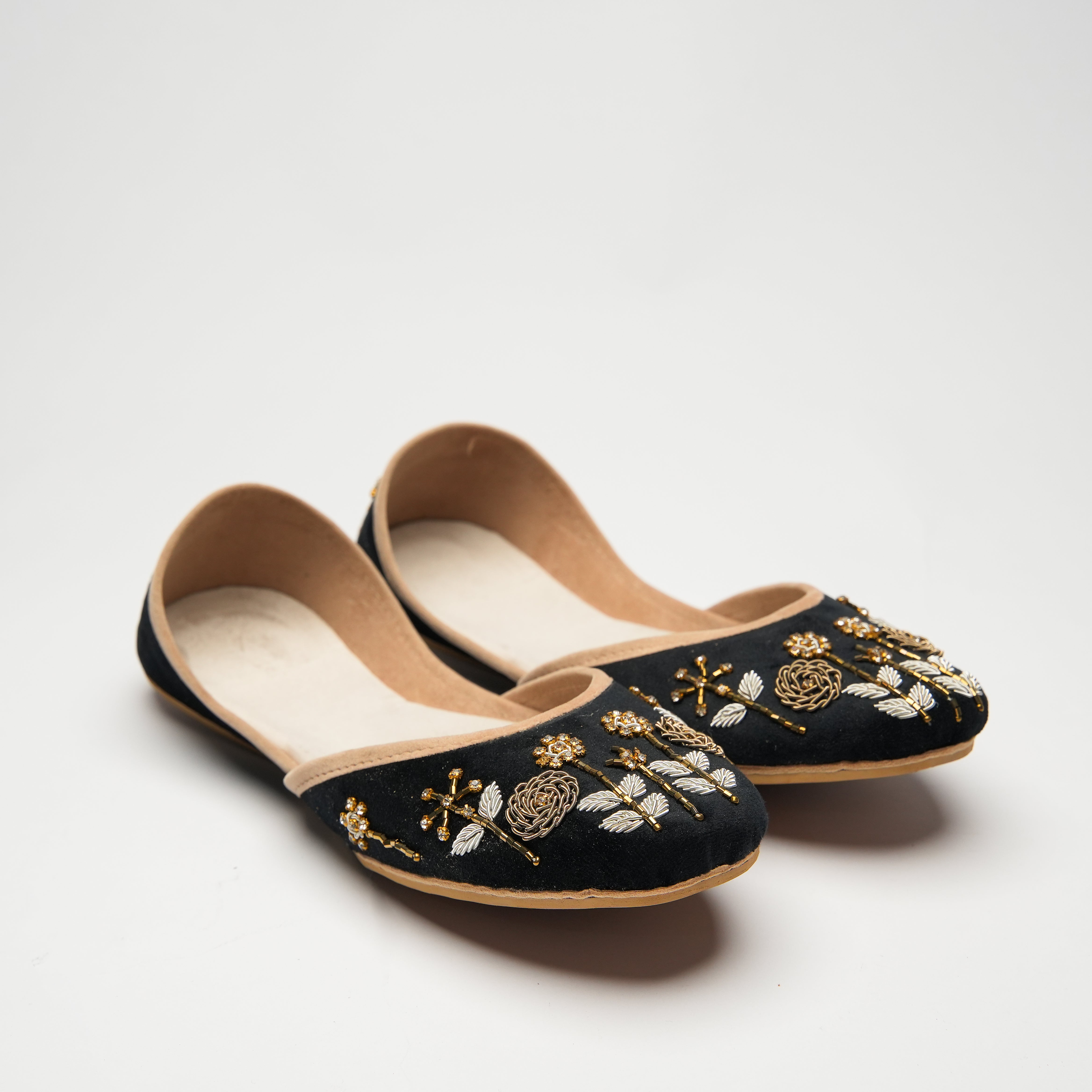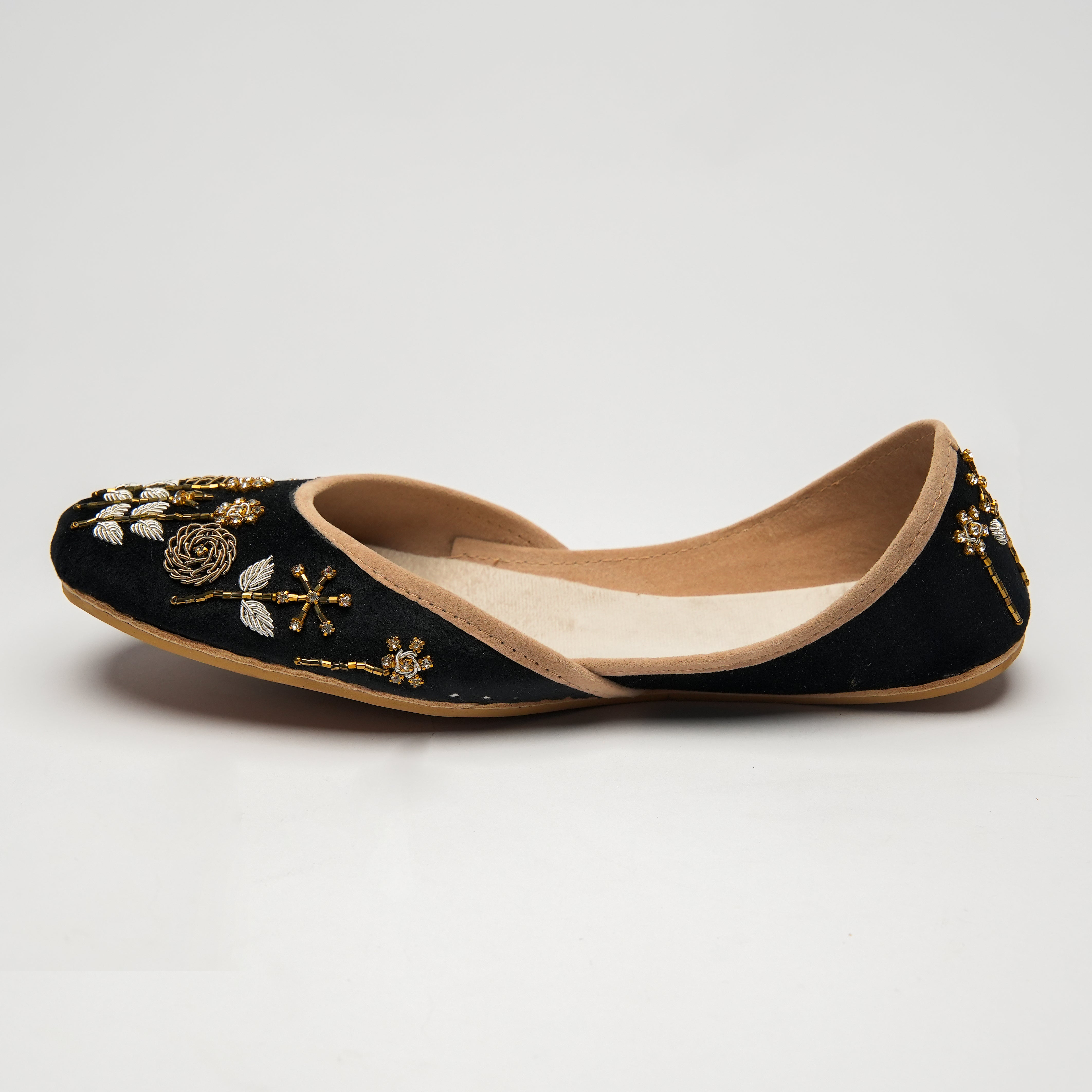 Crafted with top-quality materials, it is designed for all-purpose wear, ideal for any occasion or everyday use. The outsole is fashioned from premium rubber, ensuring not only comfortable walking but also slip resistance, providing added safety and peace of mind. This khussa/ Ballet flat is built to last, fashioned from pure hand processed leather that will withstand the test of time. The inner sole features a luxurious velvet lining, making it incredibly comfortable and snug for your feet.