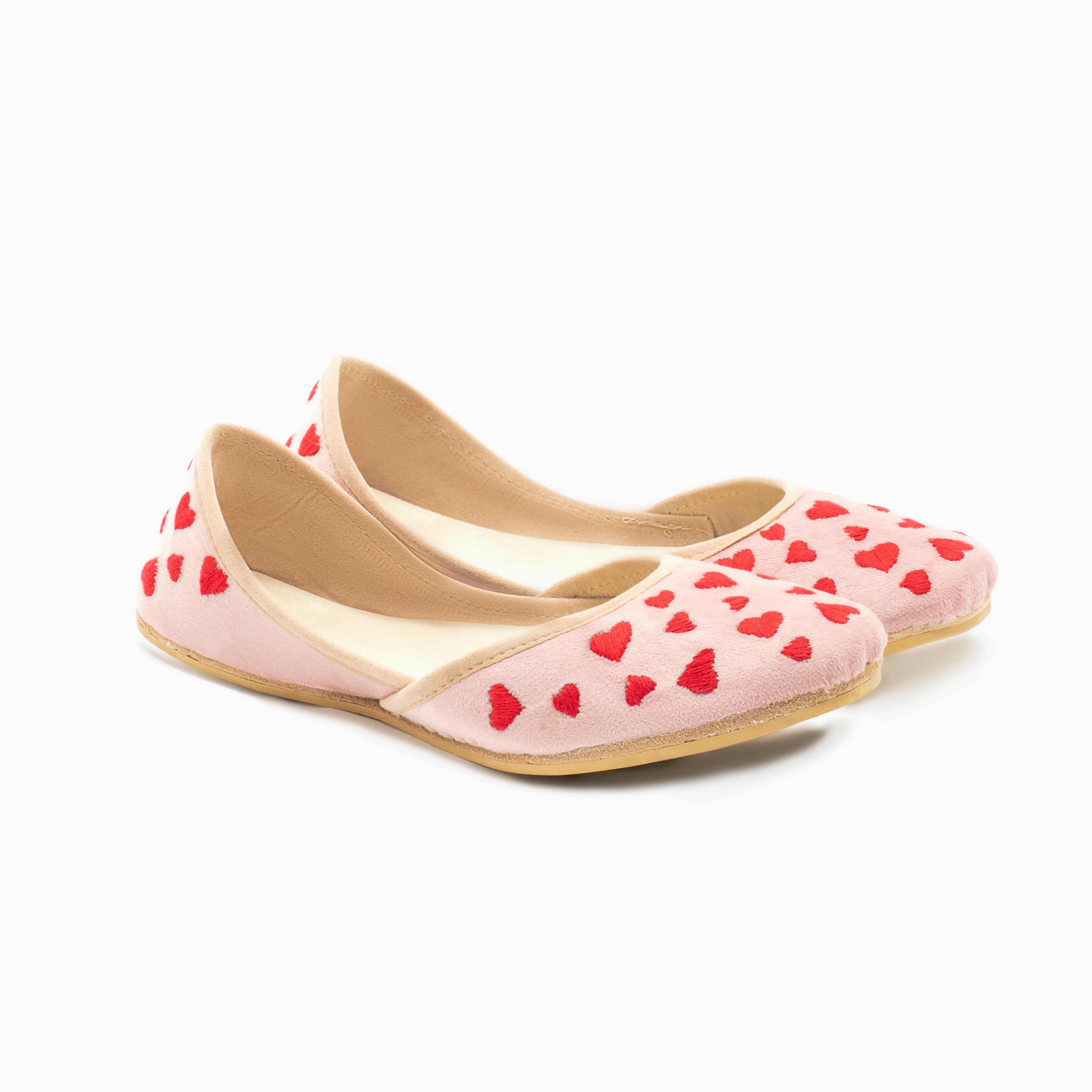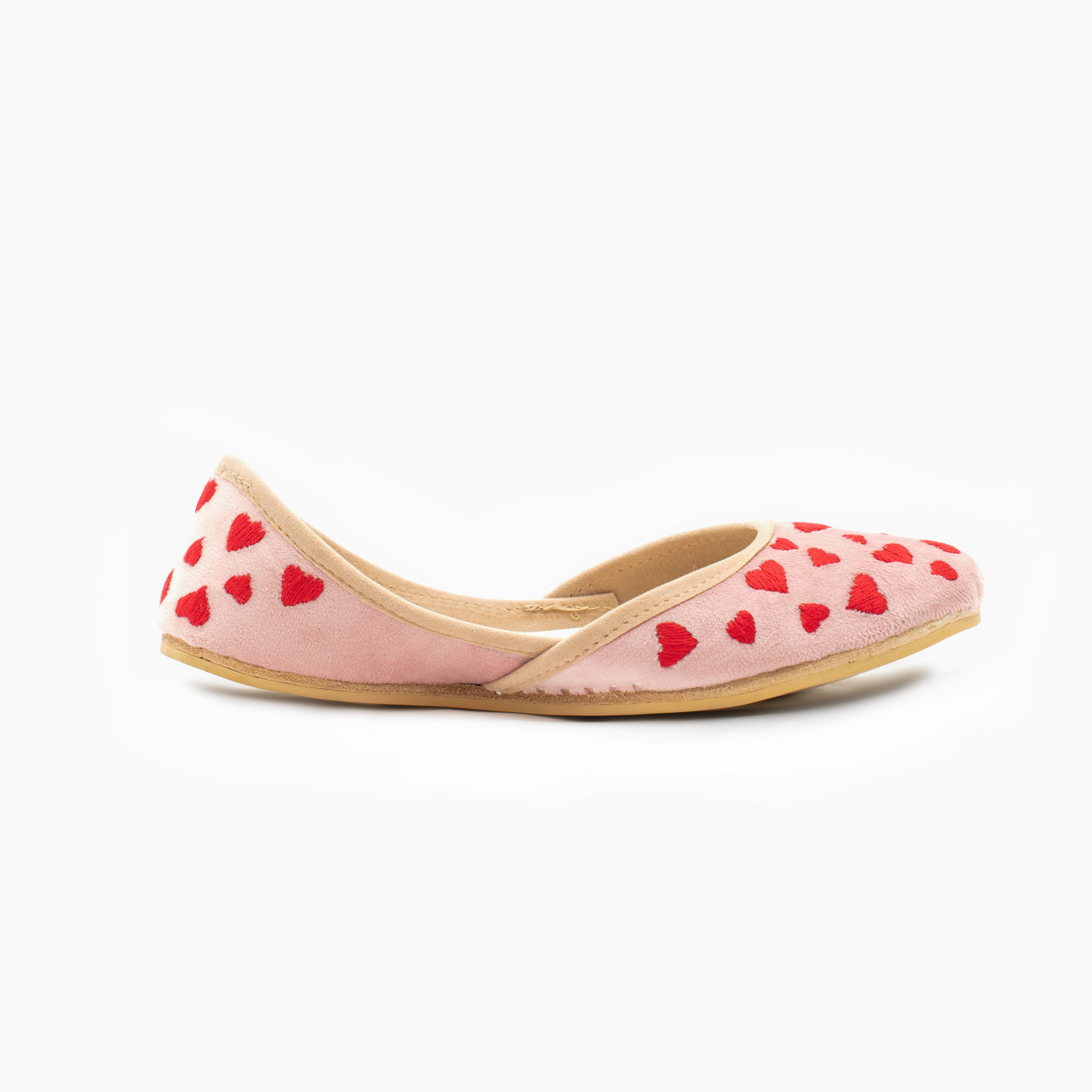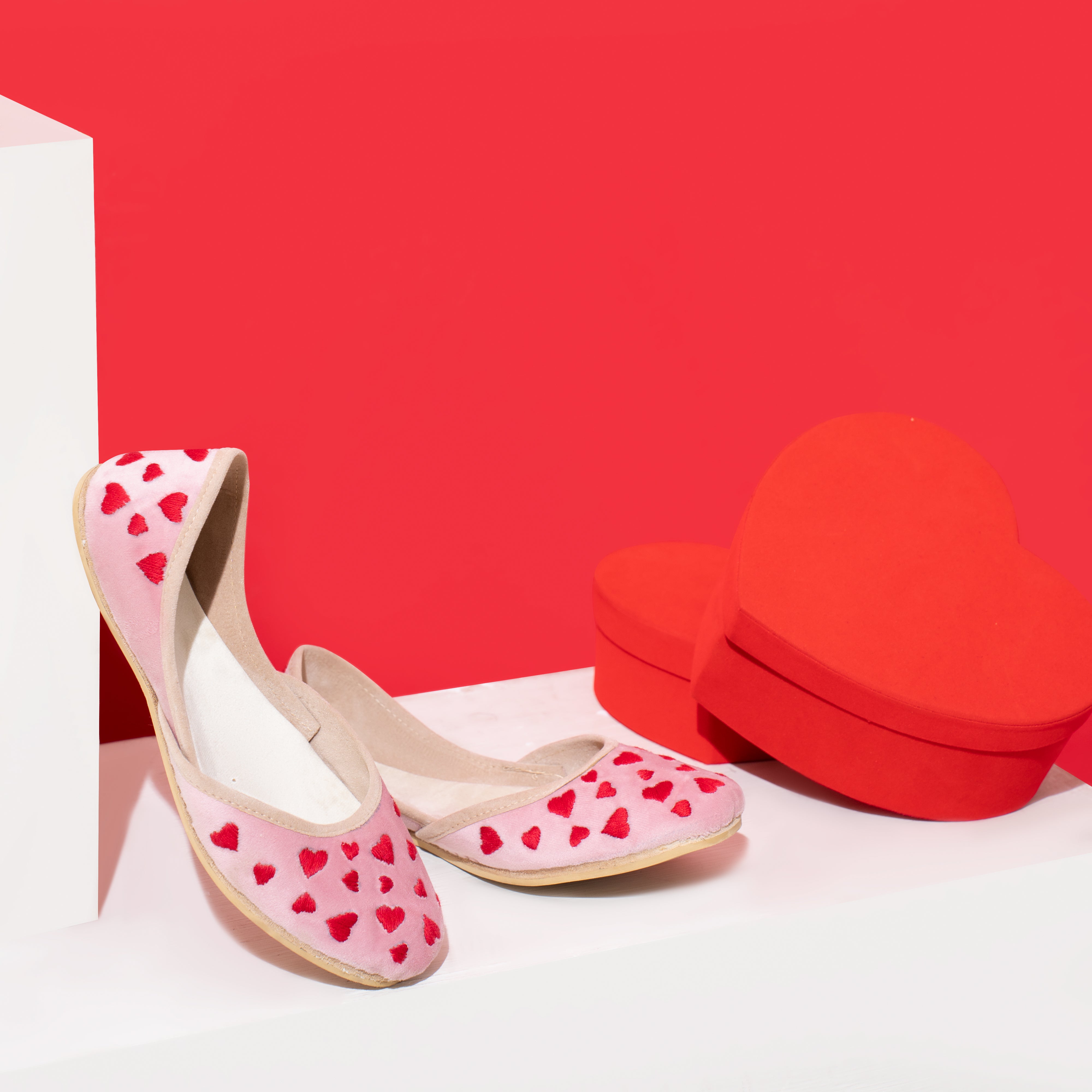 Queen of Hearts has been embellished in hand embroidered red hearts on a soft pink velvet base. Our team aimed to symbolise the soft yet fierce and passionate young Love with this color palette. Queen of Hearts is the perfect shoe to add a pop of color and fun in to your outfit. The Hand embroidered hearts add character to the Khussa and makes it all the more special that someone made it by hand, just for you..