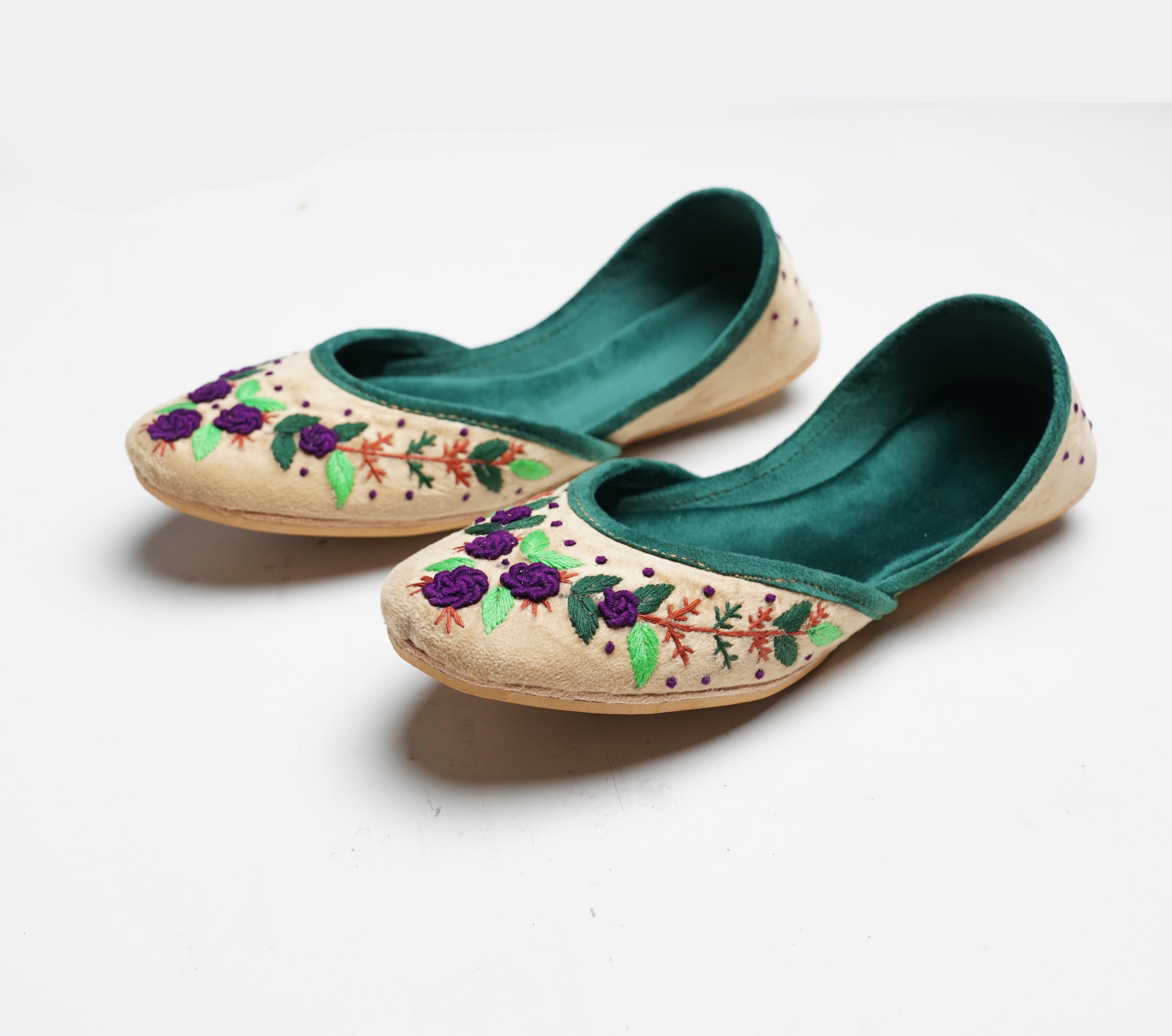 Crafted with top-quality materials, it is designed for all-purpose wear, ideal for any occasion or everyday use. The outsole is fashioned from premium rubber, ensuring not only comfortable walking but also slip resistance, providing added safety and peace of mind. This khussa/ Ballet flat is built to last, fashioned from pure hand processed leather that will withstand the test of time. The inner sole features a luxurious velvet lining, making it incredibly comfortable and snug for your feet.