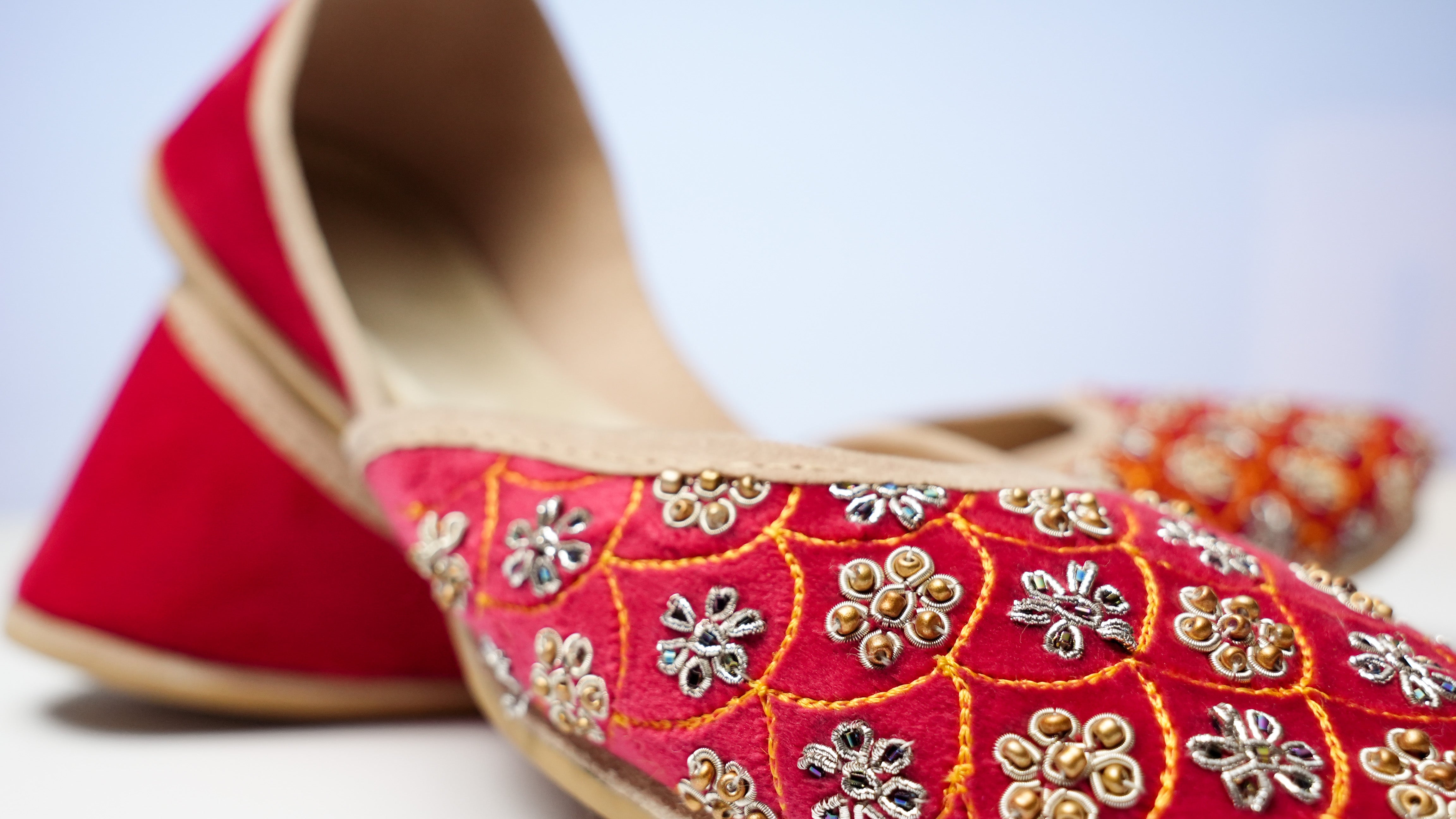 The rich, deep shade of the red khussa is striking and bold, making them perfect for special occasions where you want to stand out. The delicate embroidery work, with its small blue and yellow flowers, adds a touch of elegance and grace to the overall design. The flowers embroidered on the khussas are meticulously crafted, with each petal and leaf carefully detailed to create a stunning visual effect.