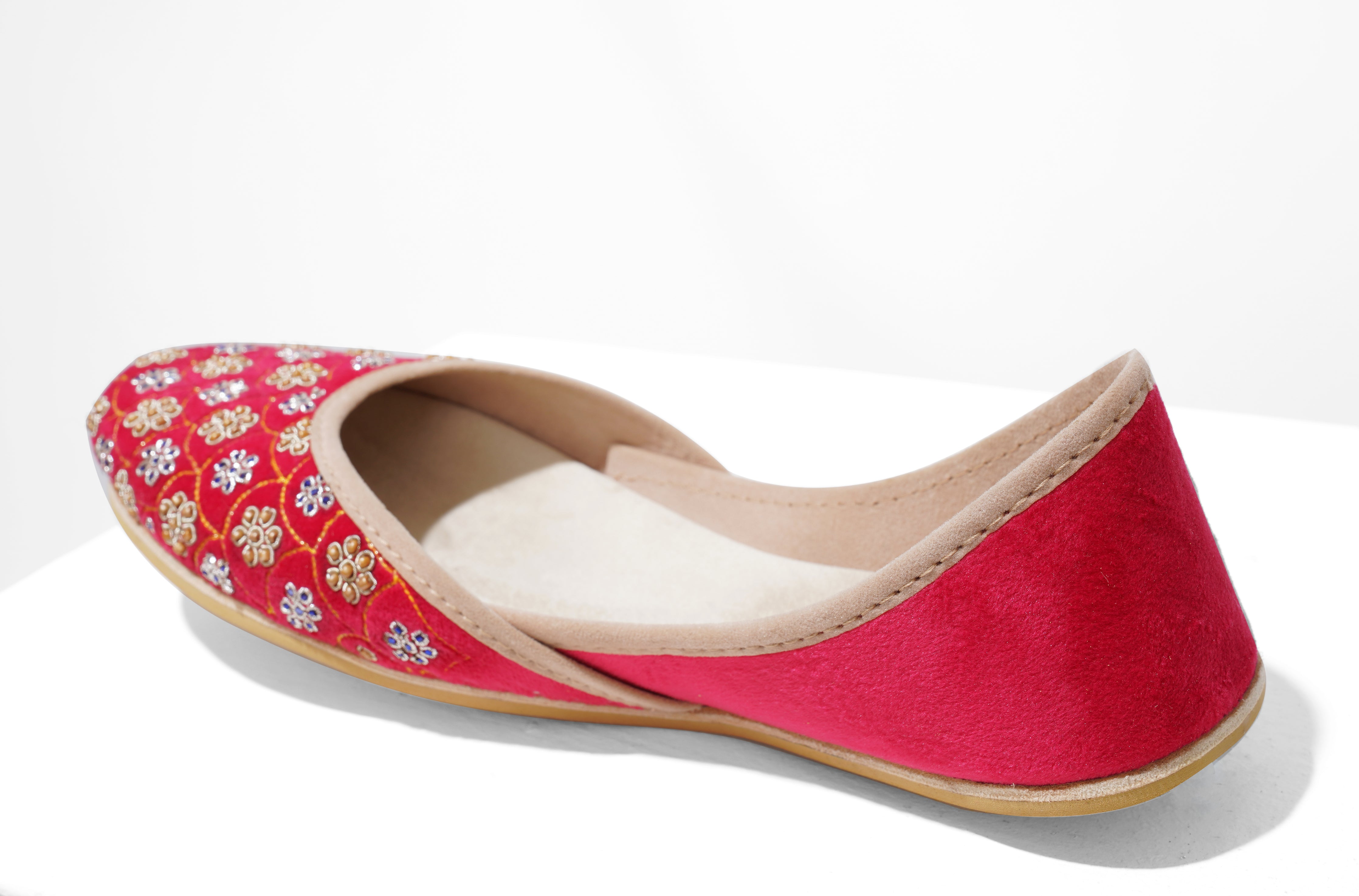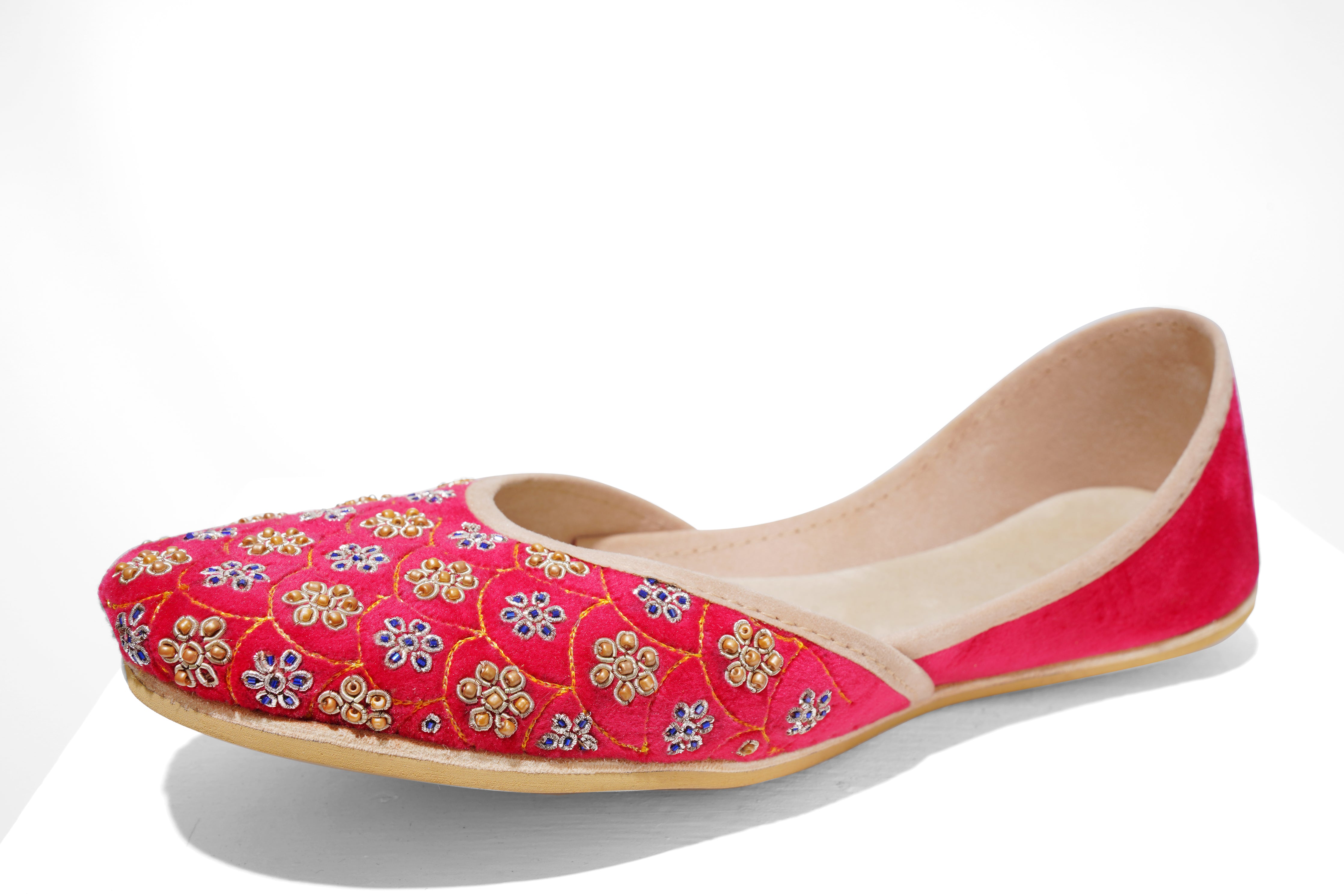 Crafted with top-quality materials, it is designed for all-purpose wear, ideal for any occasion or everyday use. The outsole is fashioned from premium rubber, ensuring not only comfortable walking but also slip resistance, providing added safety and peace of mind. This khussa/ Ballet flat is built to last, fashioned from pure hand processed leather that will withstand the test of time. The inner sole features a luxurious velvet lining, making it incredibly comfortable and snug for your feet.
