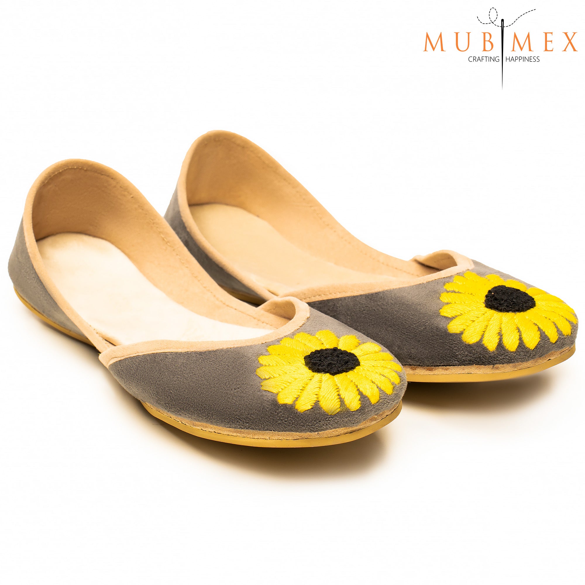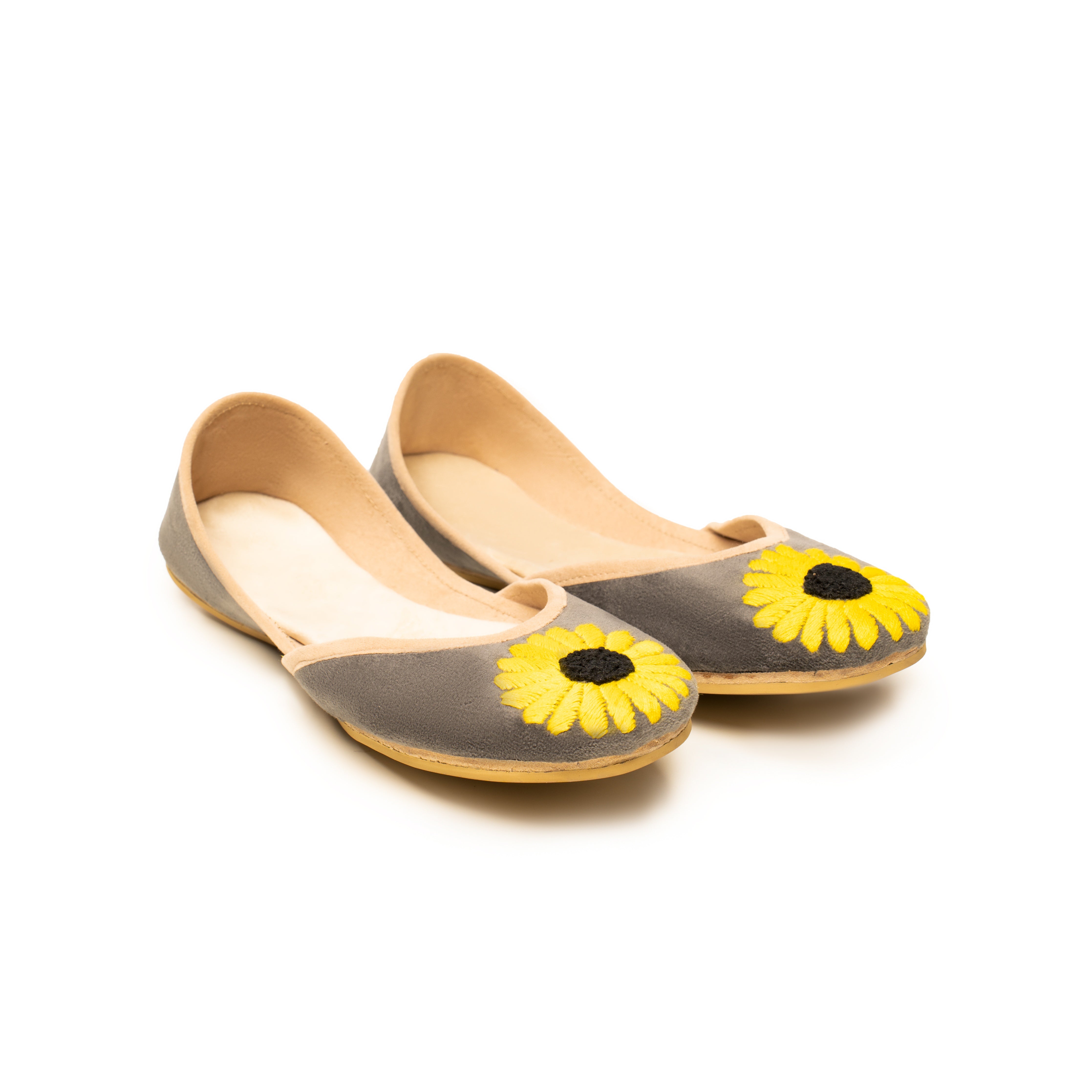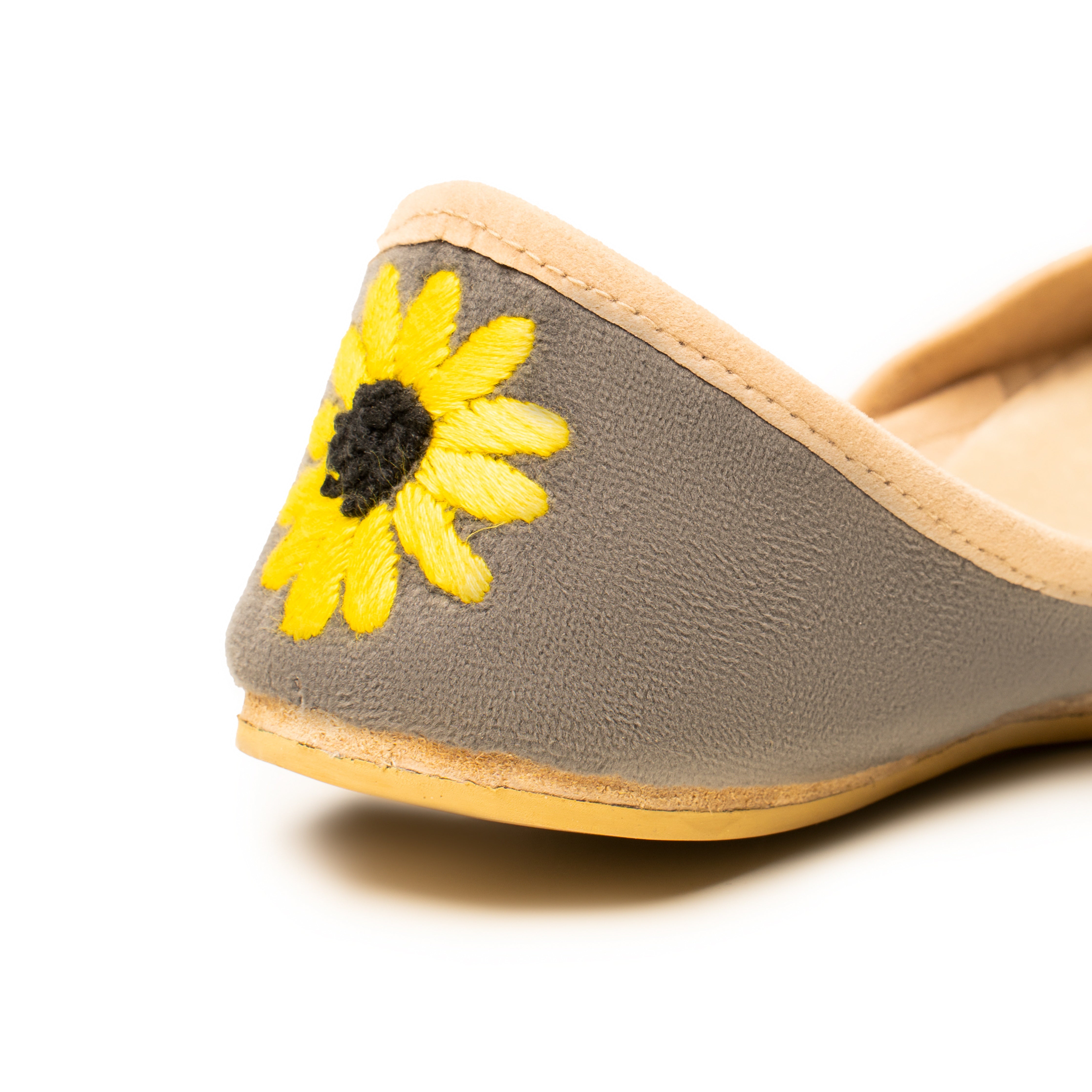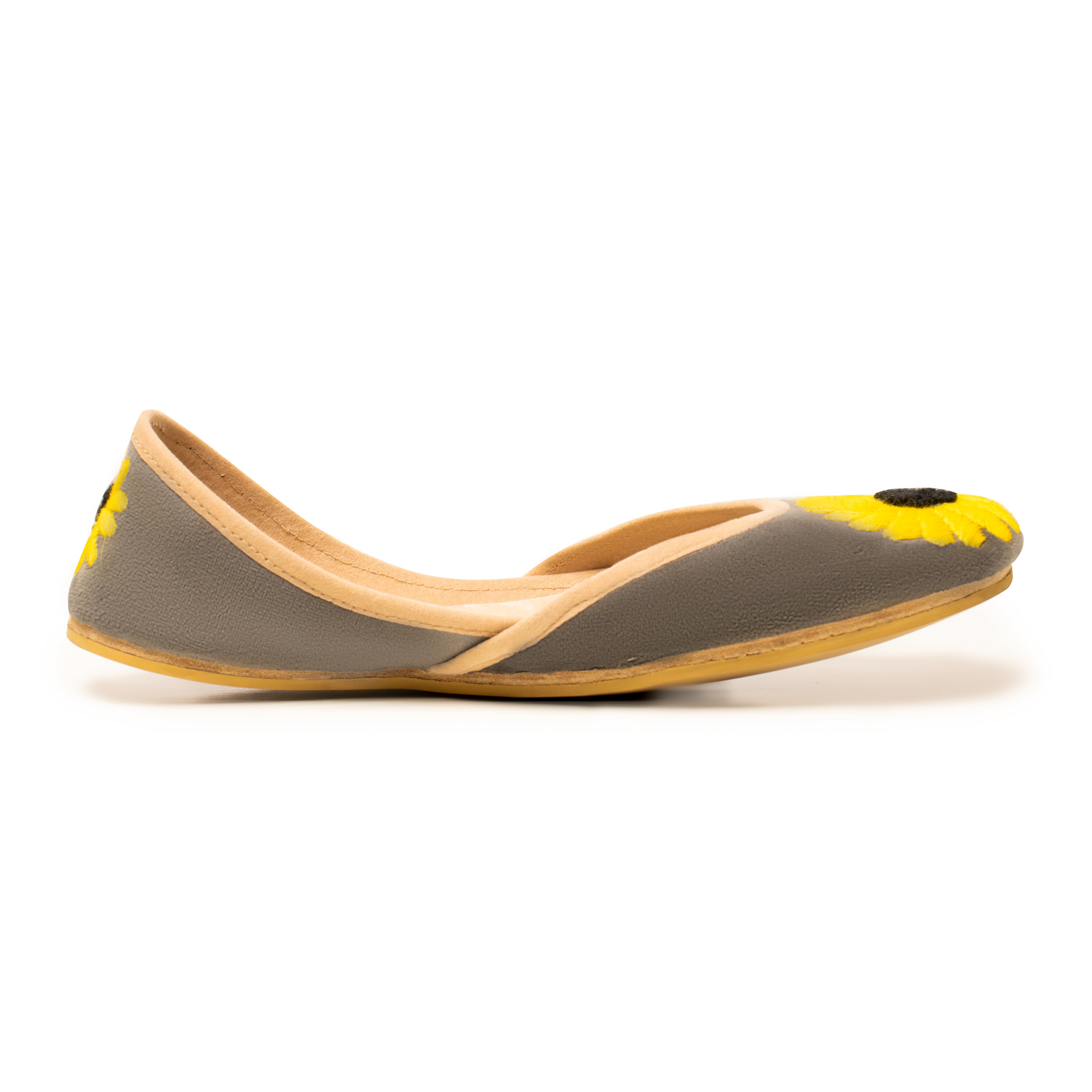 The sunflower design, delicately stitched onto the fabric, brings a touch of whimsy and joy to each step you take. This exquisite combination combines the timeless elegance of handcrafted embroidery with the modern allure of a neutral grey color palette. The intricate detailing of the sunflower petals and vibrant yellow hues radiating the energy of a golden sun on a grey base create a captivating visual masterpiece that will turn heads and evoke admiration. Indulge in the luxurious feel of hand embroidery, a testament to the dedication and skill of our artisans who spend multiple hours handcrafting this visual masterpiece. Whether strolling through a sunny garden, meeting friends for a casual outing, or adding a unique twist to your everyday ensemble, Sun Bloom will effortlessly complement any outfit with a floral elegance.
