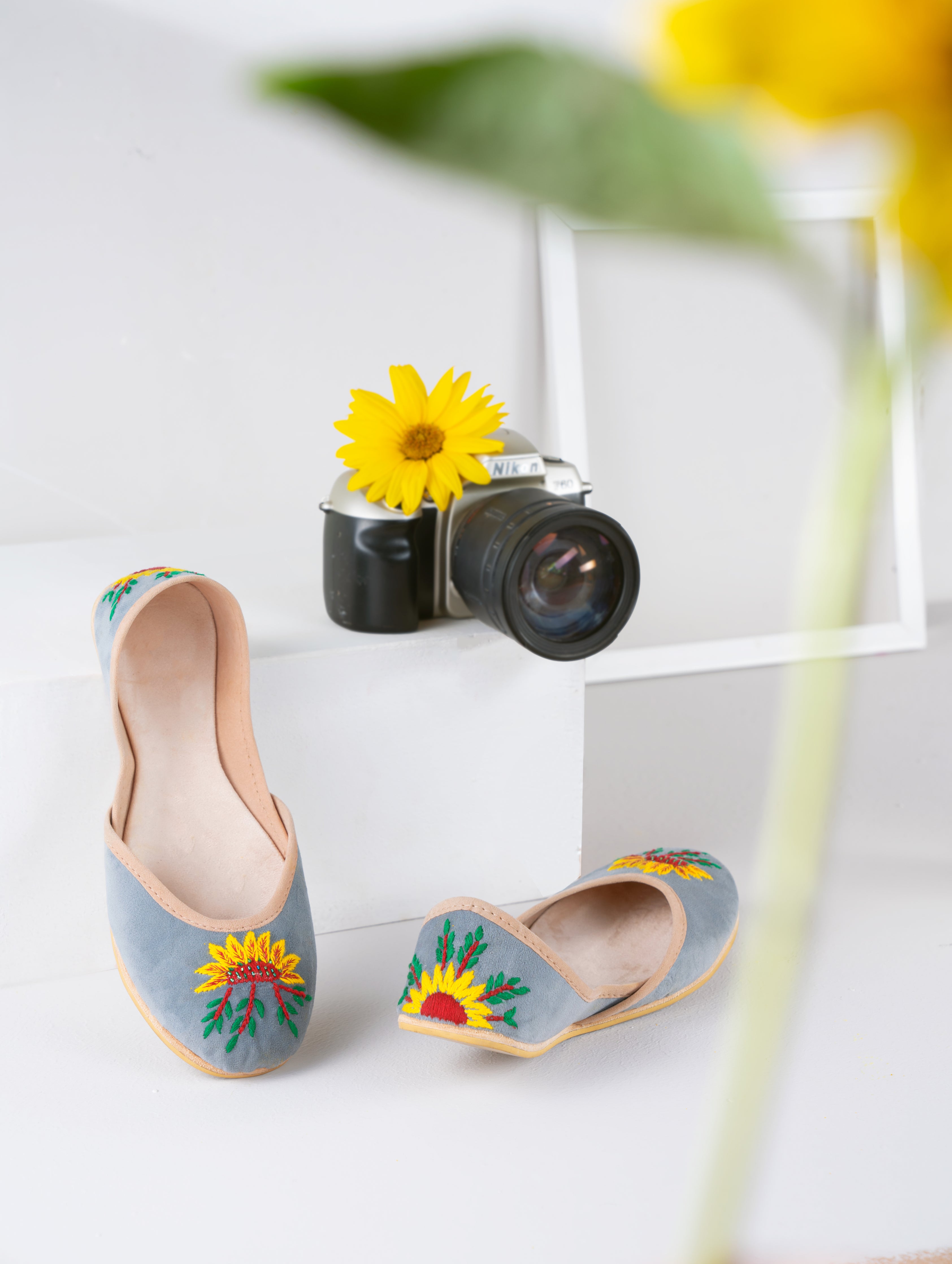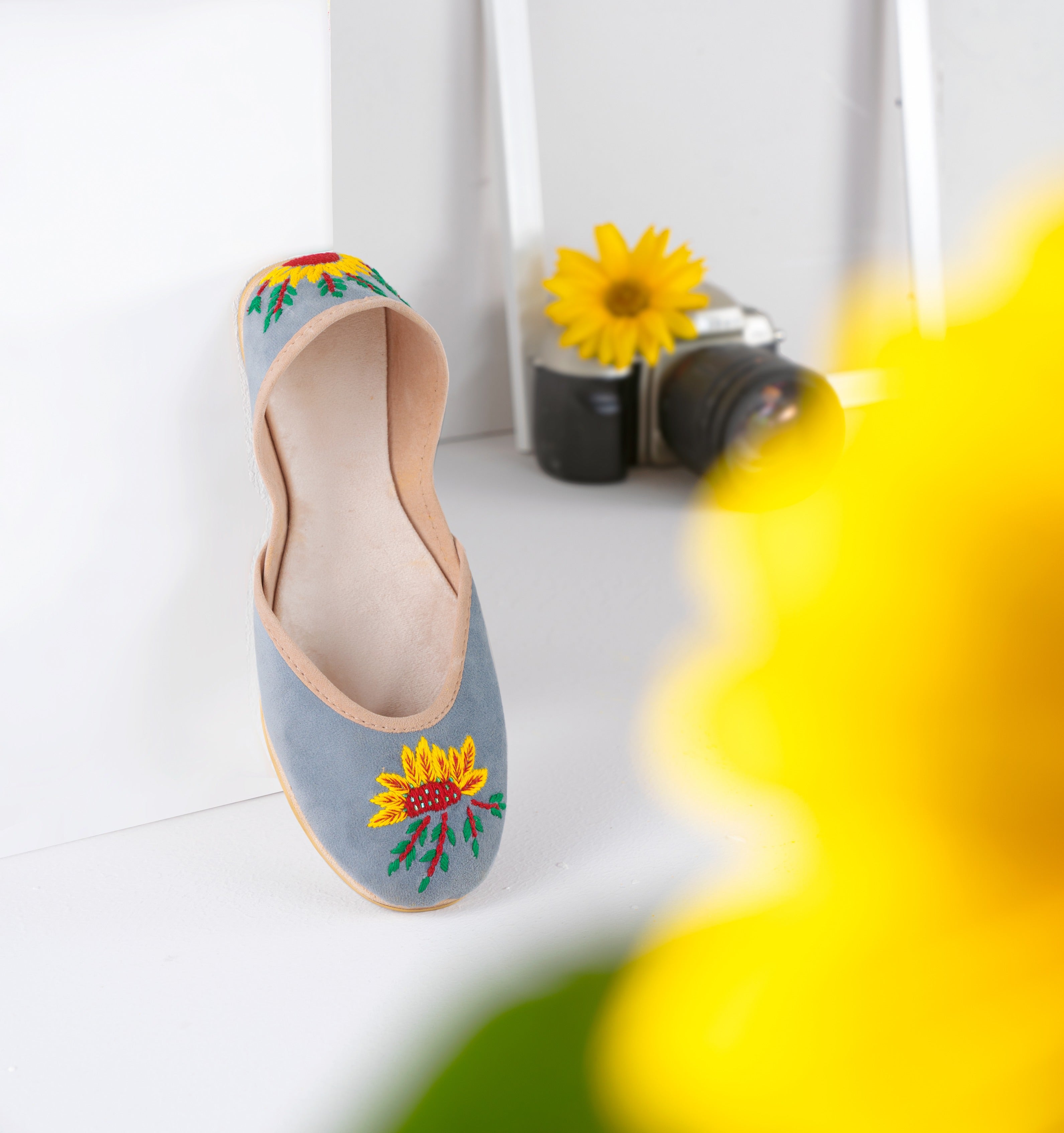 The exquisite details of these khussas are immediately apparent, even from a distance. The vibrant sunflower motif is delicately hand-embroidered using the finest threads, creating a stunning contrast against the rich sky-blue base. The embroidery work is precise and intricate, with every stitch contributing to the overall beauty and opulence of the design. With their bold, opulent, and composed design, these khussas are sure to turn heads and make a statement wherever you go.
