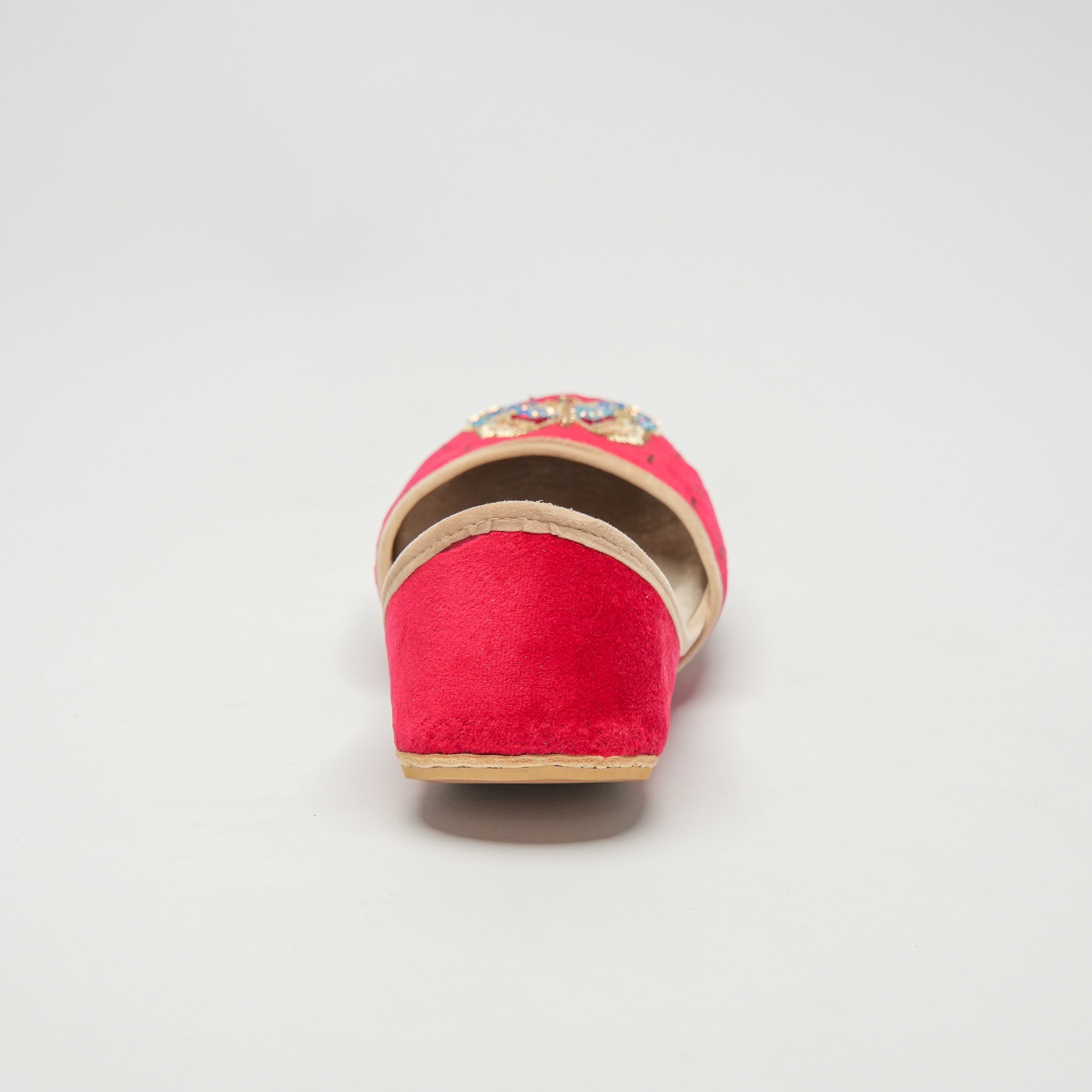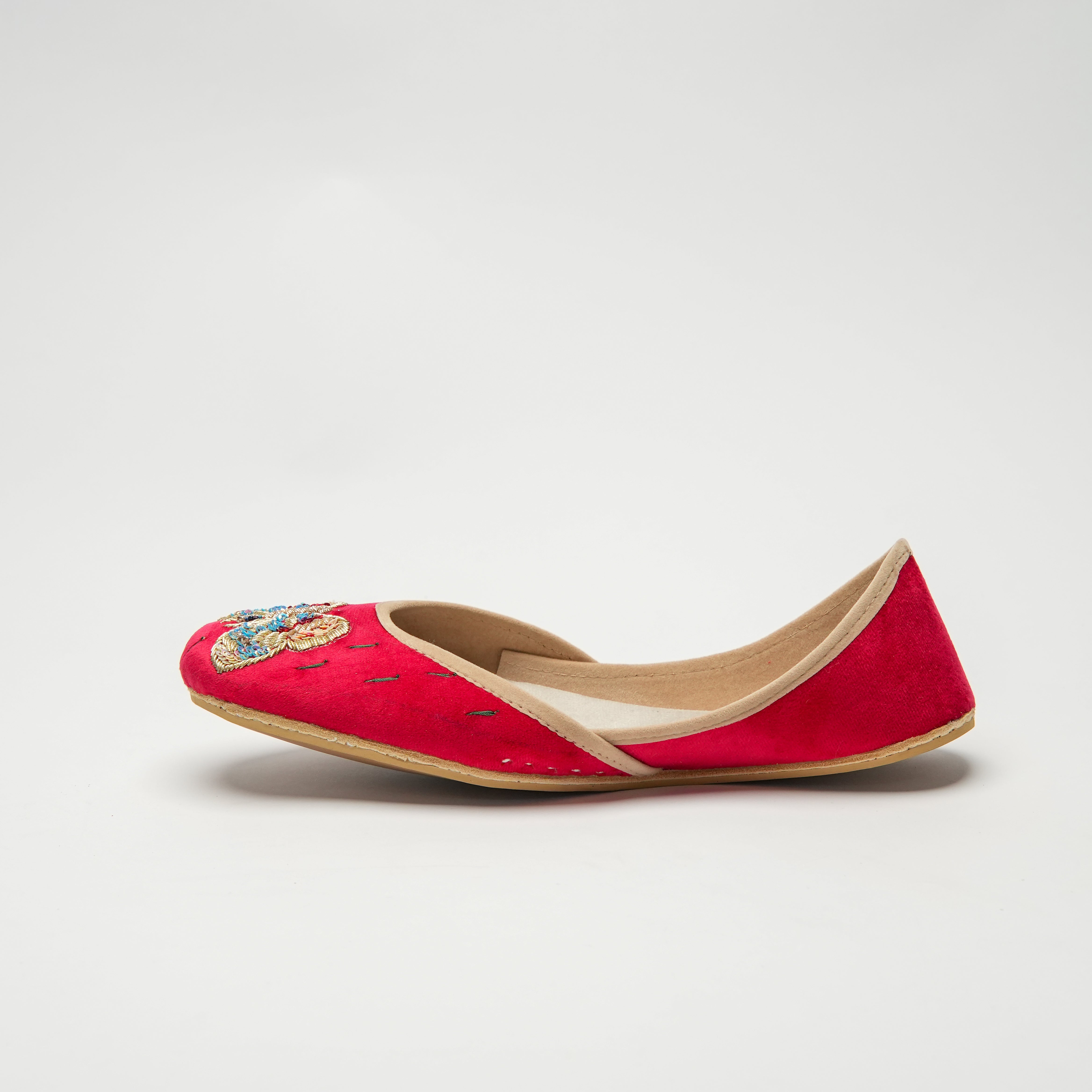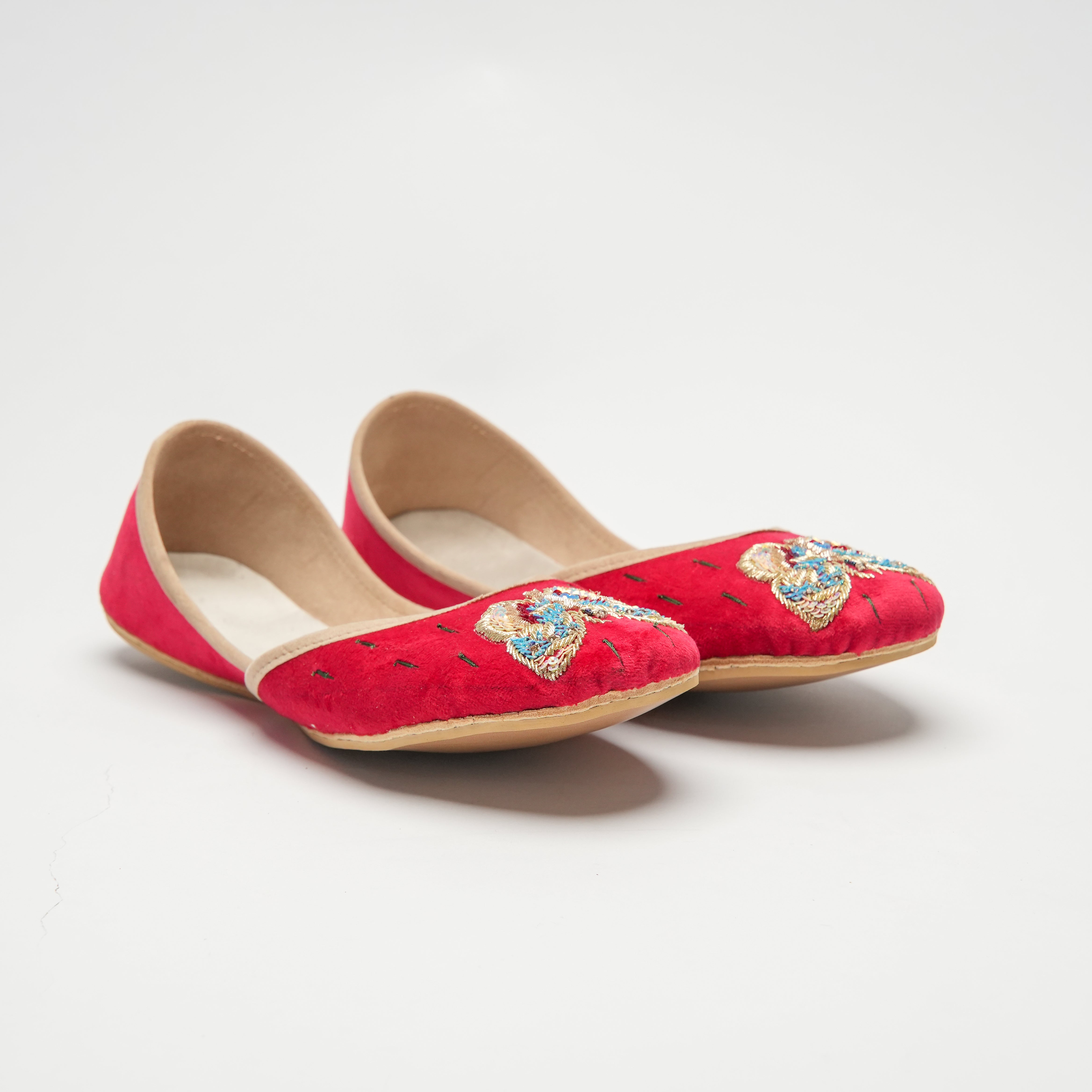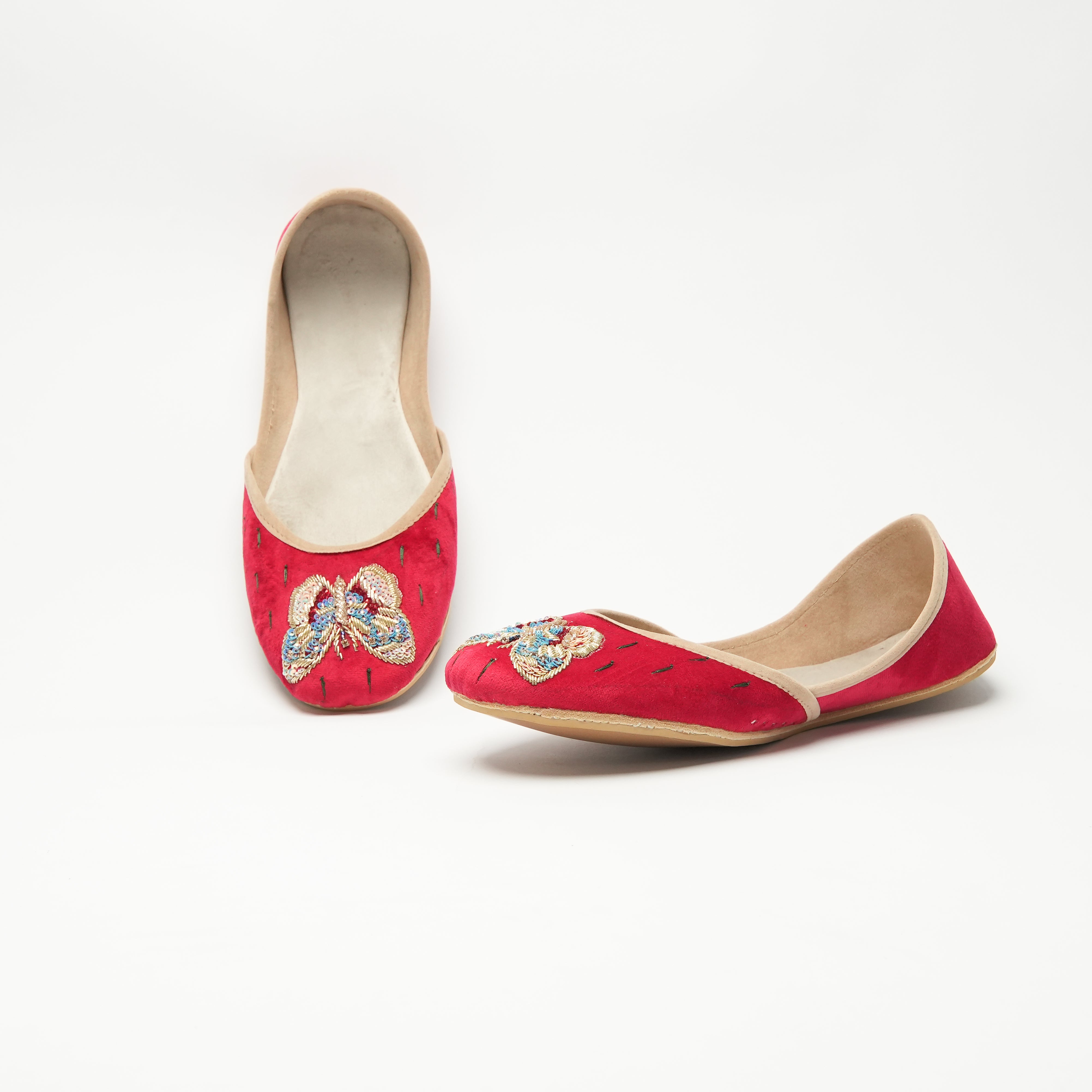 Titli is a statement Khussa with fusion of the traditional Khussa with a modern look to it. Strawberry red velvet base has been used for Titli with one main motif in the middle consisting of a butterfly. Our craftsman focused on the butterfly by using a number of embellishment techniques to adorn it. Golden Zari work has been done to shape the body of the butterfly with golden sequences used on the edges of the wings. Irredecent sequins has been used in the wings to represent how colorful butterflies can be.