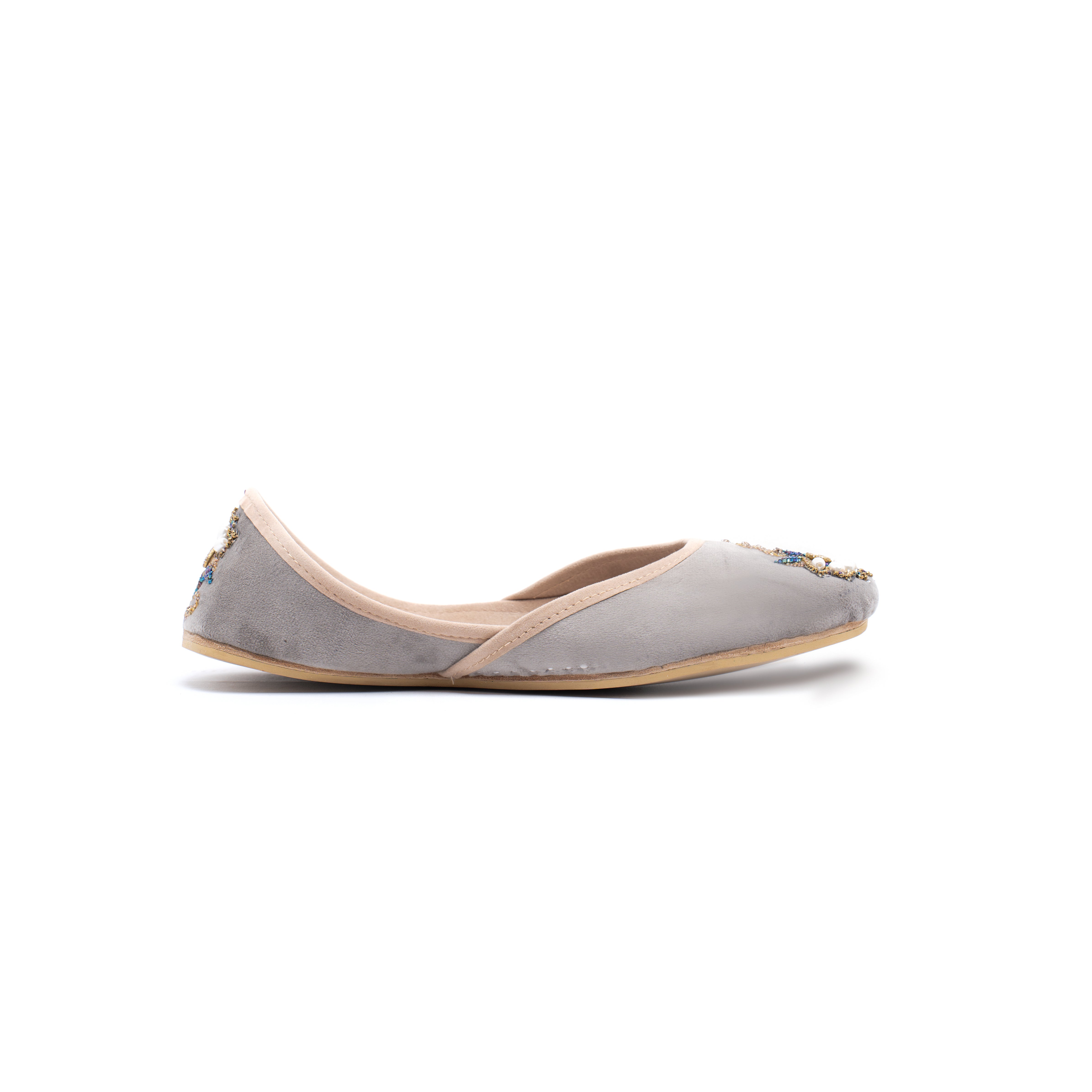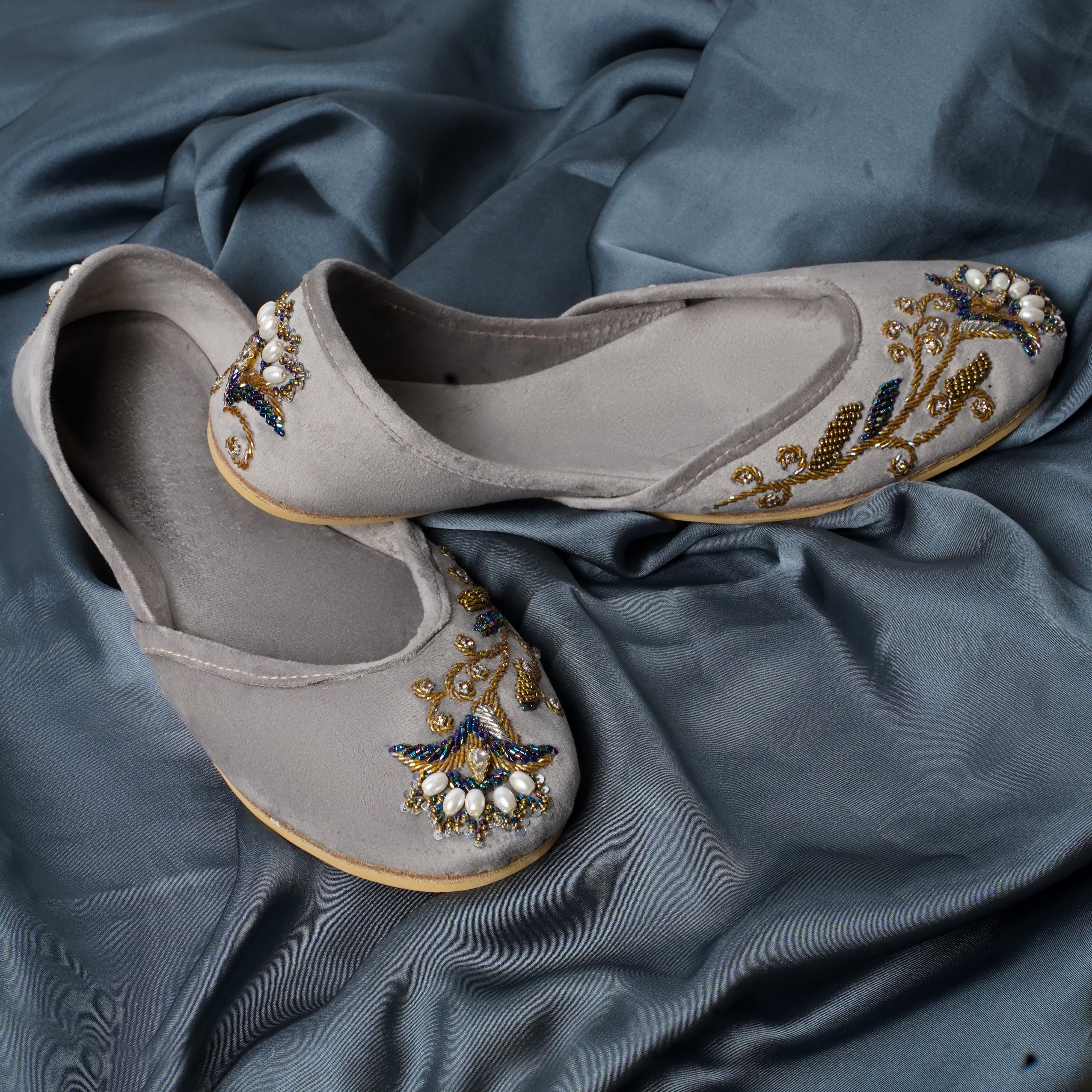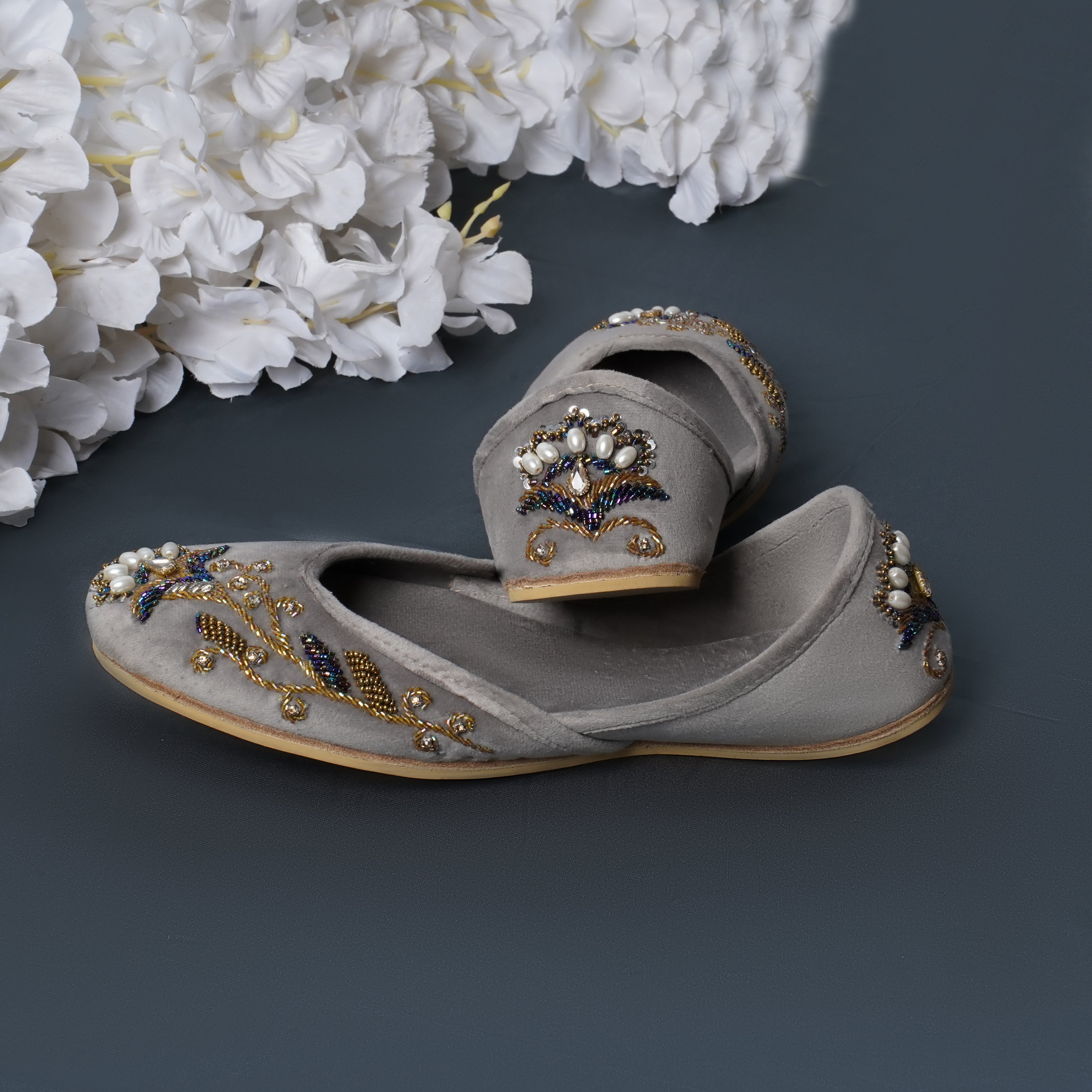 Chambeli is an elegant Khussa consisting of a lighter grey velvet base adorned in an asymmetrical floral  design. Golden Zari work has been done to create a vine of leafs with one flower in the middle of the Khussa. Beads in the shade of deep purple, midnight blue, forest green, turquoise, light pink and golden have been used all over the design along with bigger oval shaped white pearl beads to represent the petals. Sequins work has also been done on the ends of the petals to add to the blossomed flower look..