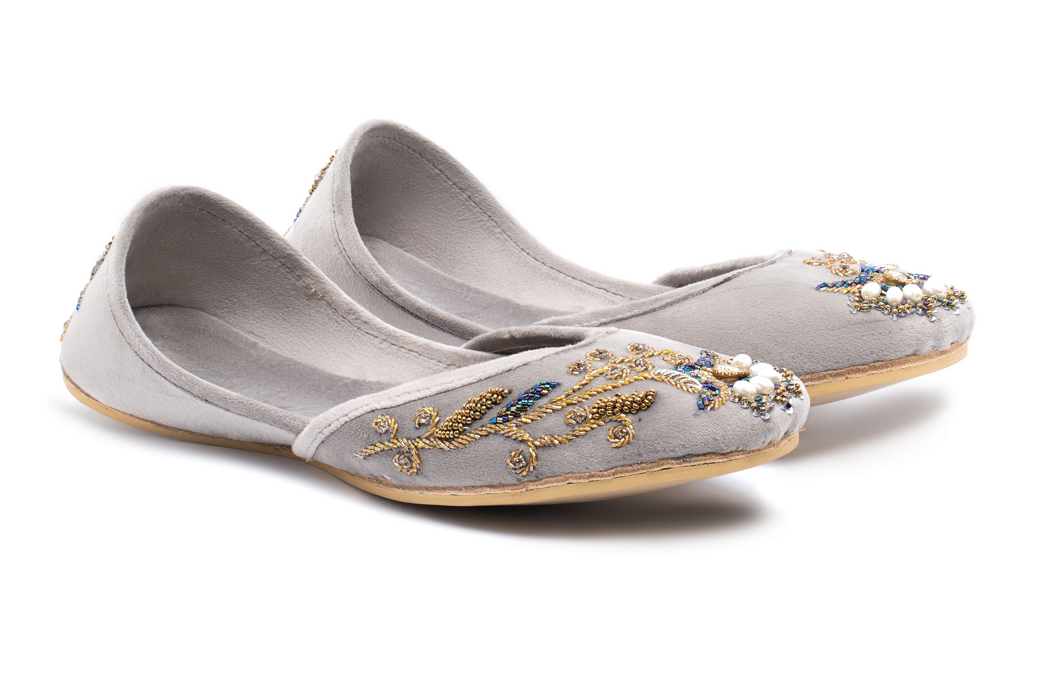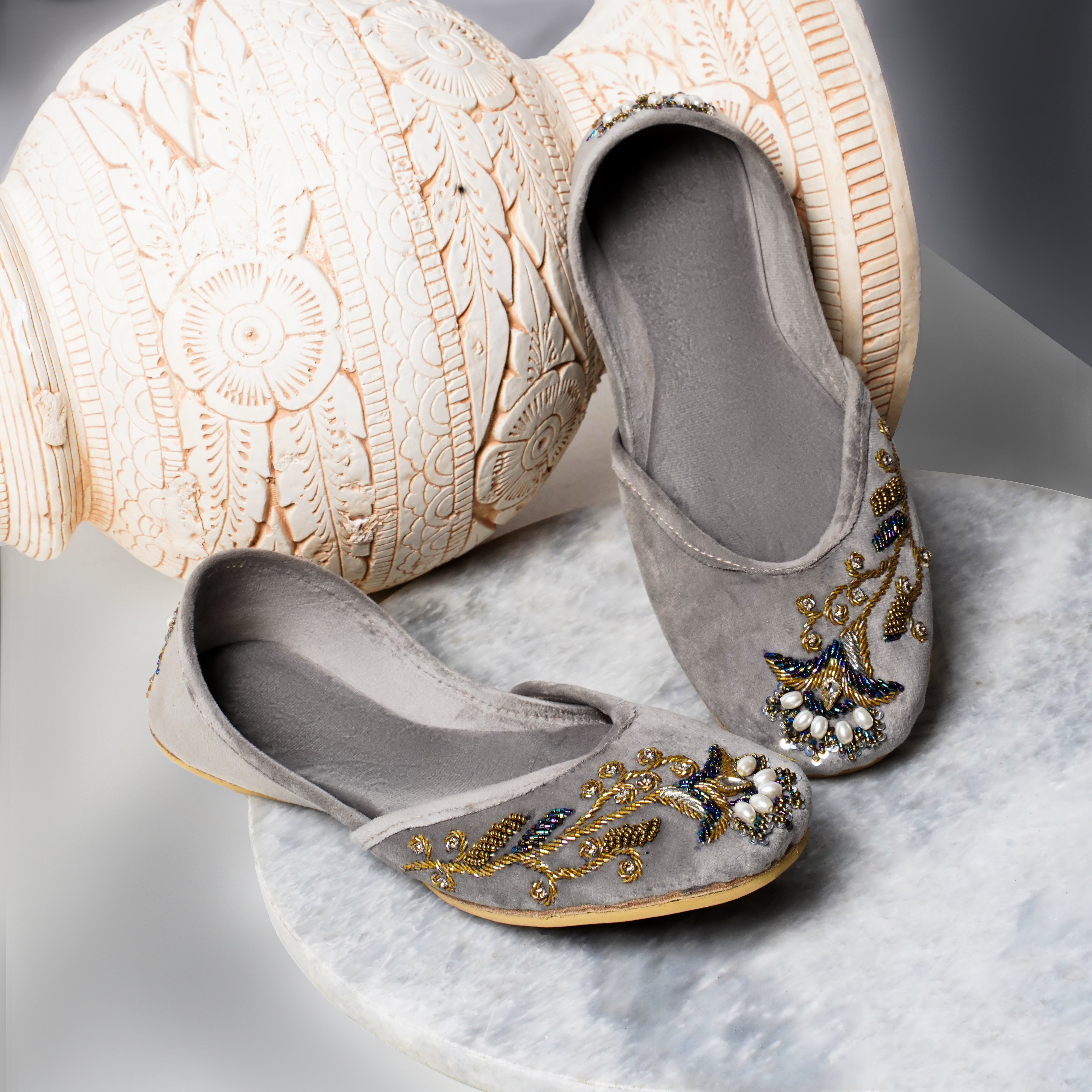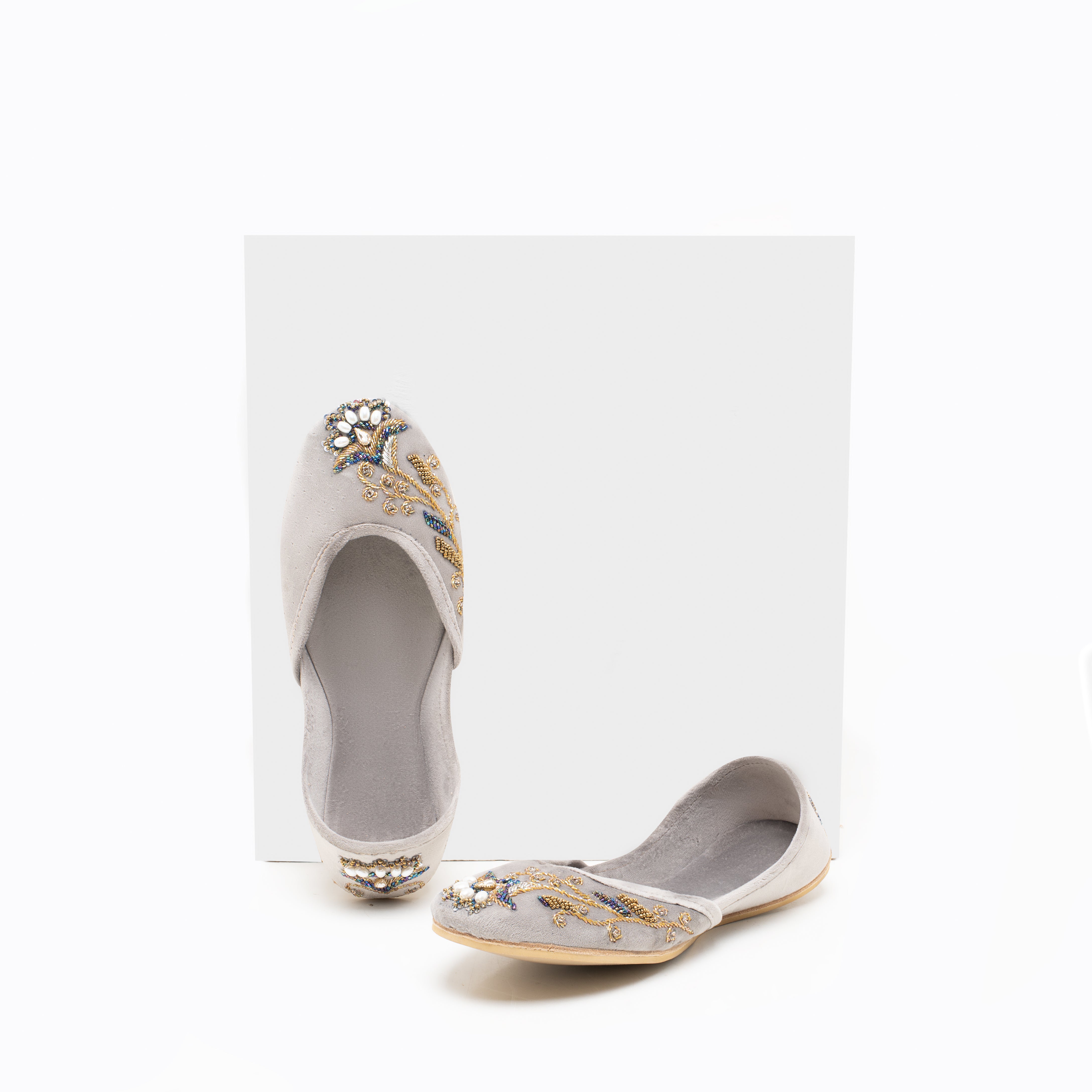 Chambeli is an elegant Khussa consisting of a lighter grey velvet base adorned in an asymmetrical floral  design. Golden Zari work has been done to create a vine of leafs with one flower in the middle of the Khussa. Beads in the shade of deep purple, midnight blue, forest green, turquoise, light pink and golden have been used all over the design along with bigger oval shaped white pearl beads to represent the petals. Sequins work has also been done on the ends of the petals to add to the blossomed flower look..