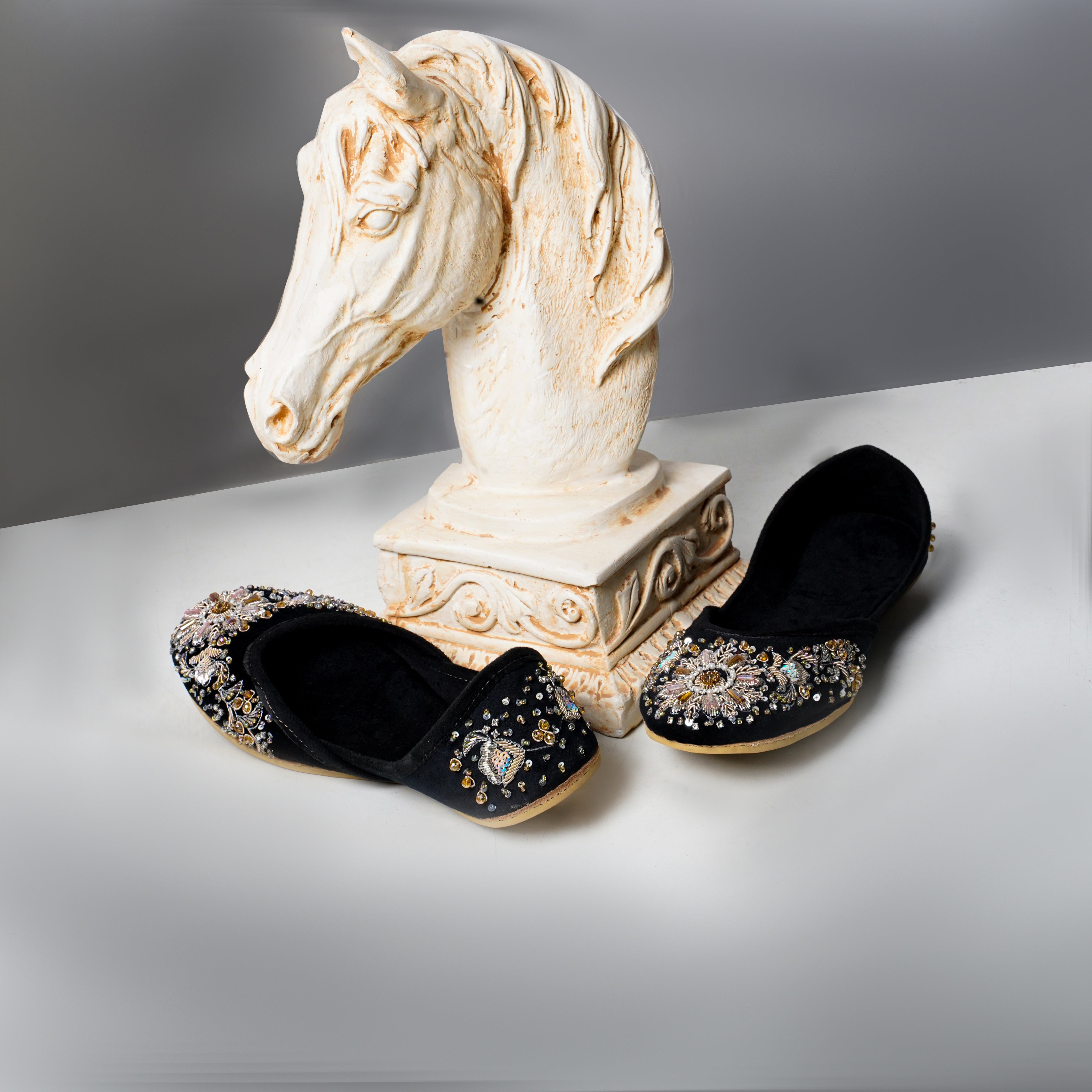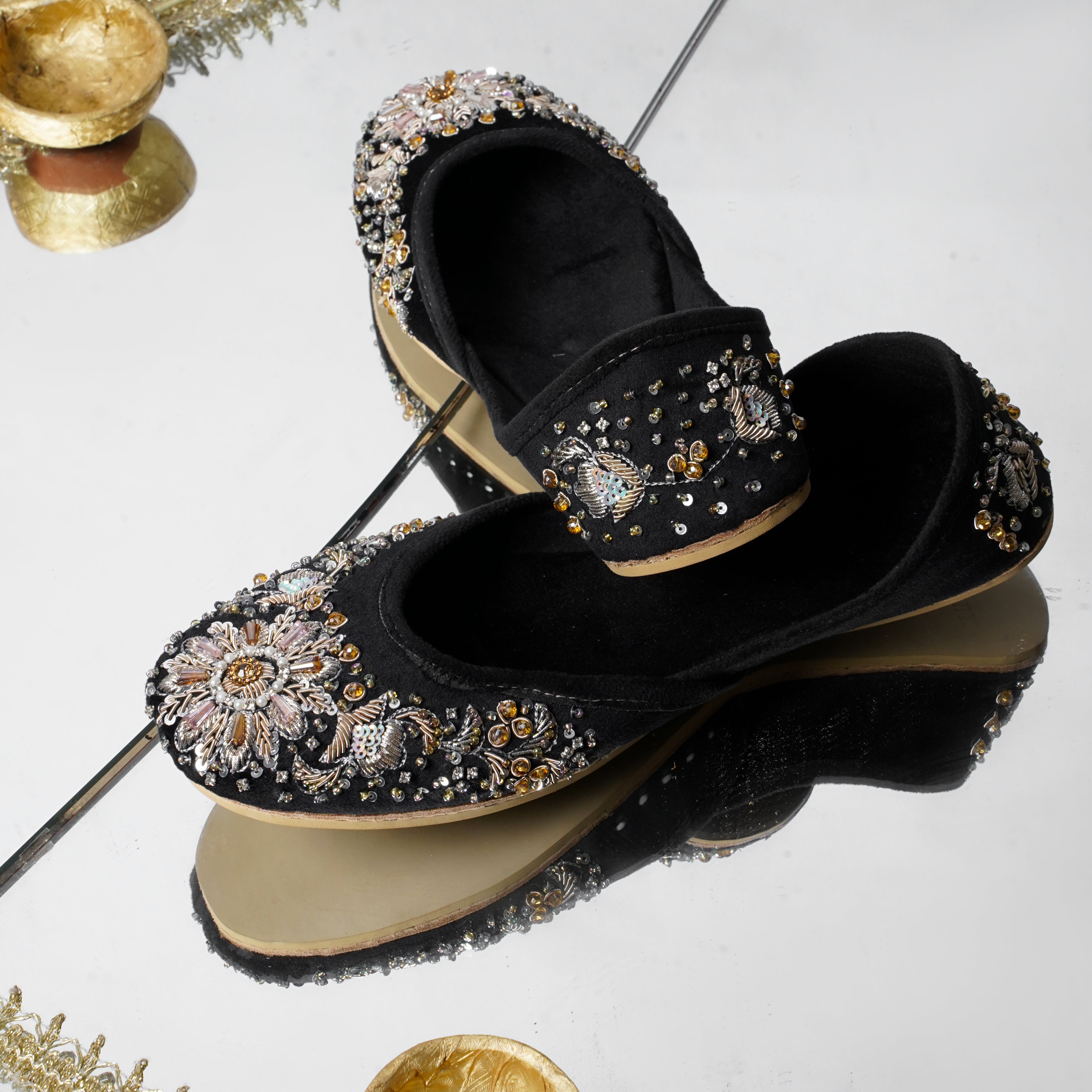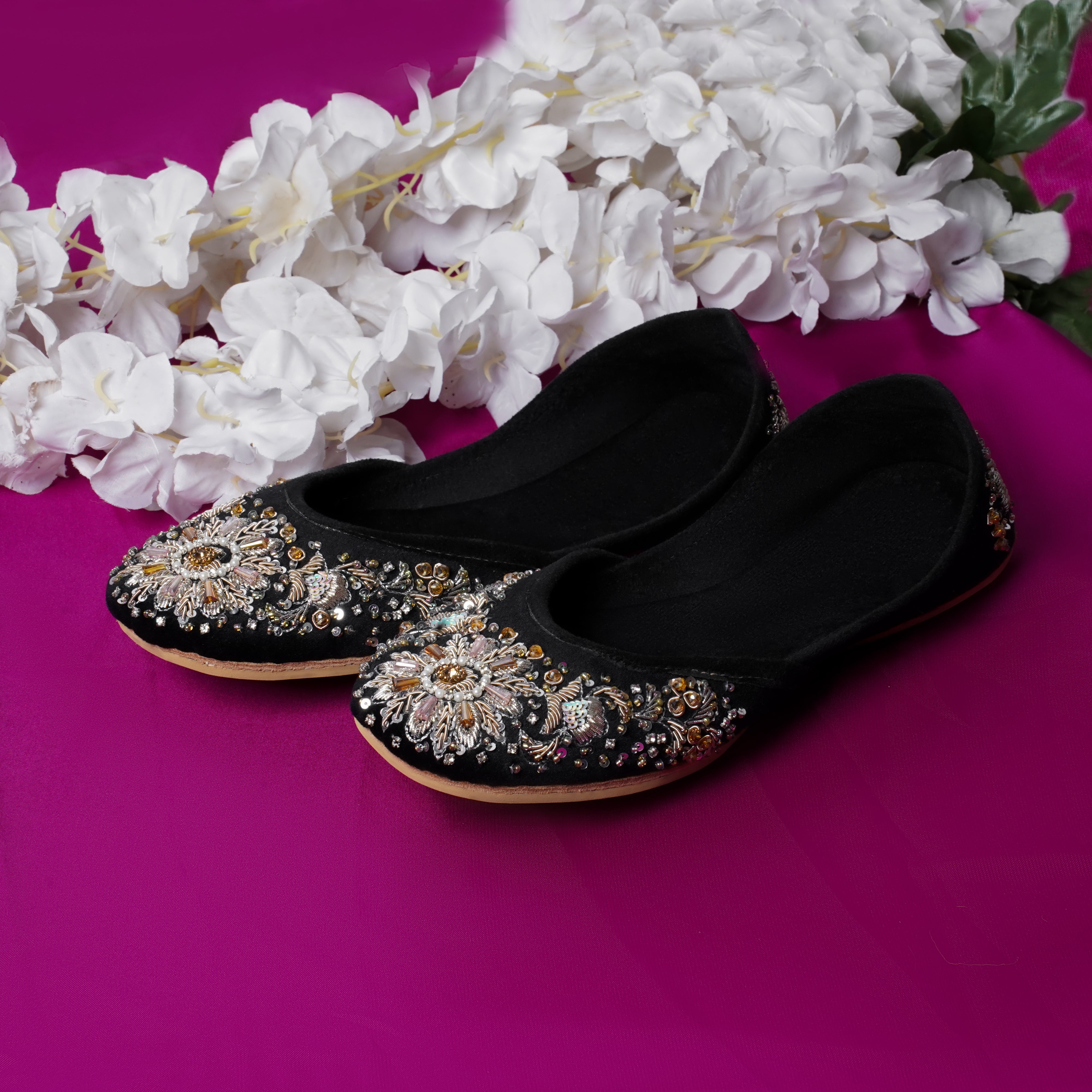 Dil-e-Mehfil is an exquisite handmade floral Khussa consisting of a black velvet base in contrast with the detailed embellishments on it. Dil-e-Mehfil has one main flower in the front of the Khussa consisting of zari work along with beads and sequences in shades of gold, light pink and pearl white. Floral vines are skillfully embellished in a similar zari, and bead work along with iridescent sequences to add to the royal look of the Khussa.