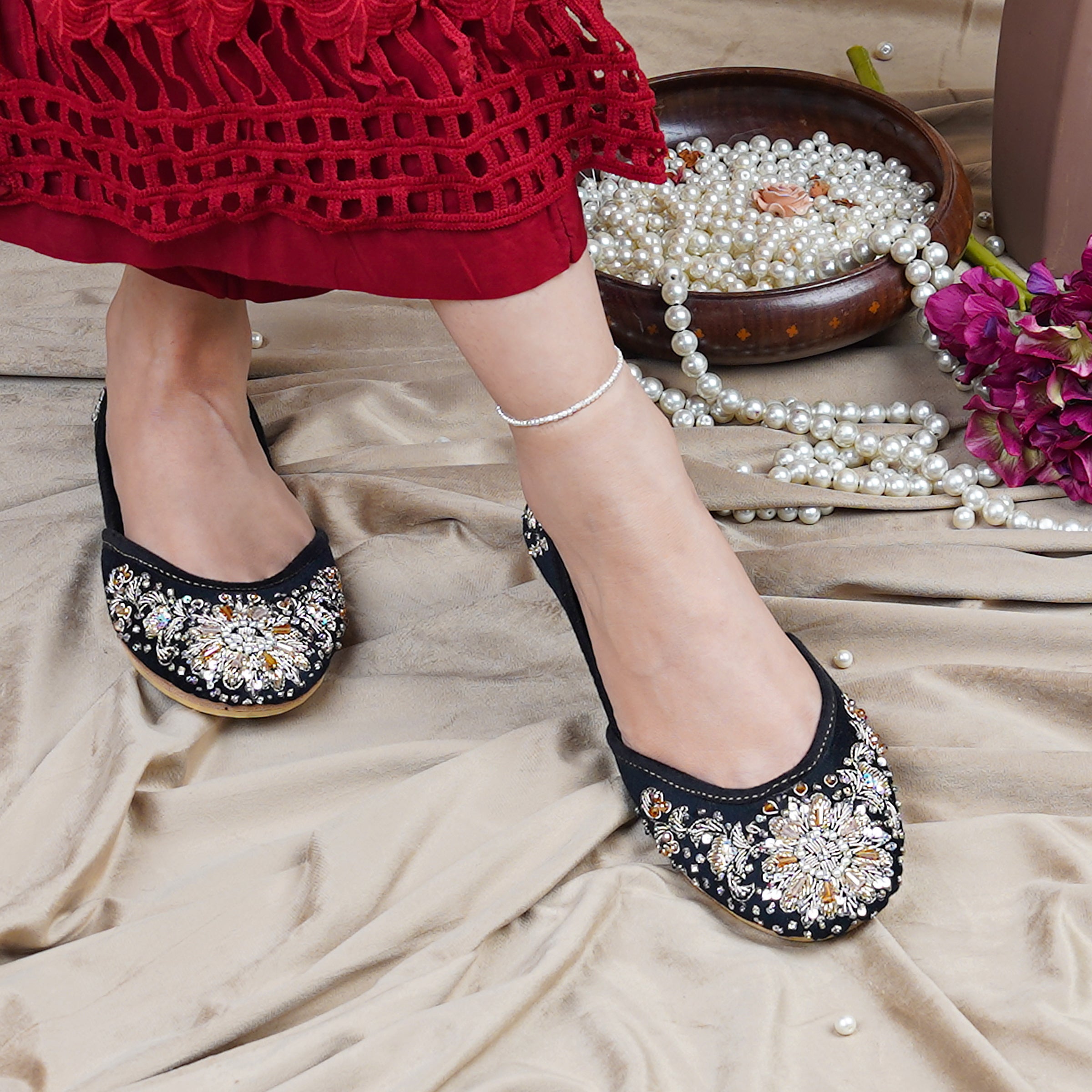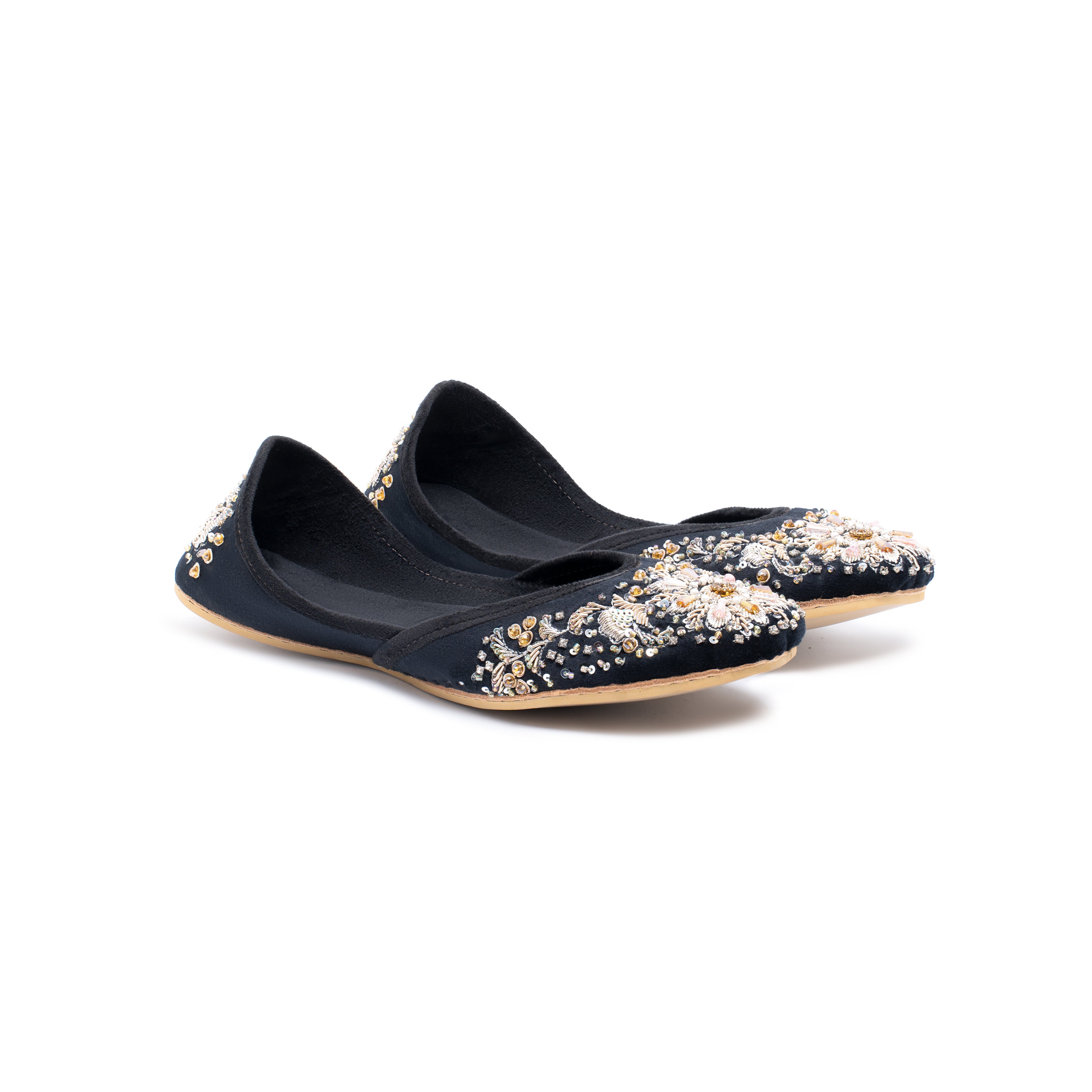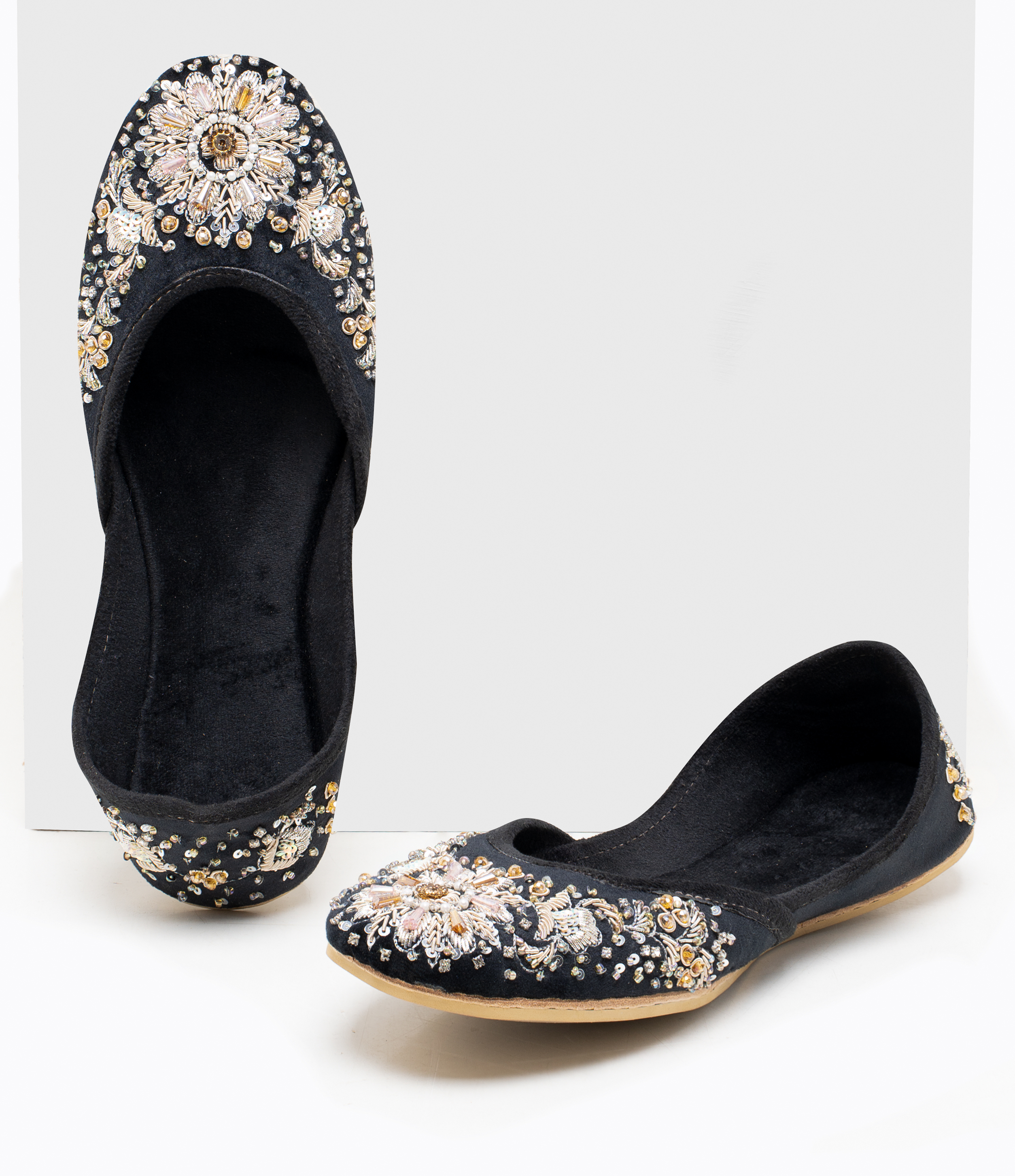 Dil-e-Mehfil is an exquisite handmade floral Khussa consisting of a black velvet base in contrast with the detailed embellishments on it. Dil-e-Mehfil has one main flower in the front of the Khussa consisting of zari work along with beads and sequences in shades of gold, light pink and pearl white. Floral vines are skillfully embellished in a similar zari, and bead work along with iridescent sequences to add to the royal look of the Khussa.