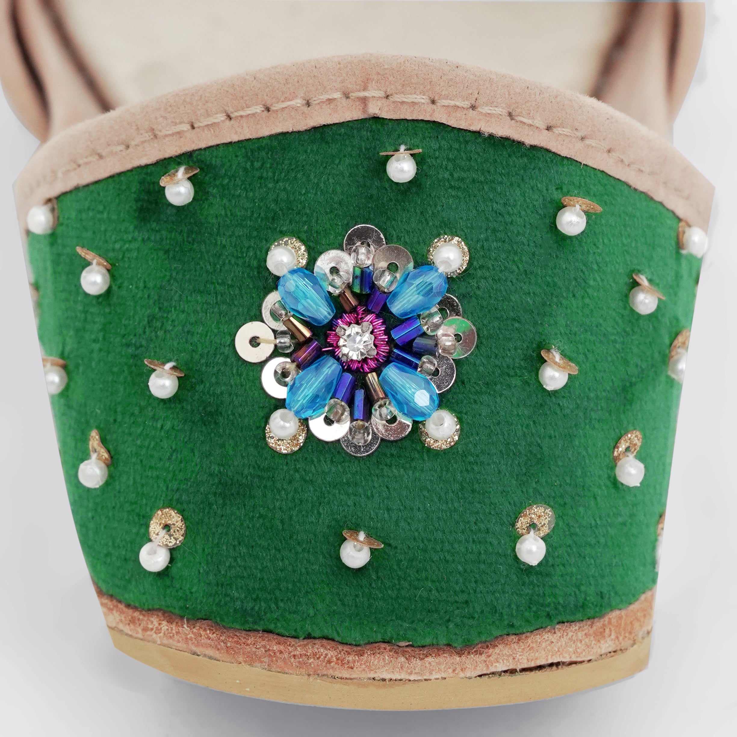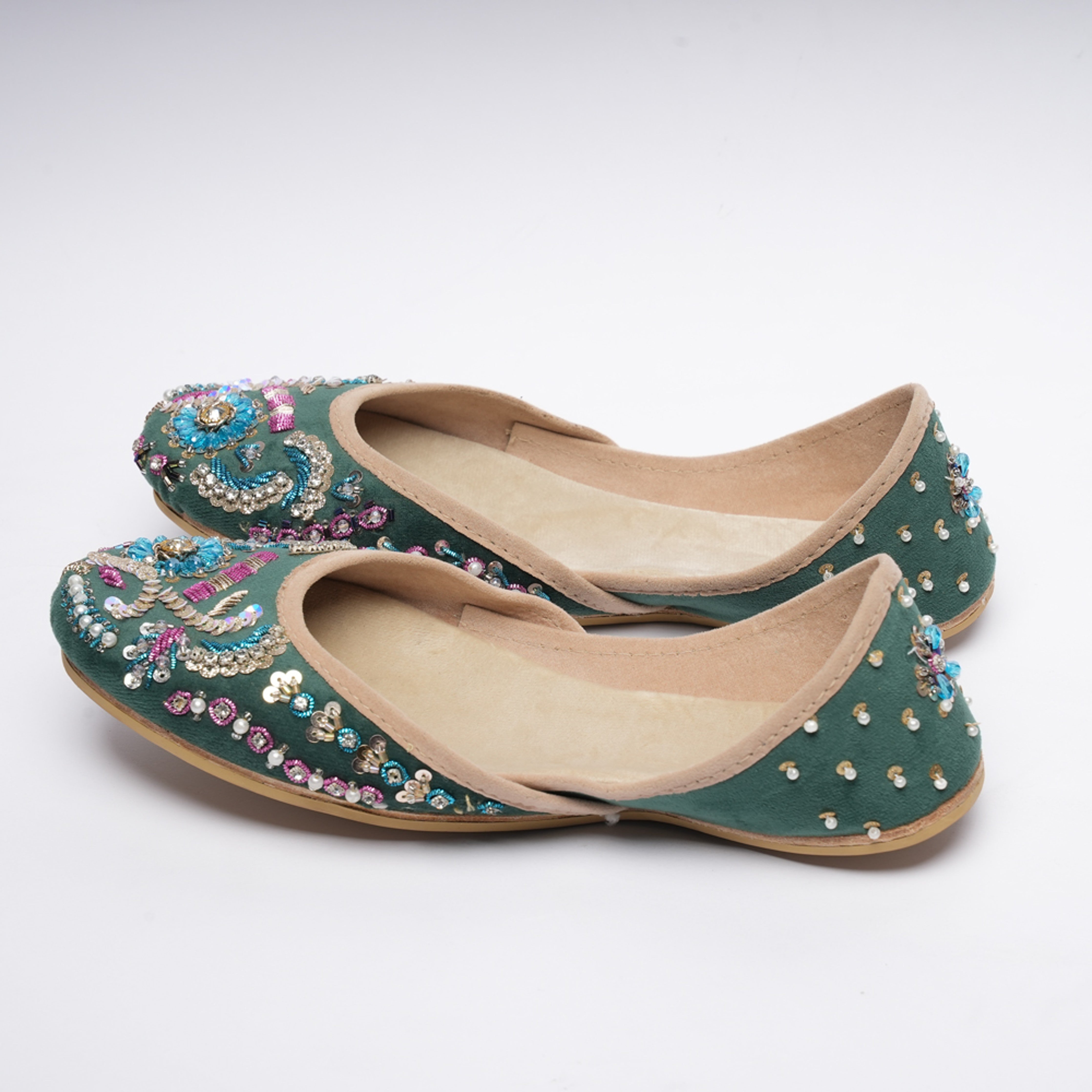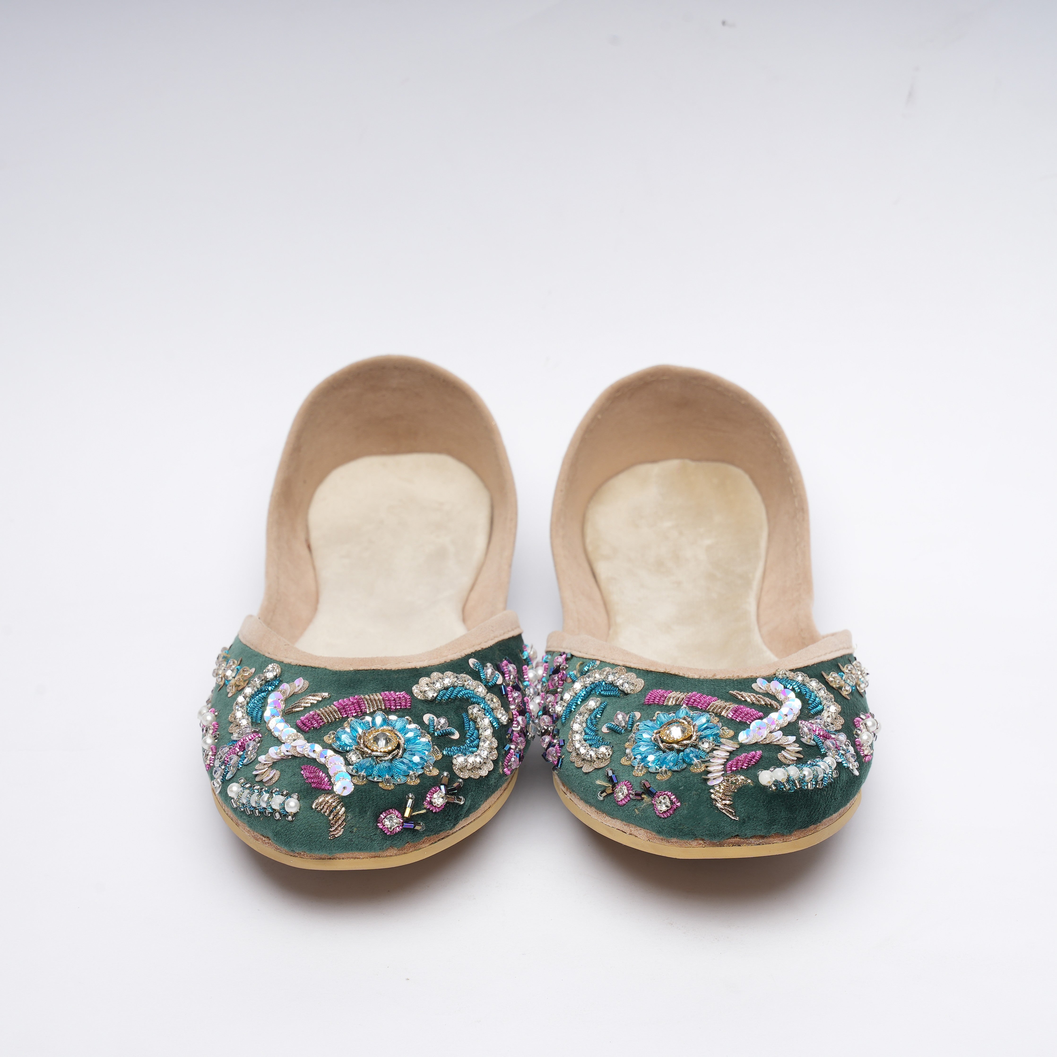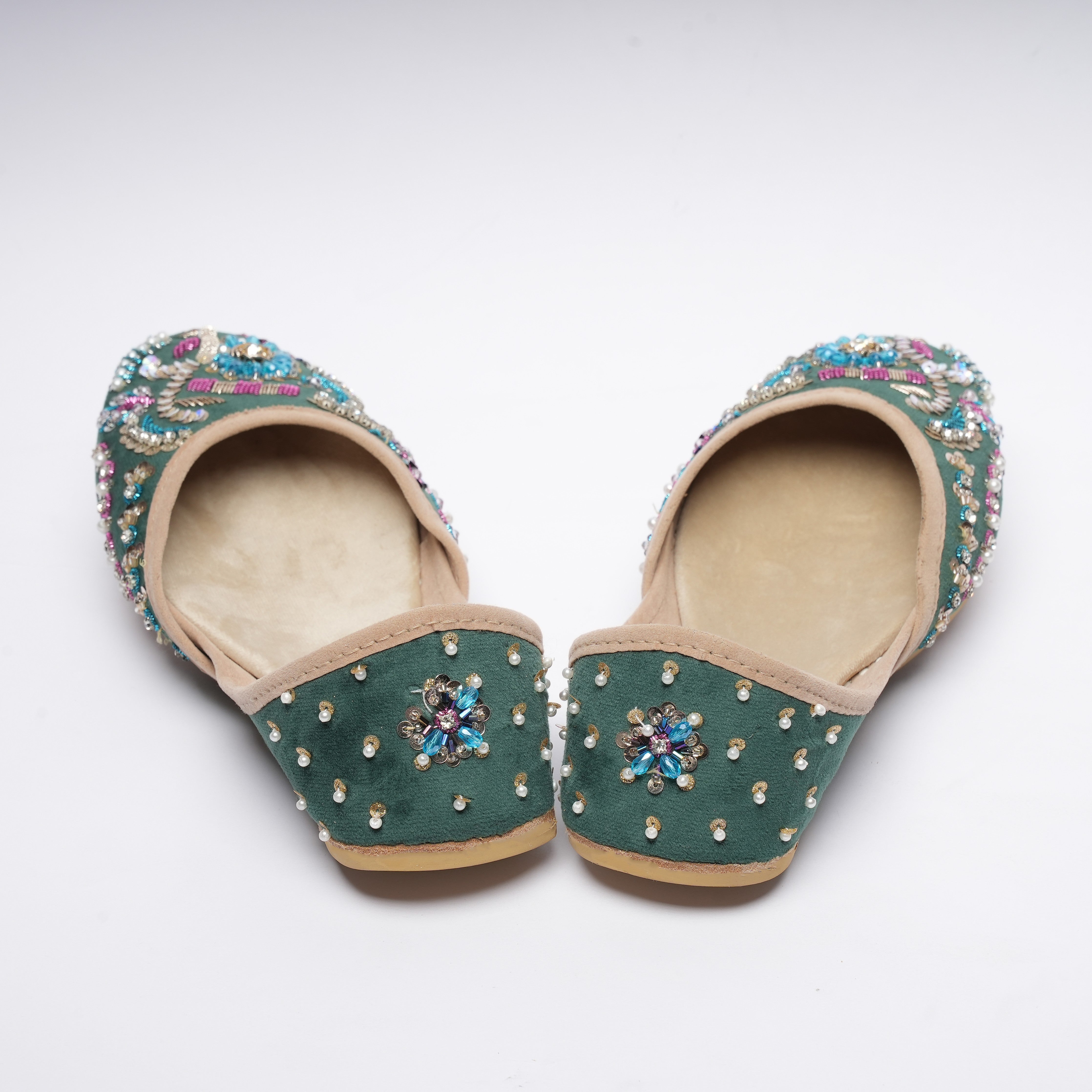Heer is a fresh forest green Khussa embellished with beaded sequins work all over it. Floral vines in the front of the Khussa are adding to the forest vibe with bead and sequins work along with stones. White, blue and pink colors perfectly compliment the forest green velvet base. Our team of Craftsmen spent over 40 hours designing and crafting this piece for you to enjoy.