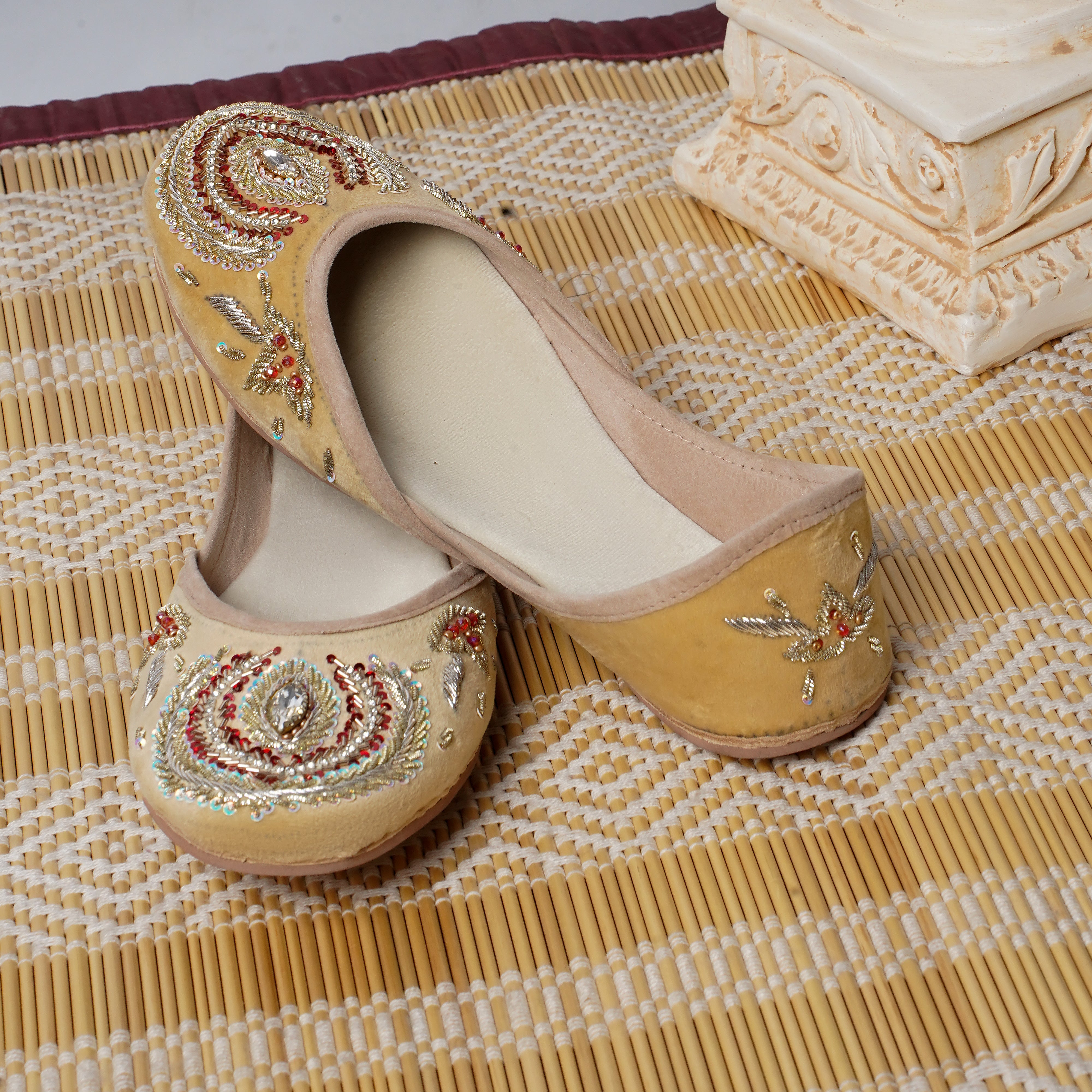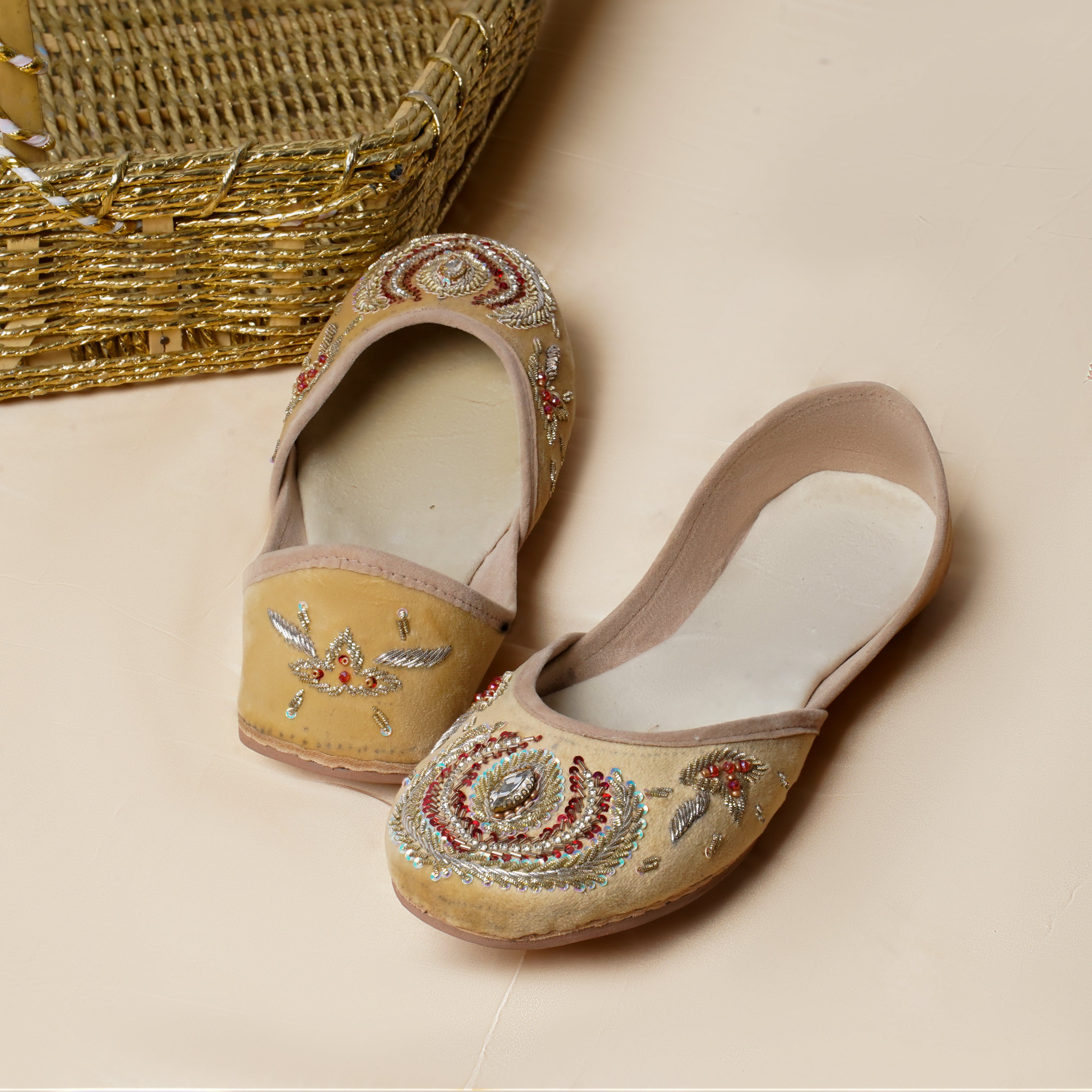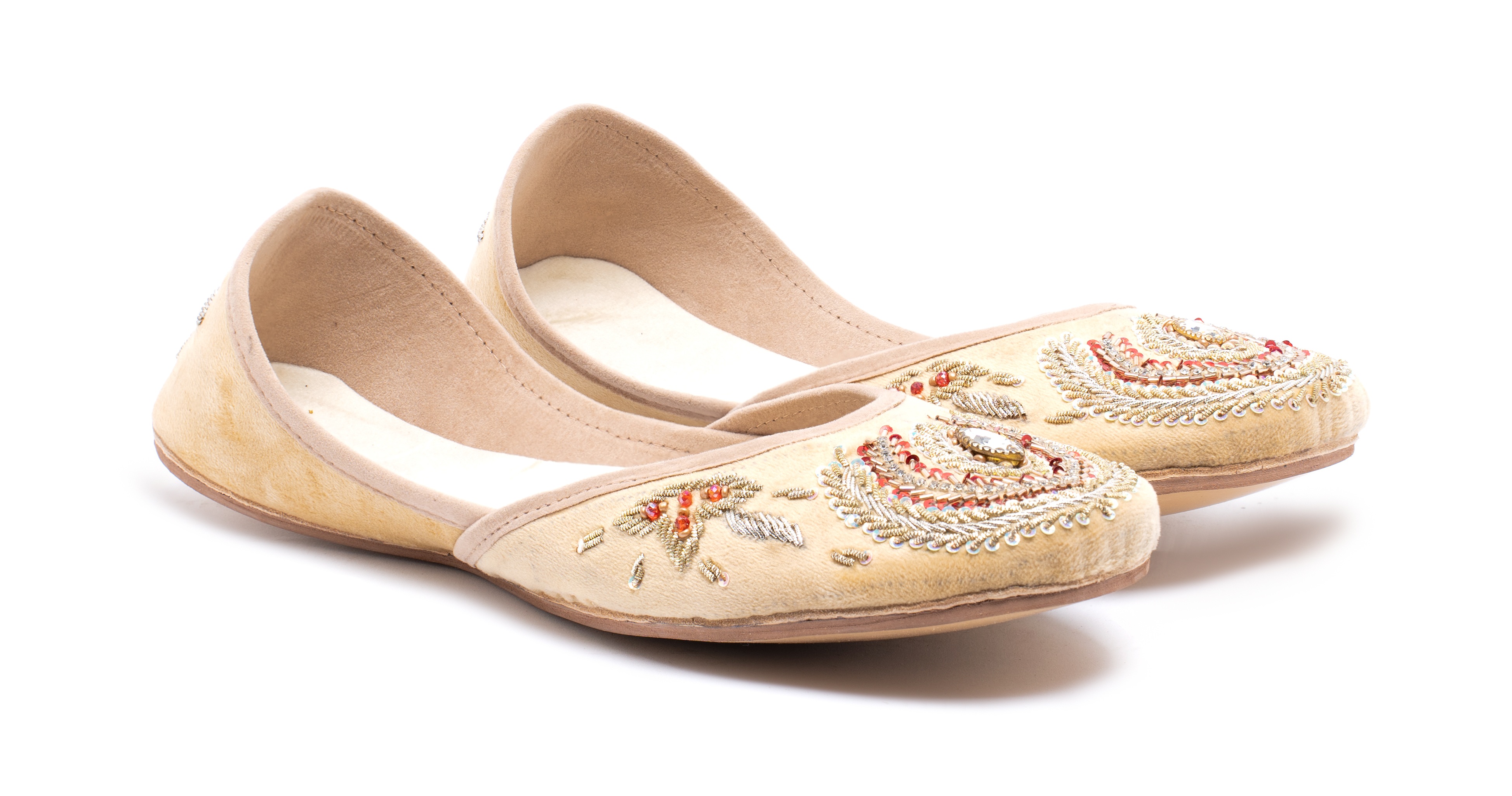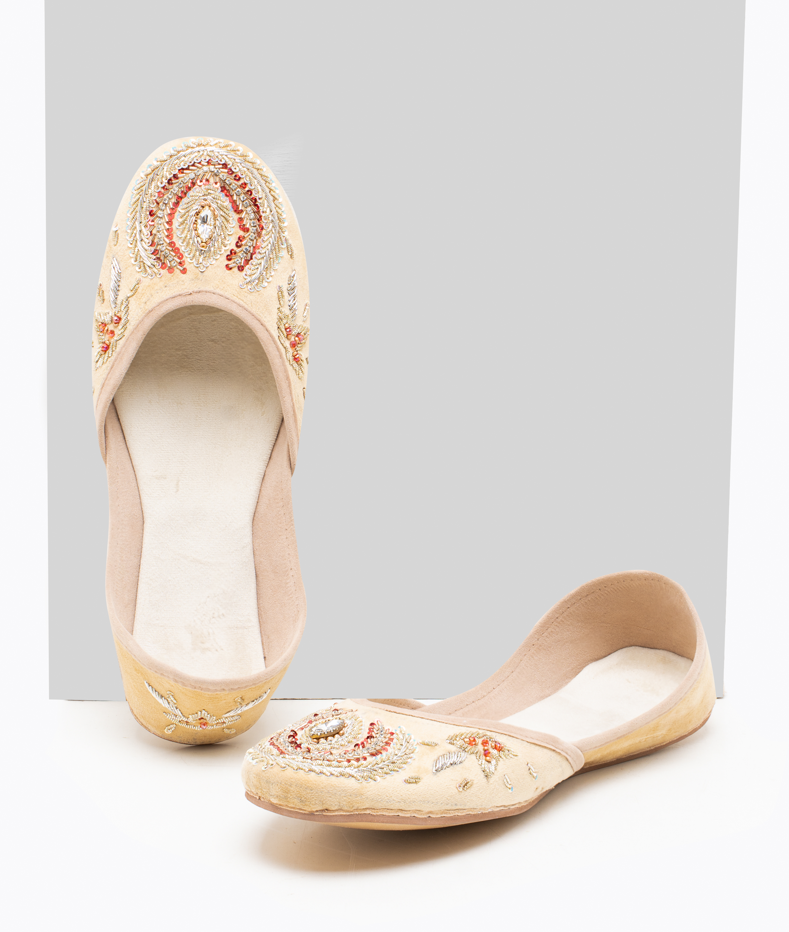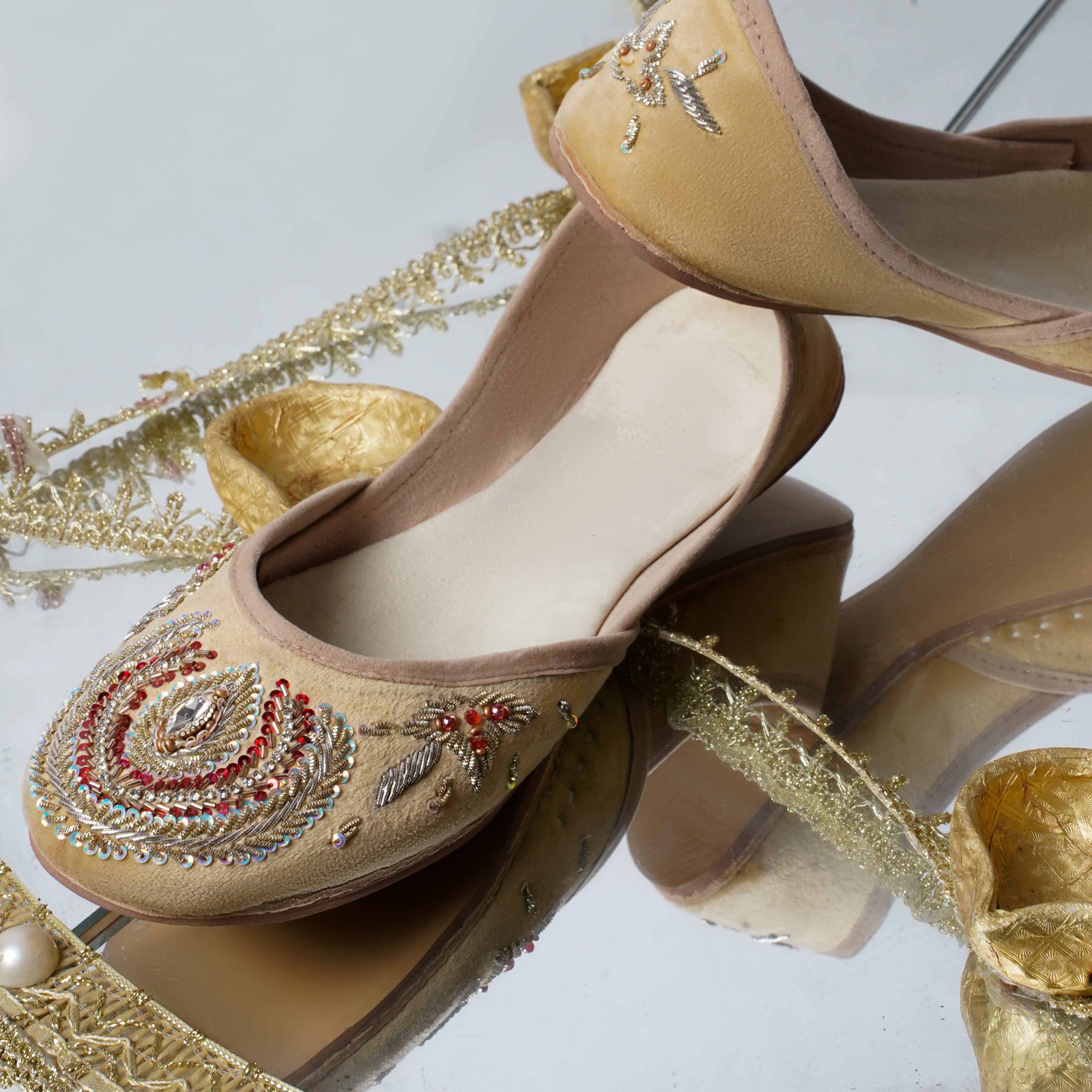 Alamgir is a Mughal art inspired handcrafted Khussa made on a cream toned velvet base. Neutral colors have been used in the embellishments along with  sequence work in a bold yet complementary shade of vermillion red. Tilla work has been done in bright gold, copper and white gold shades for the main motif  along with stone work and bead work in silver. Alamgir is made up of a neutral color scheme and advanced craft techniques to capture the essence of the Mughal era.