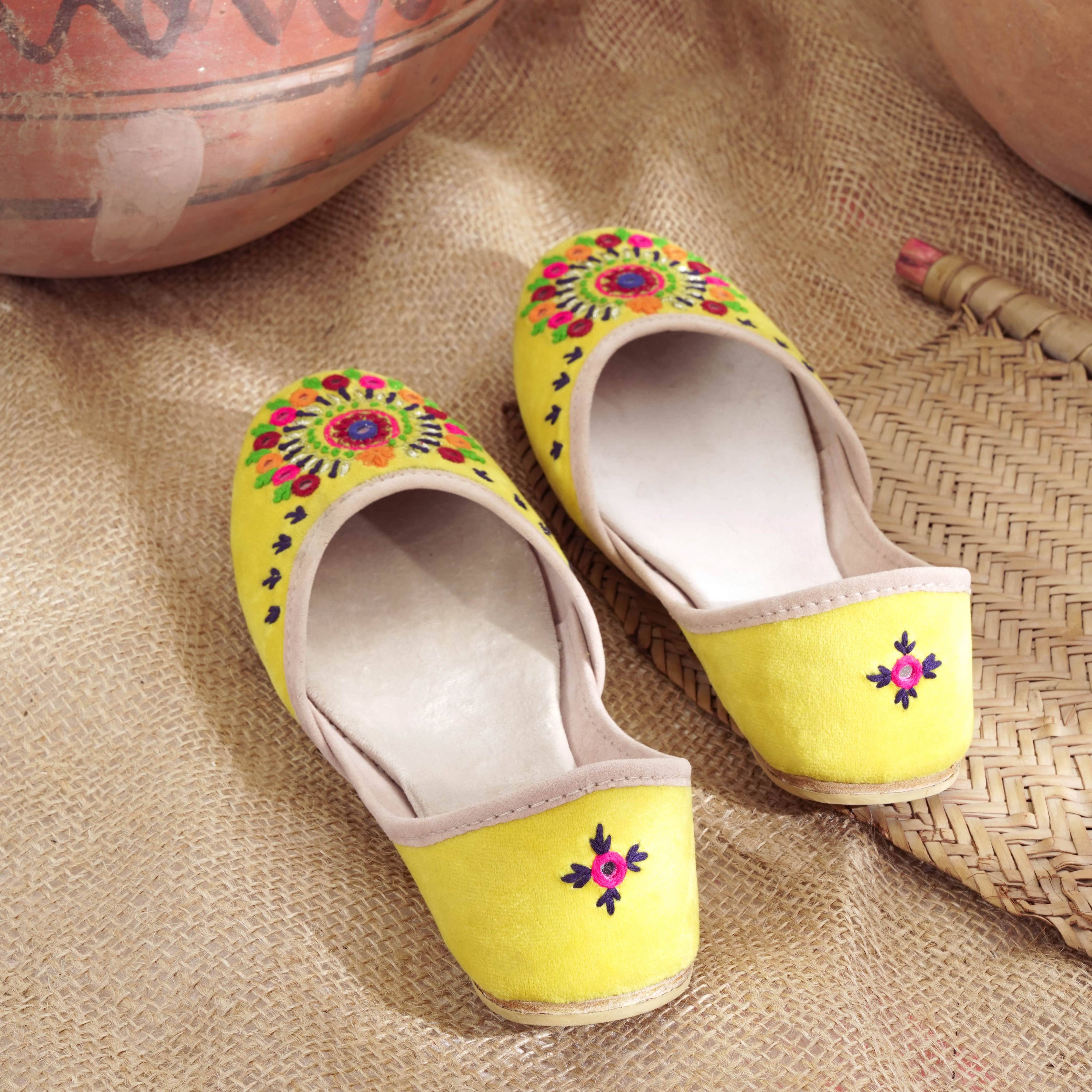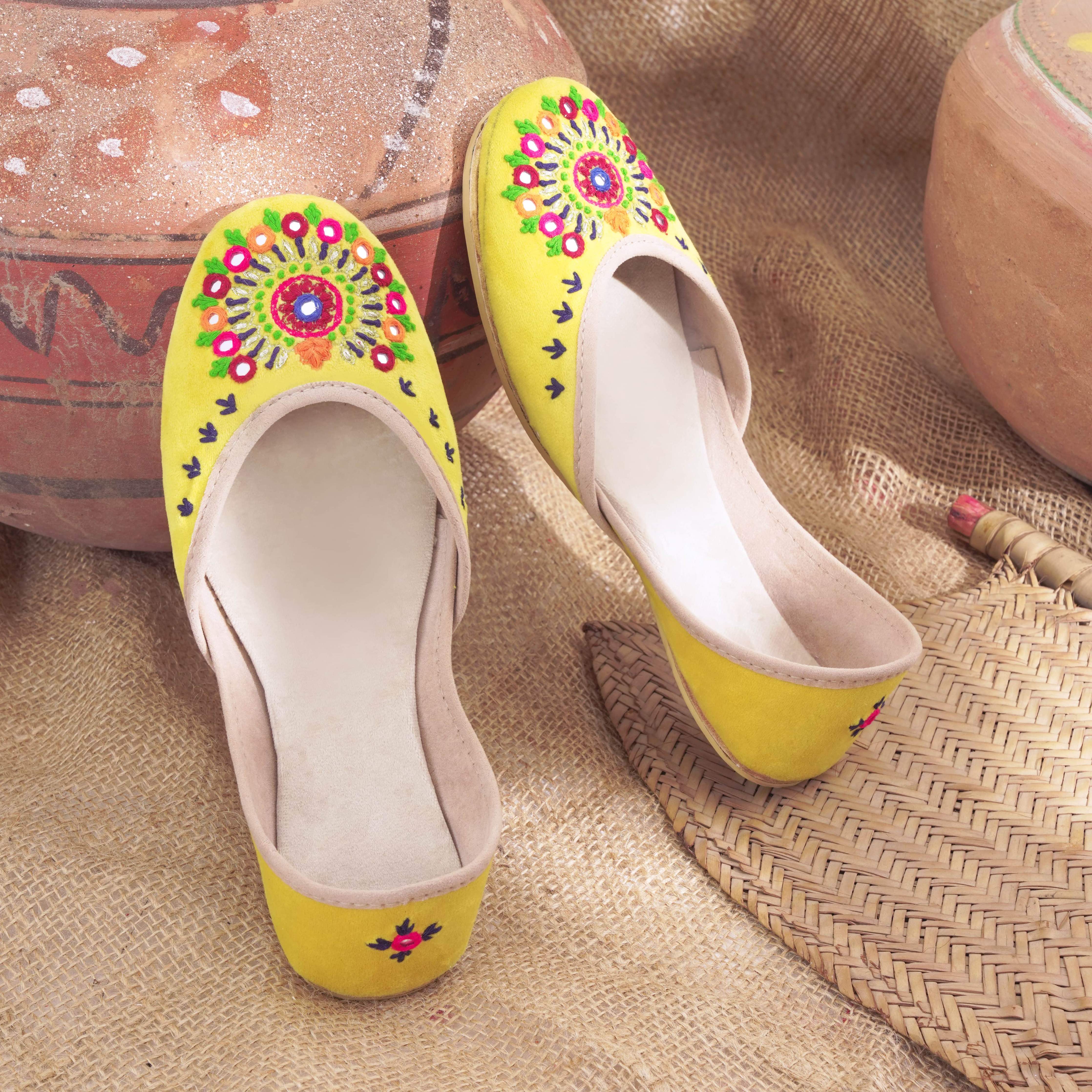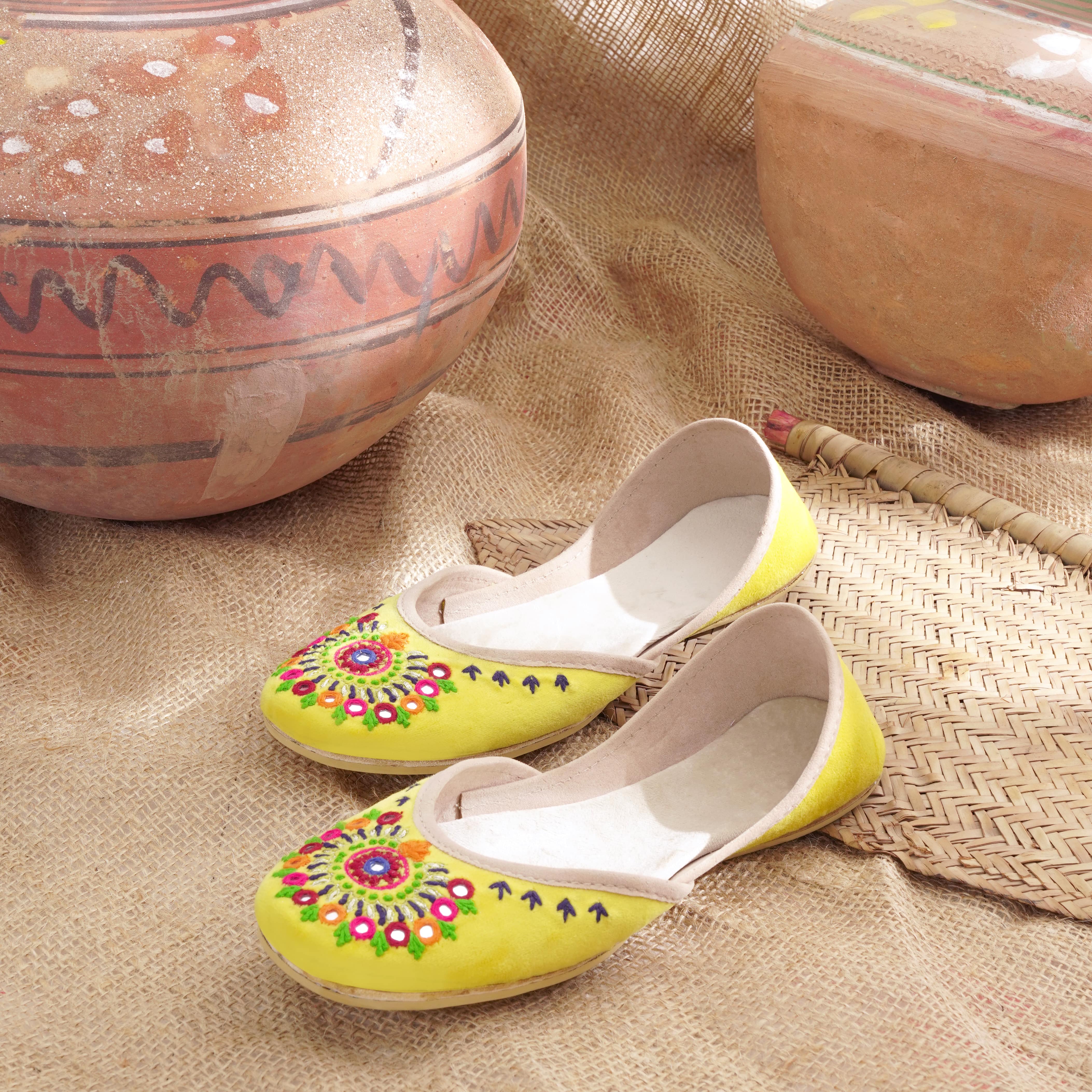 Basanti is a festive inspired rajashtani Khussa. It is an explosion of colors and radiates happy vibes. Basanti is the perfect choice for a day where you need something to brighten up your day. From colorful embroidery in orange, blue, green and pink adorned to mirror work. With over 40 hours of craftsmen-ship Basanti goes all out on making an impact.