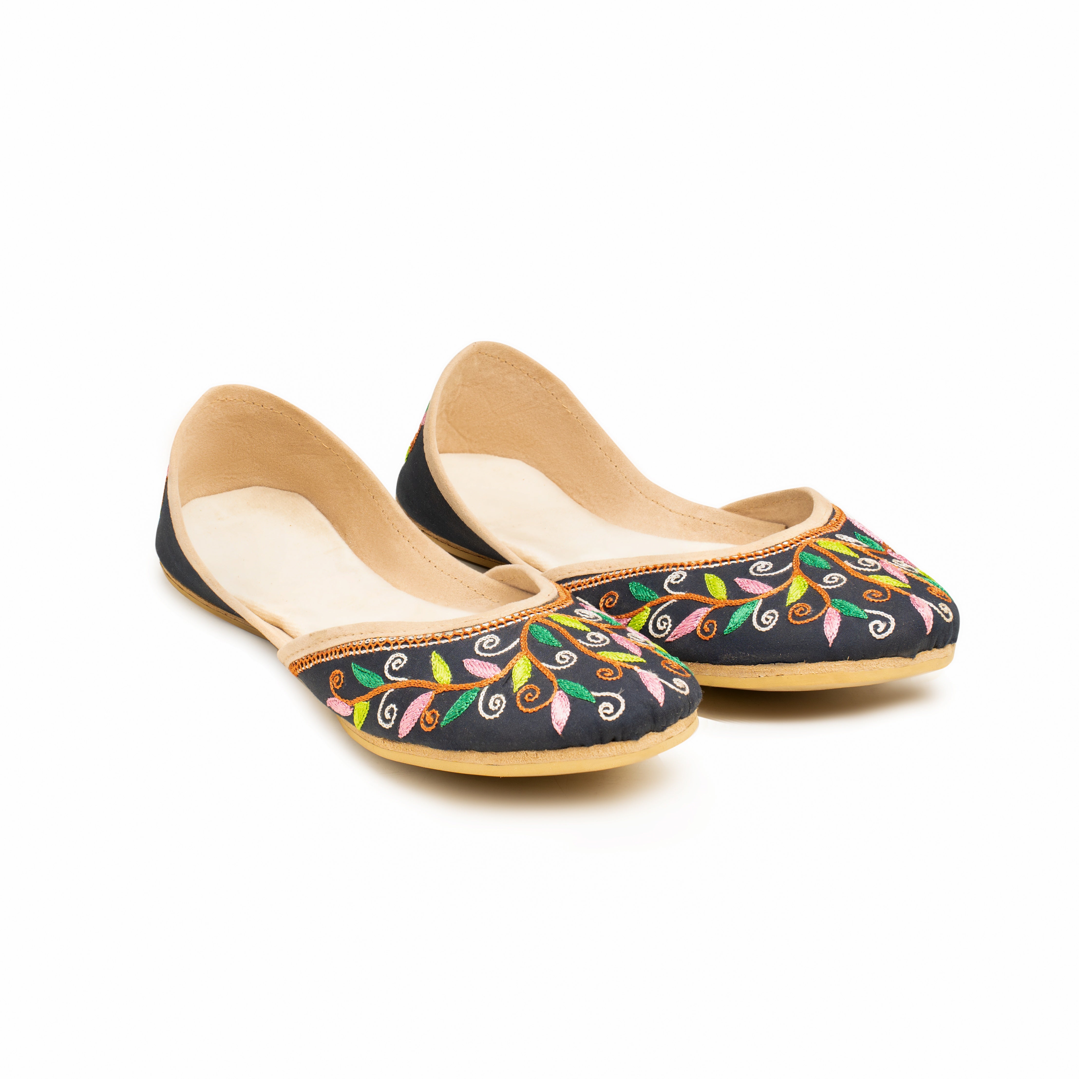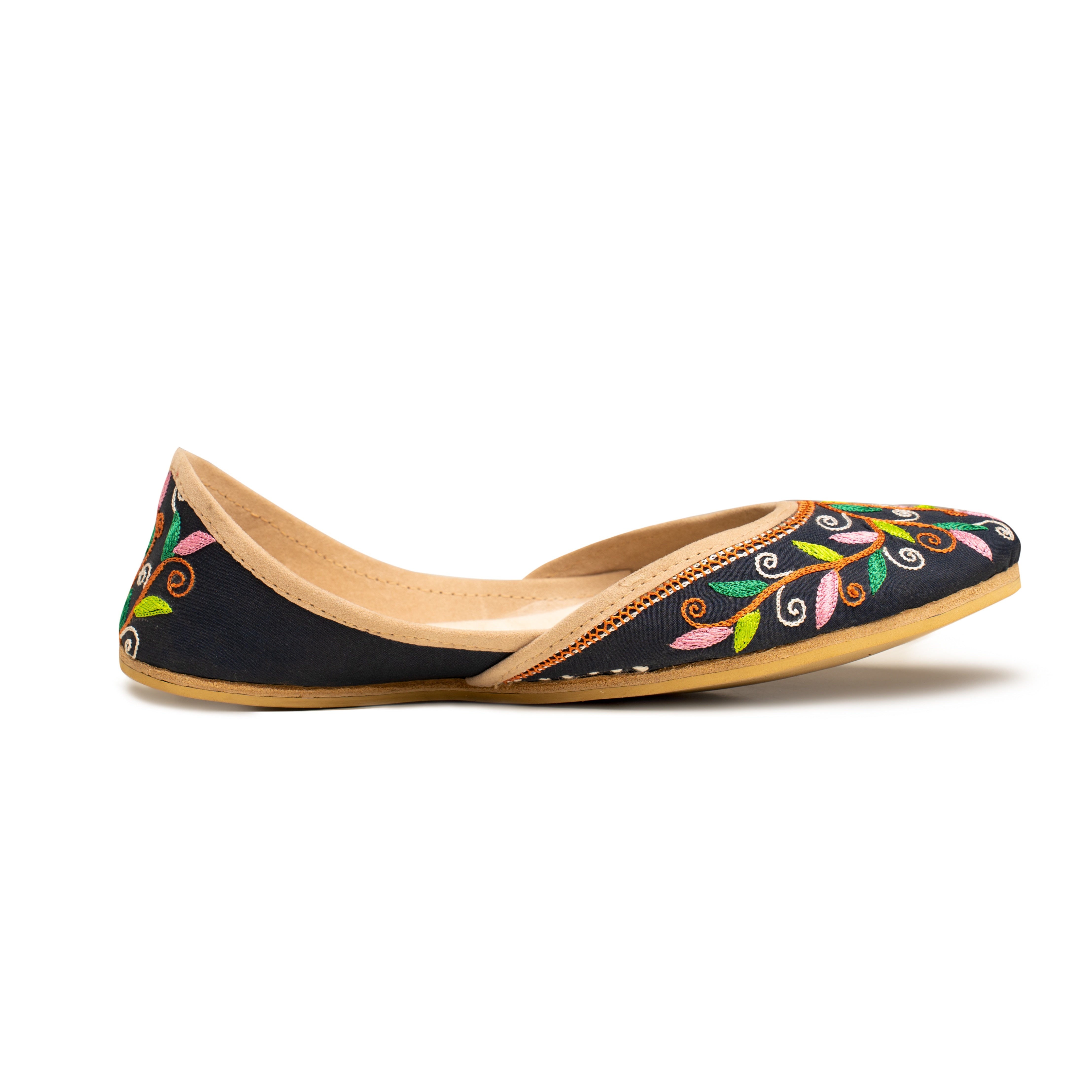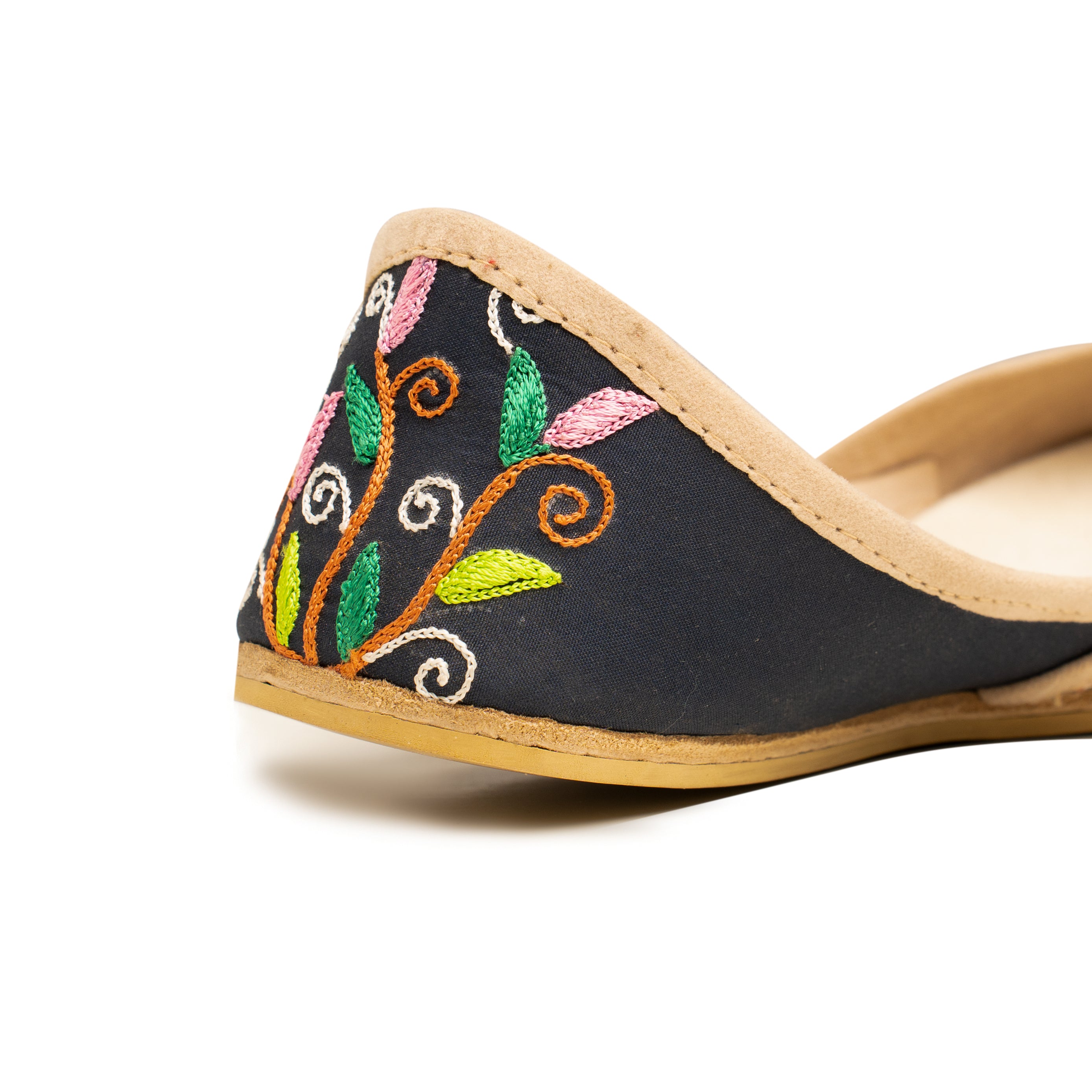 Black is always a head turner but this design is beautiful like no other. Solid black base with delicate vibrant coloured embroidery in complementing colours intertwined on a brown stems give a unique beauty to the shoe. It’s time to experience the essence of tradition and beauty with this timeless Khussa, a symbol of cultural identity and refined taste. Embrace the legacy of craftsmanship and elegance that has stood the test of time, and embark on a journey of style and grace with every stride. Let this Khussa become a treasured heirloom, cherished for generations to come. Whether you're dressing up for a grand celebration, a festive occasion, or simply seeking to infuse a touch of elegance into your everyday attire, this Khussa is the perfect choice. Its versatile design effortlessly complements both traditional and contemporary outfits, making it a versatile addition to any wardrobe.
