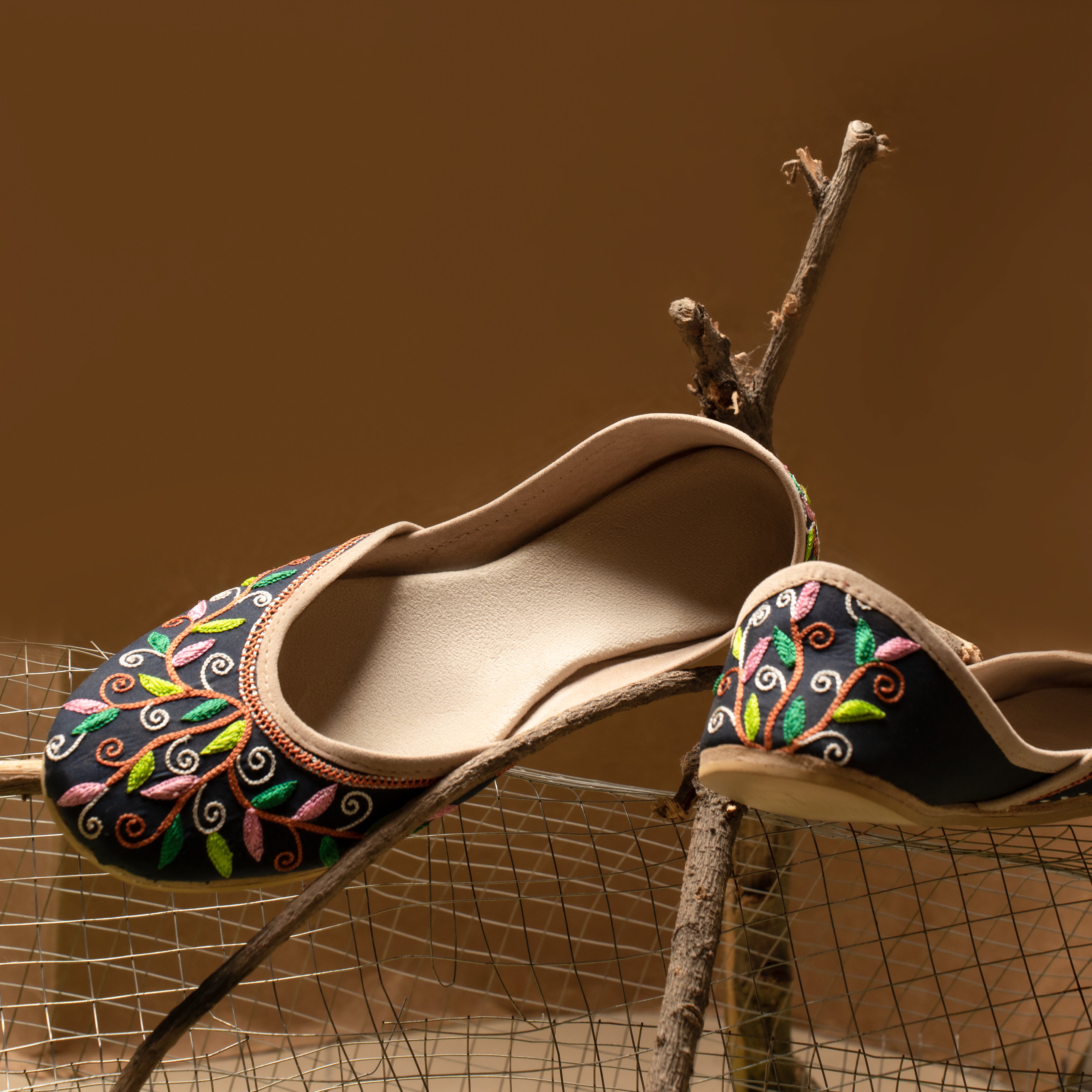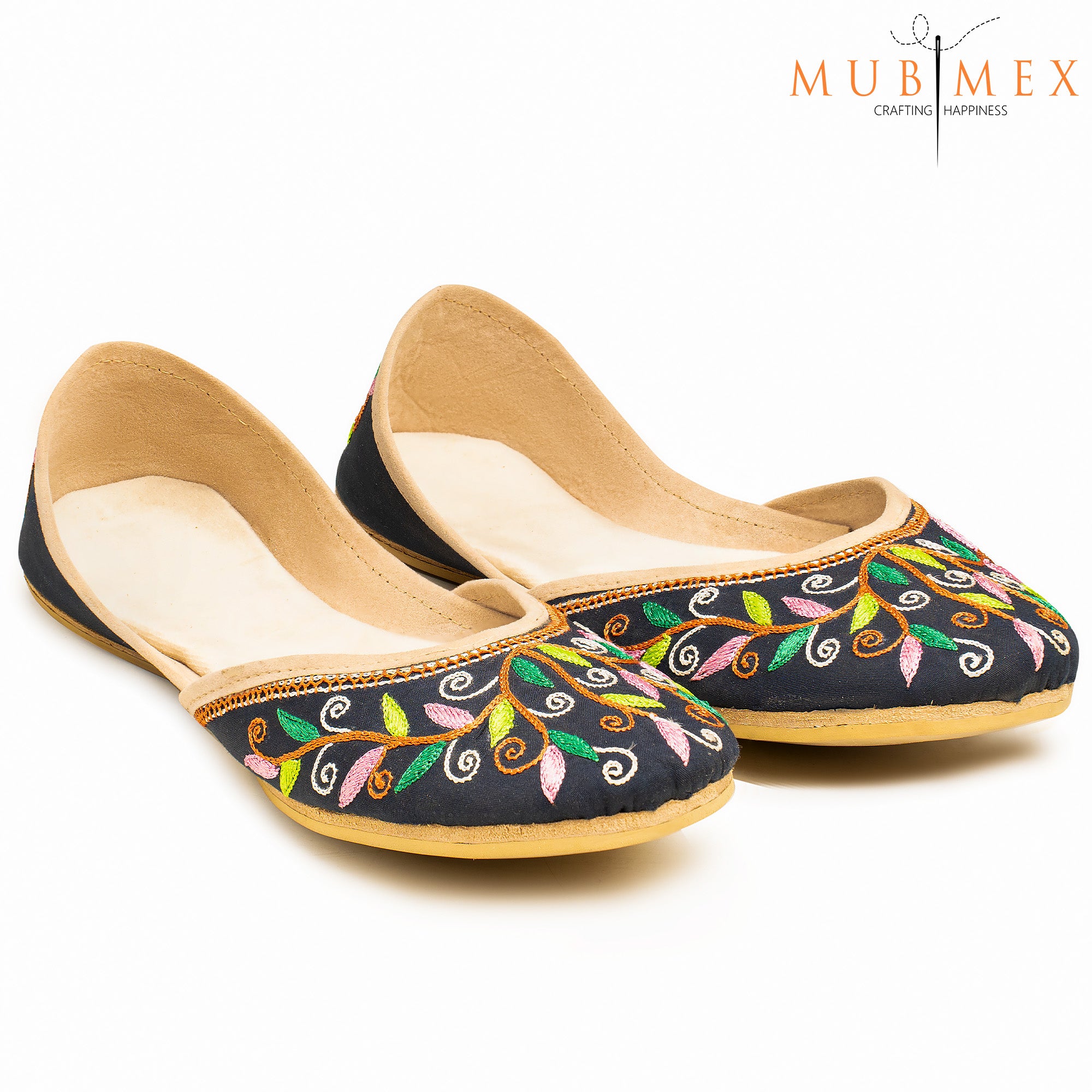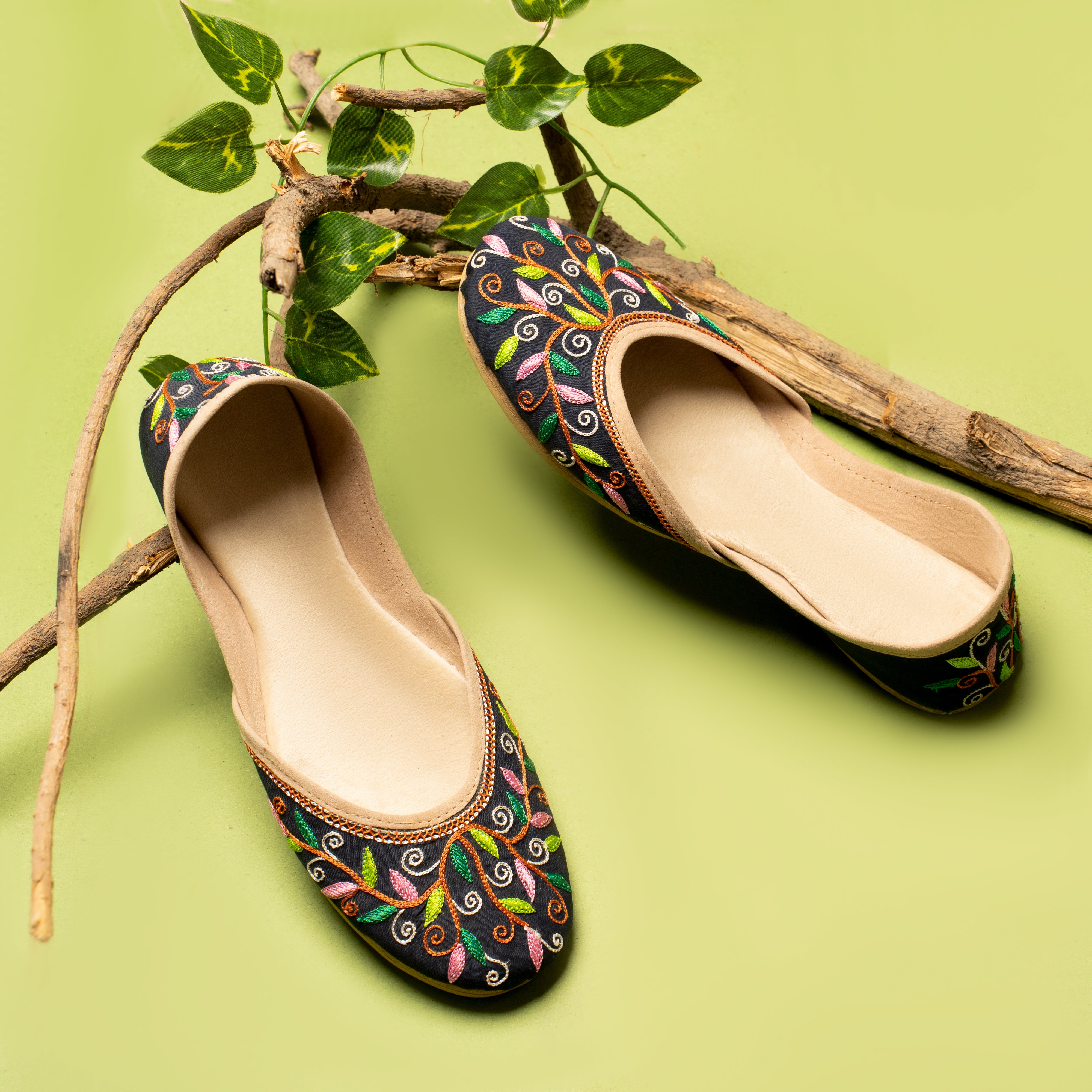 Black is always a head turner but this design is beautiful like no other. Solid black base with delicate vibrant coloured embroidery in complementing colours intertwined on a brown stems give a unique beauty to the shoe. It’s time to experience the essence of tradition and beauty with this timeless Khussa, a symbol of cultural identity and refined taste. Embrace the legacy of craftsmanship and elegance that has stood the test of time, and embark on a journey of style and grace with every stride. Let this Khussa become a treasured heirloom, cherished for generations to come. Whether you're dressing up for a grand celebration, a festive occasion, or simply seeking to infuse a touch of elegance into your everyday attire, this Khussa is the perfect choice. Its versatile design effortlessly complements both traditional and contemporary outfits, making it a versatile addition to any wardrobe.