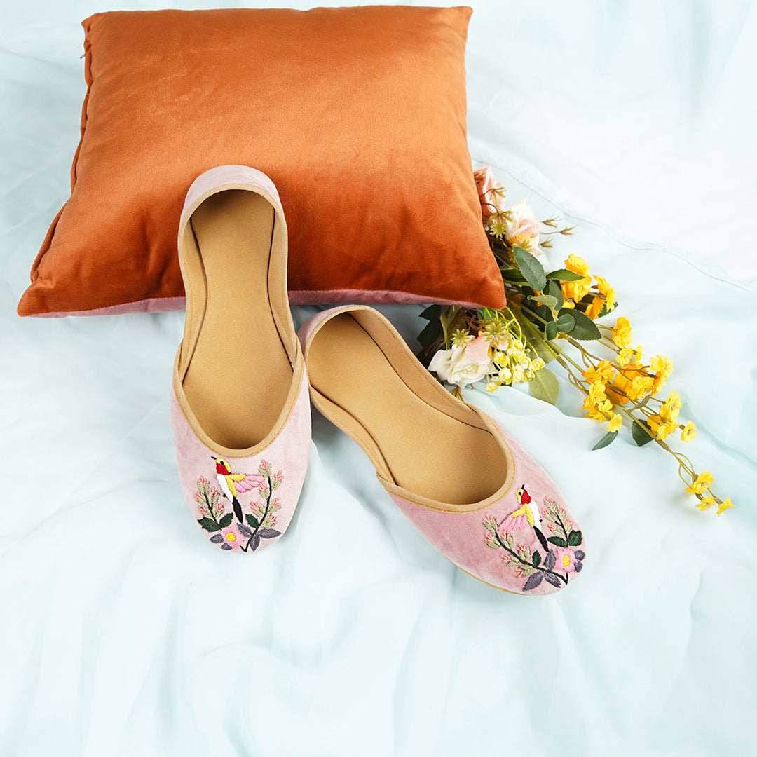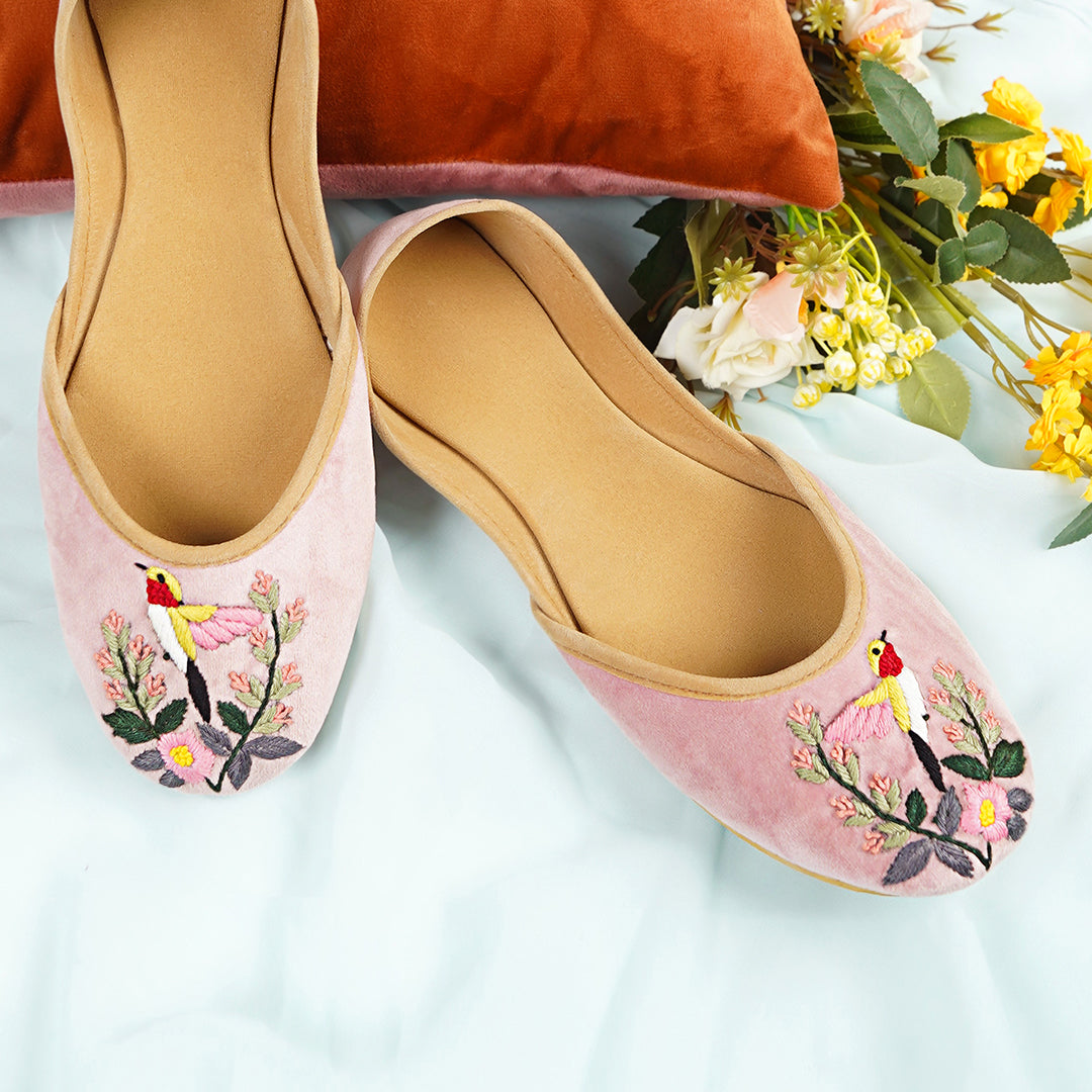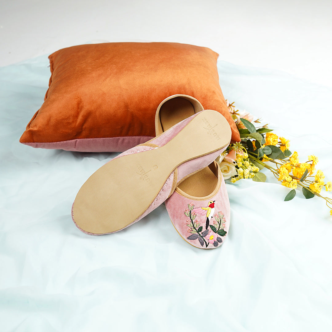 Introducing Bloom, a khussa that embodies the essence of nature's elegance. Crafted with intricate embroidery, this piece showcases a delicate bird perched amidst blooming flowers, symbolizing beauty and freedom. Every stitch is meticulously designed to highlight the fine details of the bird’s feathers and the vibrant floral patterns surrounding it. Bloom isn’t just a khussa; it’s a work of art that brings nature’s charm to your feet. Ideal for adding a touch of grace to any outfit, this khussa combines traditional artistry with a refreshing, nature-inspired aesthetic. Step into elegance with Bloom.