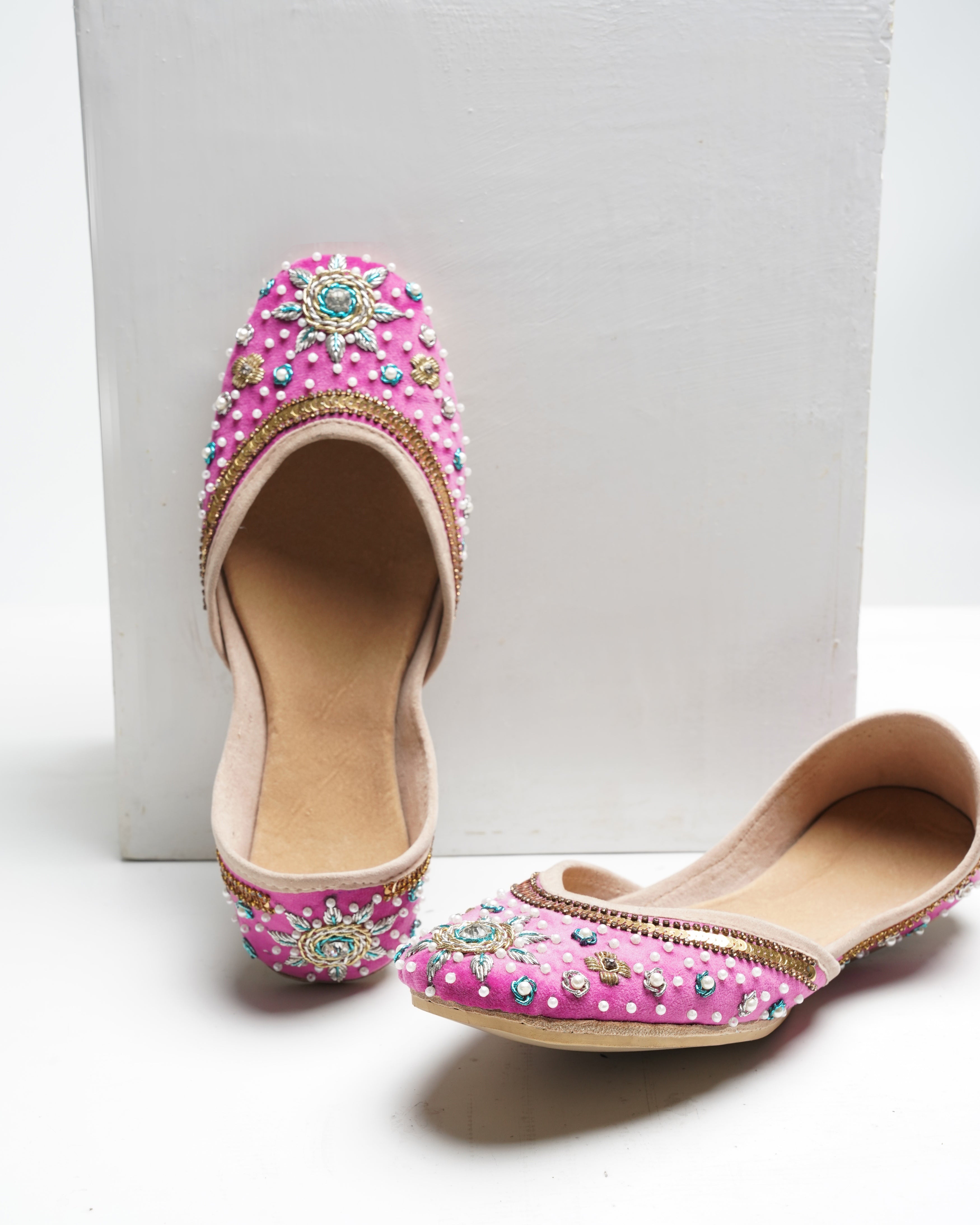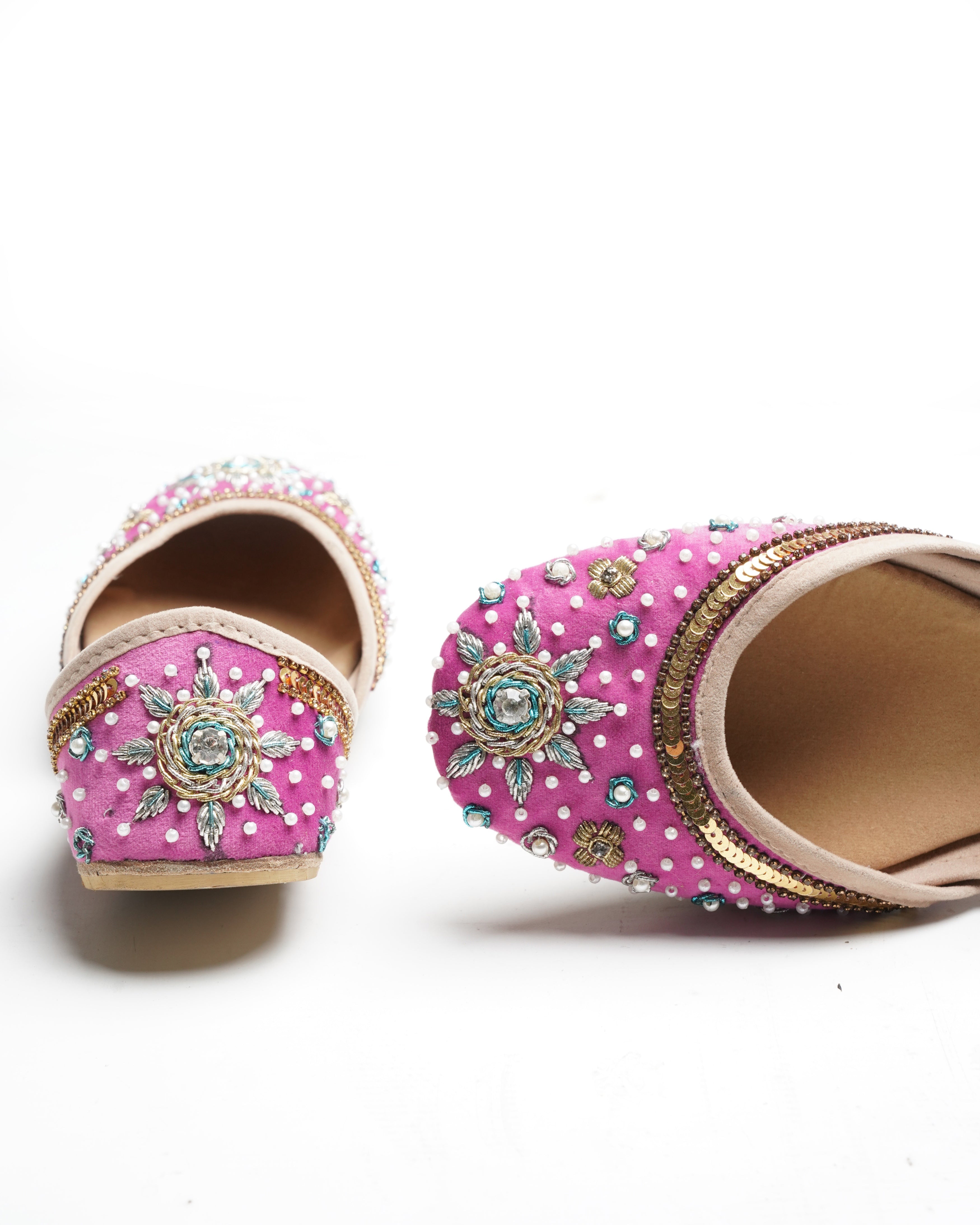 Gulabo is a pink velvet based khussa adorned with embellishments such as sequins, pearl beads and stone work along with golden zari to form intricate floral motifs.