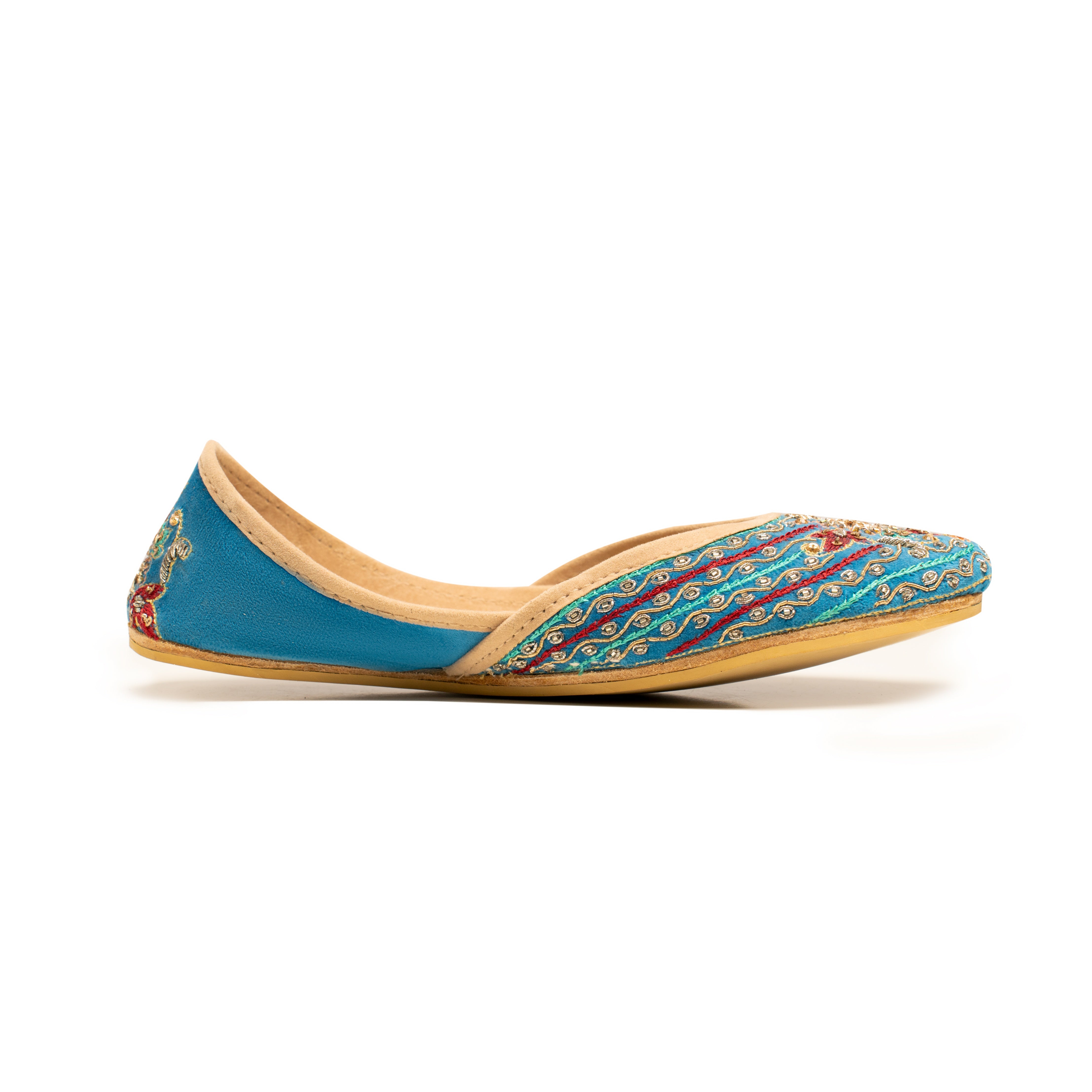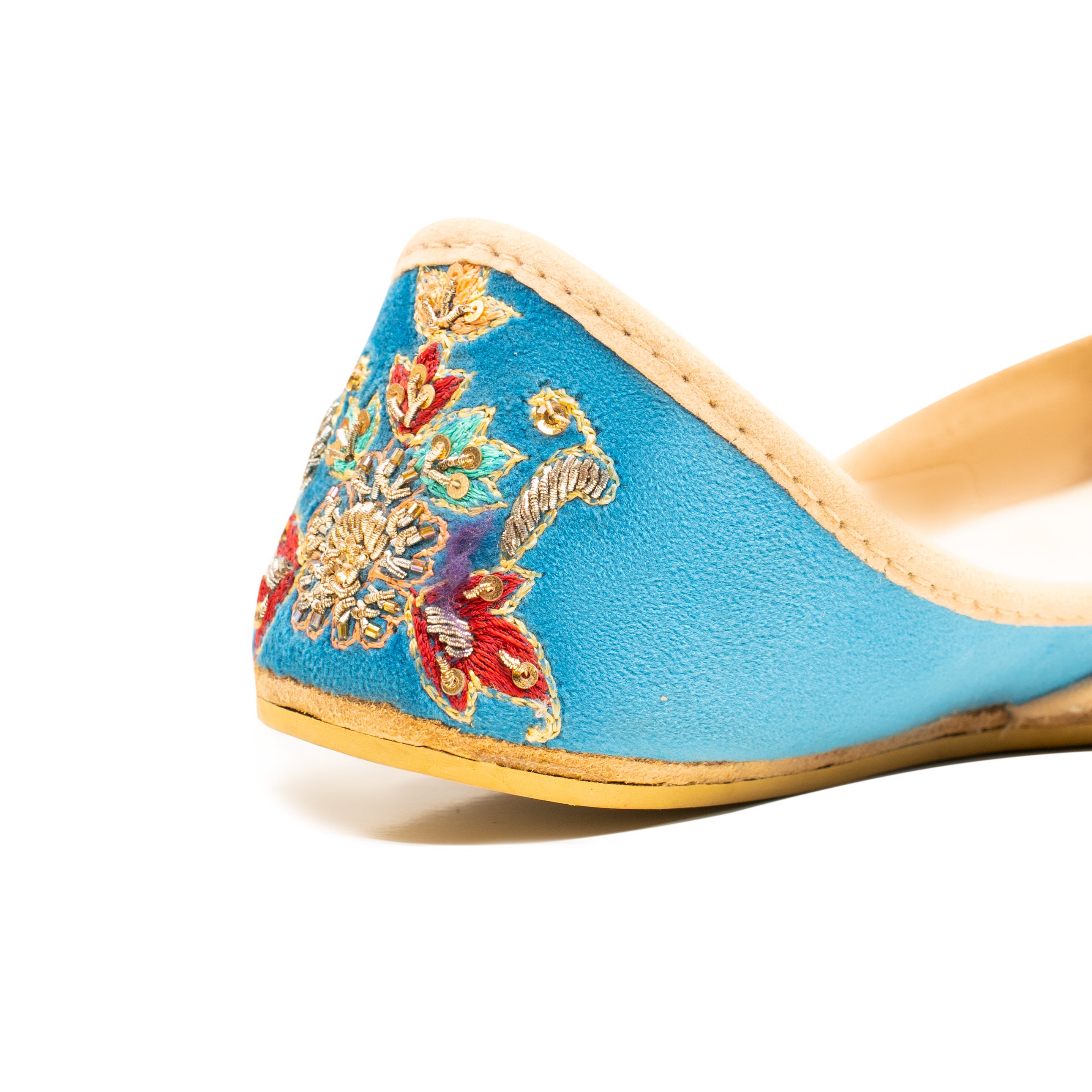 The traditional light blue khussa with pink and gold hand-stitched details is a mesmerizing piece of art, fusing cultural heritage with contemporary elegance. Khussa is a type of traditional footwear widely worn in South Asian countries, known for its comfort and intricate craftsmanship. This particular khussa features a soft and soothing light blue base, reminiscent of the clear skies on a serene summer day. The gentle hue exudes a sense of tranquility and grace, making it a versatile choice for various occasions, from weddings to festive celebrations. Adding a vibrant touch to the serene blue canvas, intricate pink and gold hand-stitched patterns adorn the surface of the khussa. Crafted by skilled artisans, these patterns showcase traditional motifs and floral designs, creating a harmonious blend of classic charm and modern aesthetics.