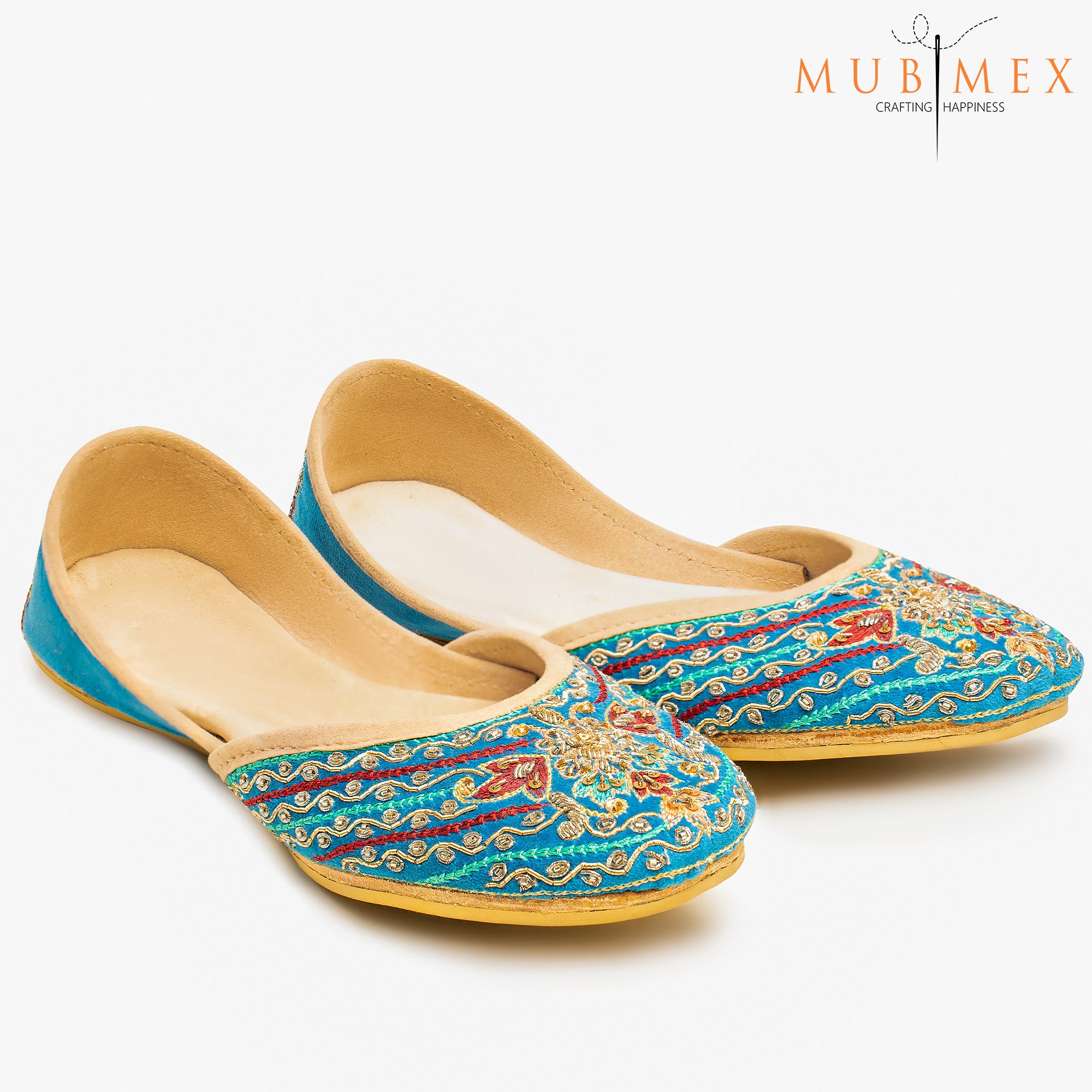 The fusion of the pastel light blue hue, the vibrant pink and gold embroidery, and the dazzling stones create an eye-catching contrast, making the khussa a truly exquisite masterpiece. Whether paired with traditional attire like sarees, lehengas, or shalwar kameez, or even with contemporary outfits, this khussa will undoubtedly be the center of attention, celebrating the beauty of age-old craftsmanship and timeless fashion.