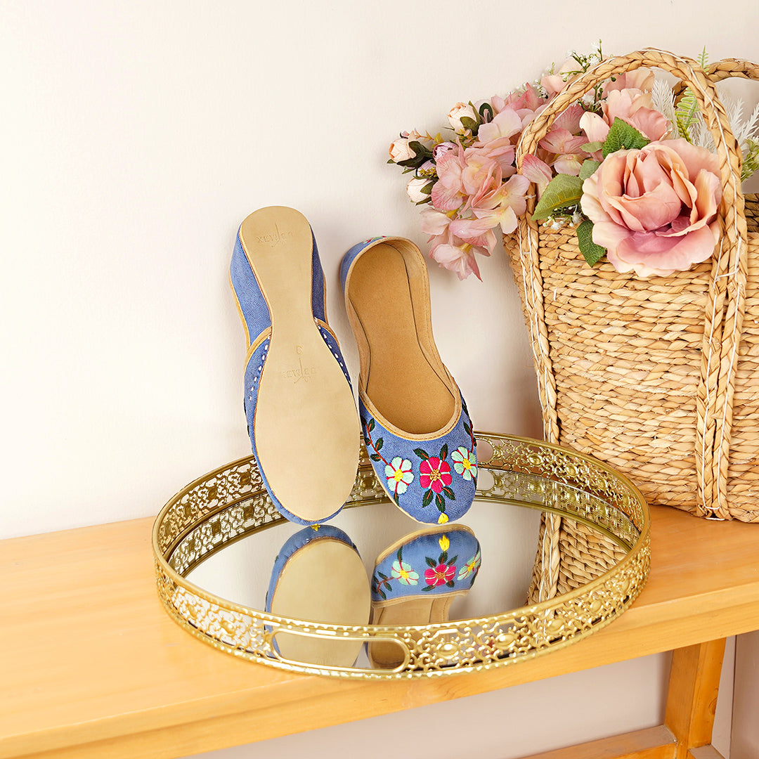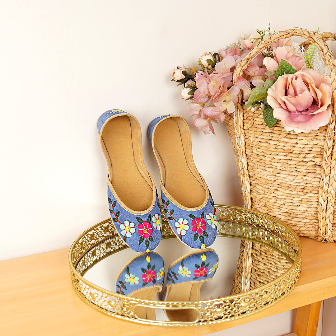 This beautiful khussa is crafted from soft sky blue velvet, featuring intricate embroidery of pink and white flowers that add a fresh, vibrant touch. The 8-layer sole offers superior comfort, support, and durability, making it ideal for both special occasions and everyday wear. With its elegant design and modern cushioning, this khussa combines traditional artistry with long-lasting comfort.