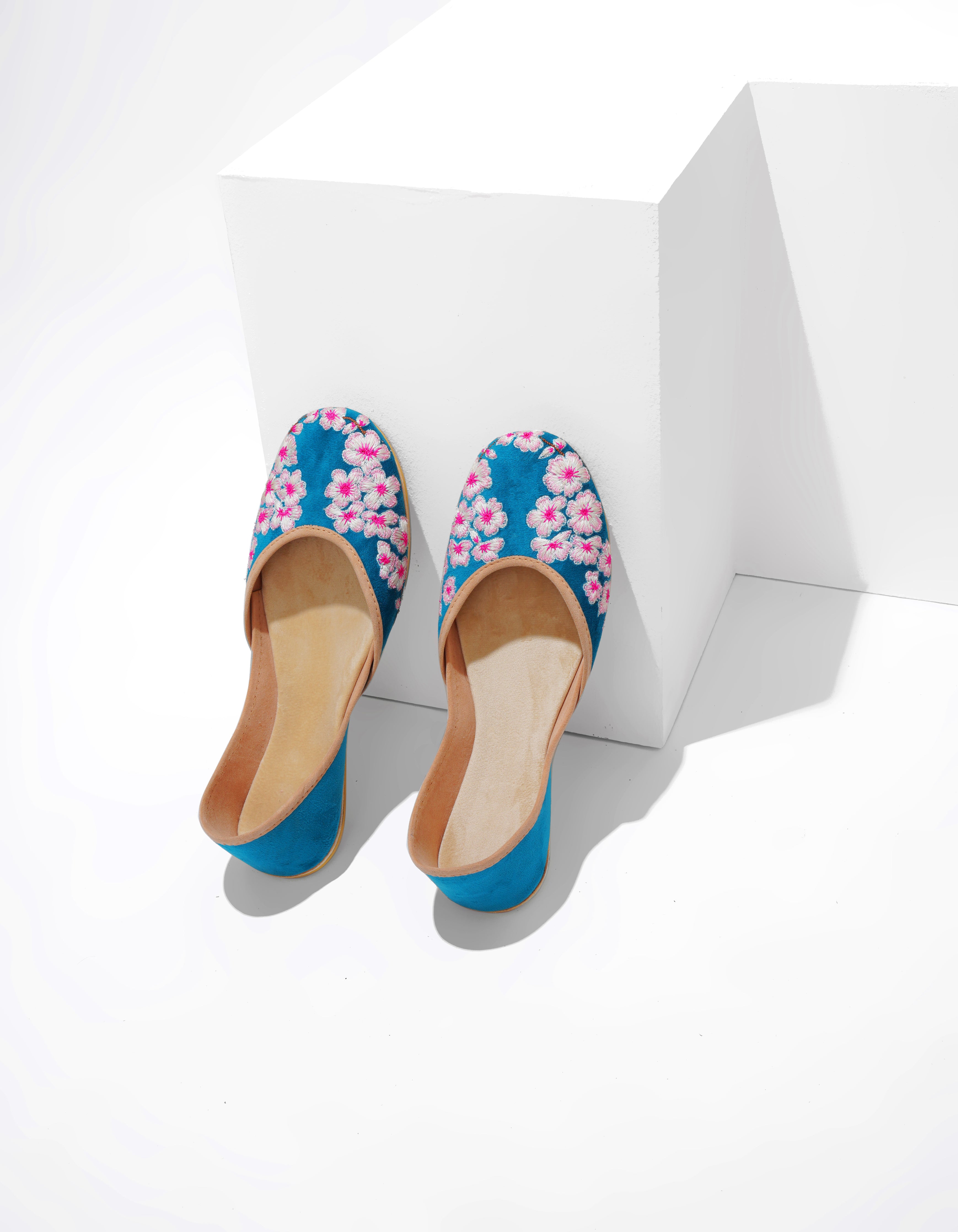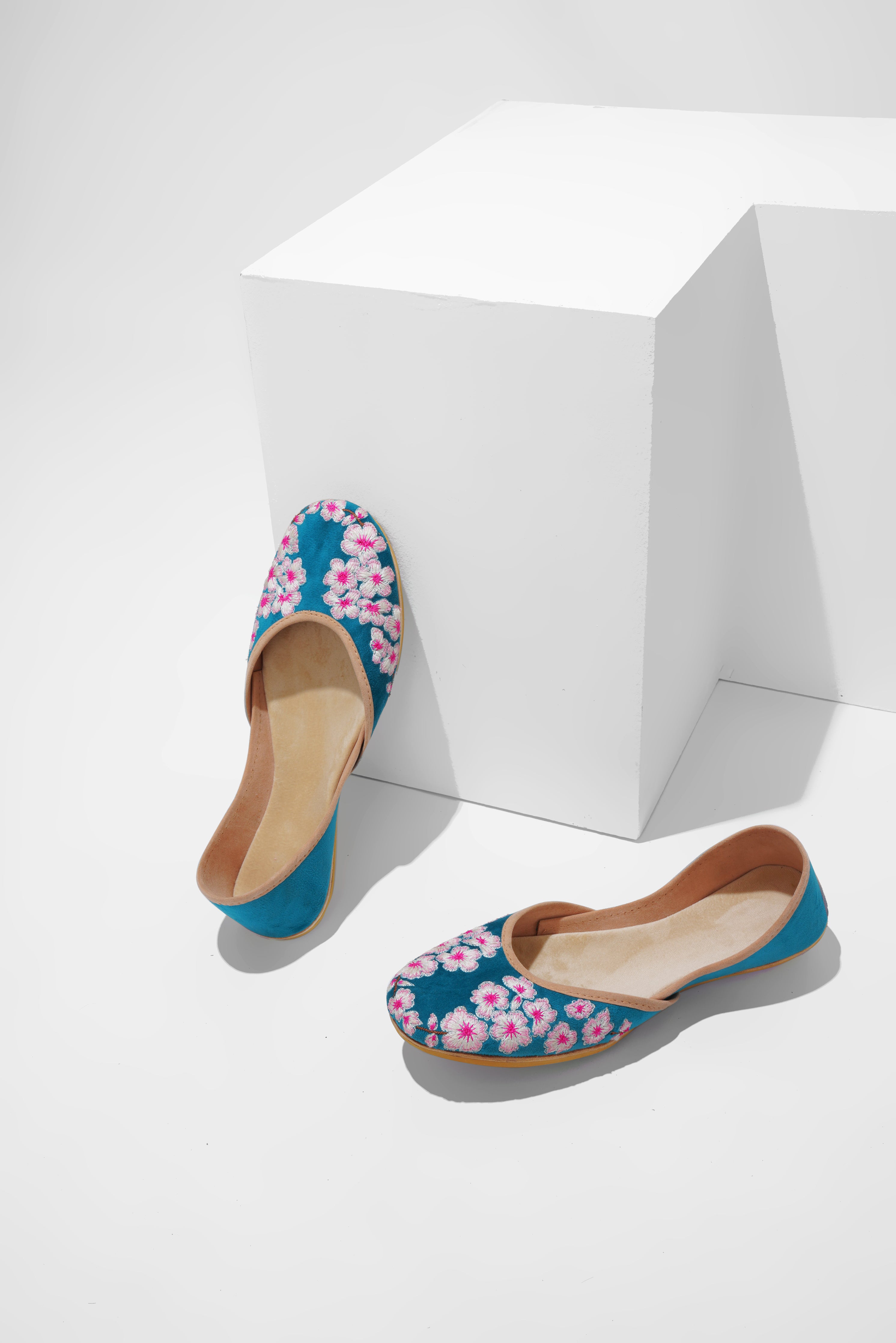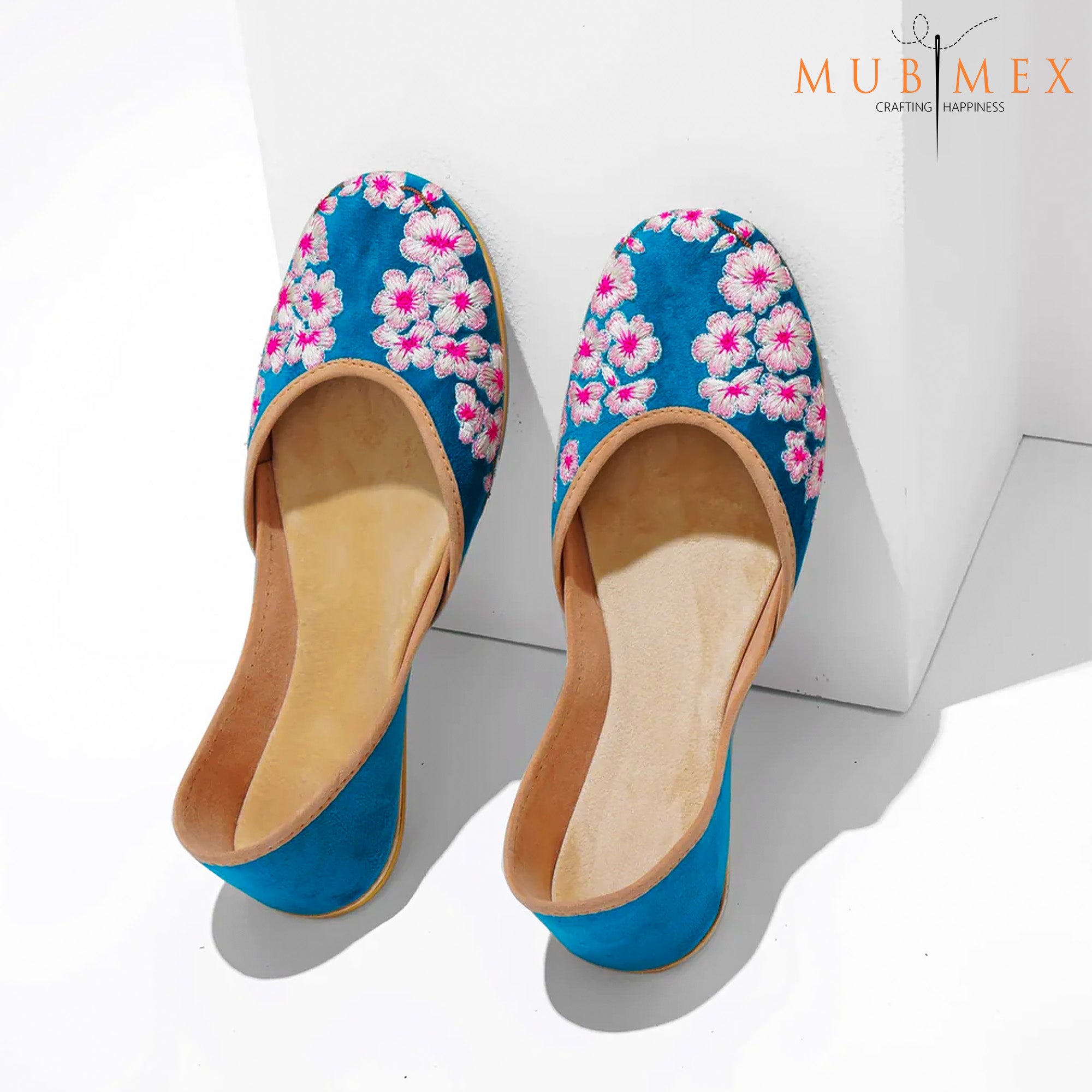 The combination of the rich, midnight blue velvet and the exquisite embroidery work of baby pink blossoms creates a stunning visual contrast that is both striking and beautiful. The khussas are perfect for any occasion, whether it's a formal event or a casual day out, and are sure to turn heads wherever you go.
