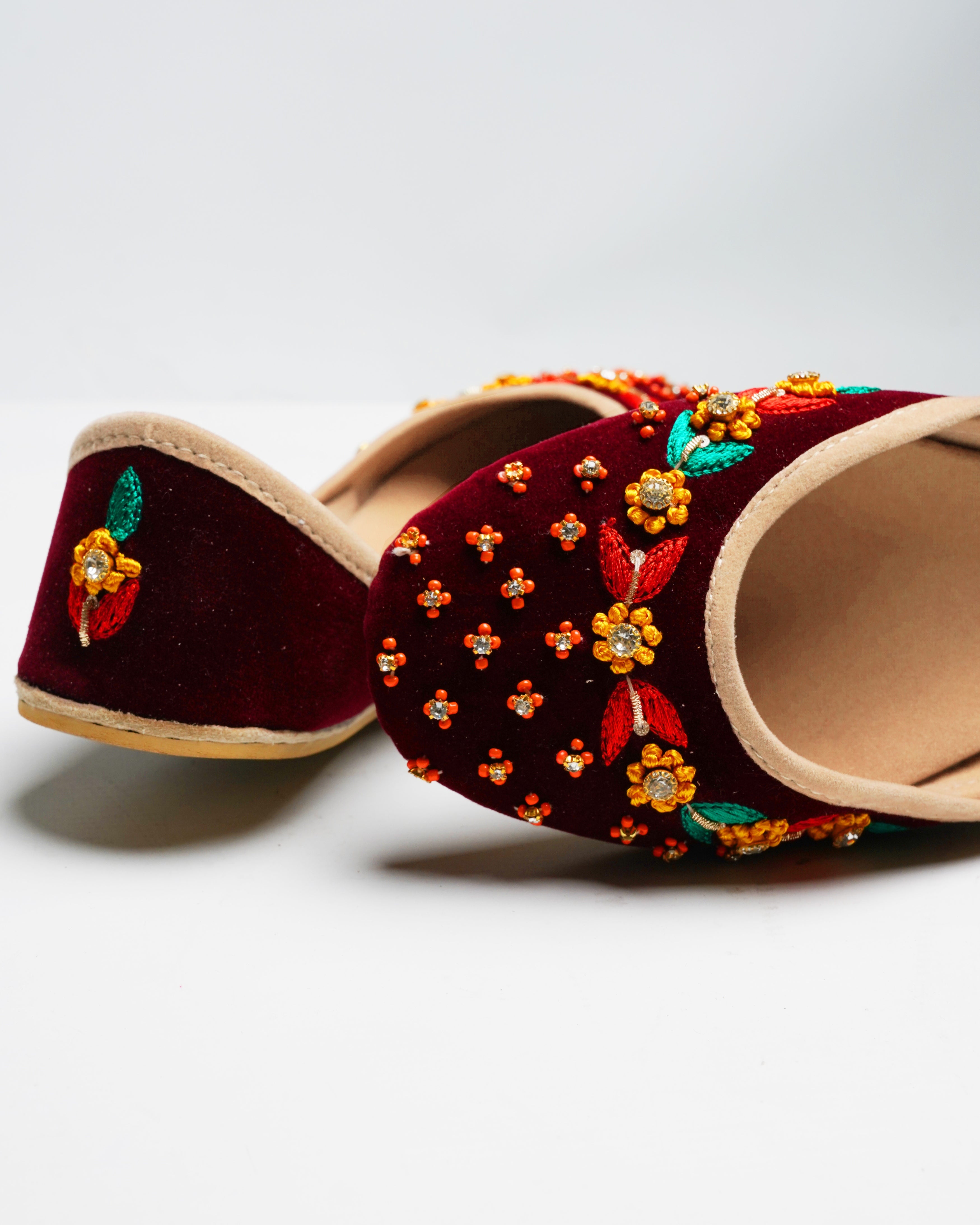 Layla is a deep dark maroon Khussa with embellishments such as French knots, stone work, beaded petals and embroidery adorning it. It displays a warm color palette with orange, red, yellow and green used over the dark maroon base.