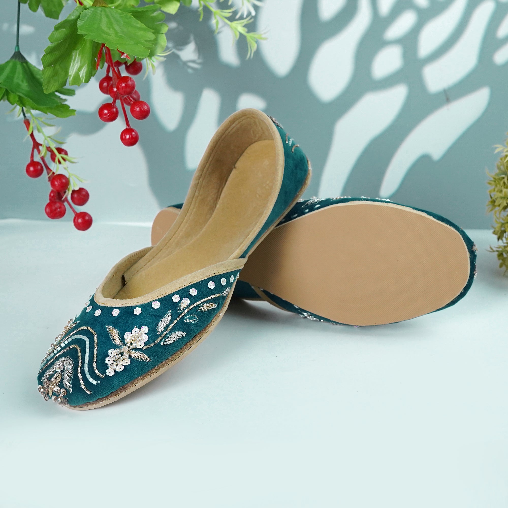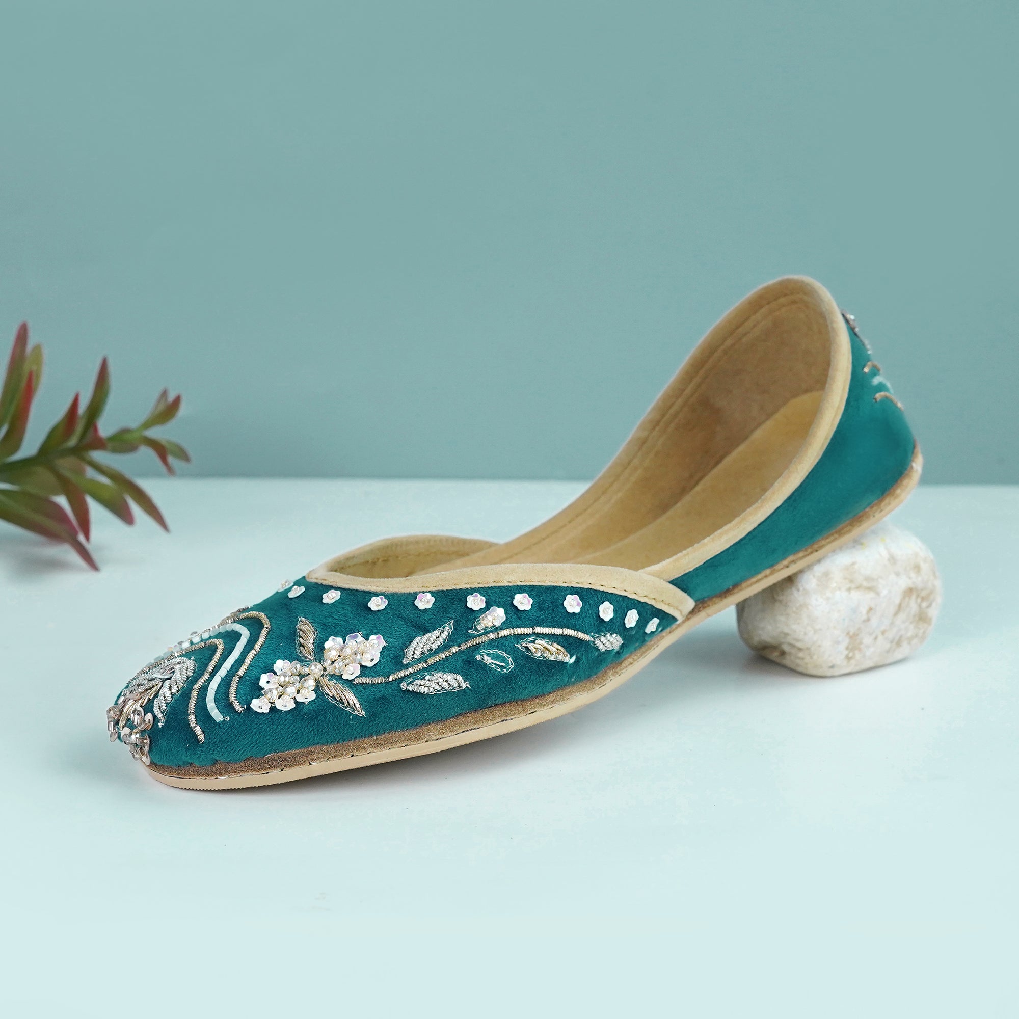 Crafted with top-quality materials, it is designed for all-purpose wear, ideal for any occasion or everyday use. The outsole is fashioned from premium rubber, ensuring not only comfortable walking but also slip resistance, providing added safety and peace of mind. This khussa/Ballet flat is built to last, fashioned from pure hand processed leather that will withstand the test of time. The inner sole features a luxurious velvet lining, making it incredibly comfortable and snug for your feet.