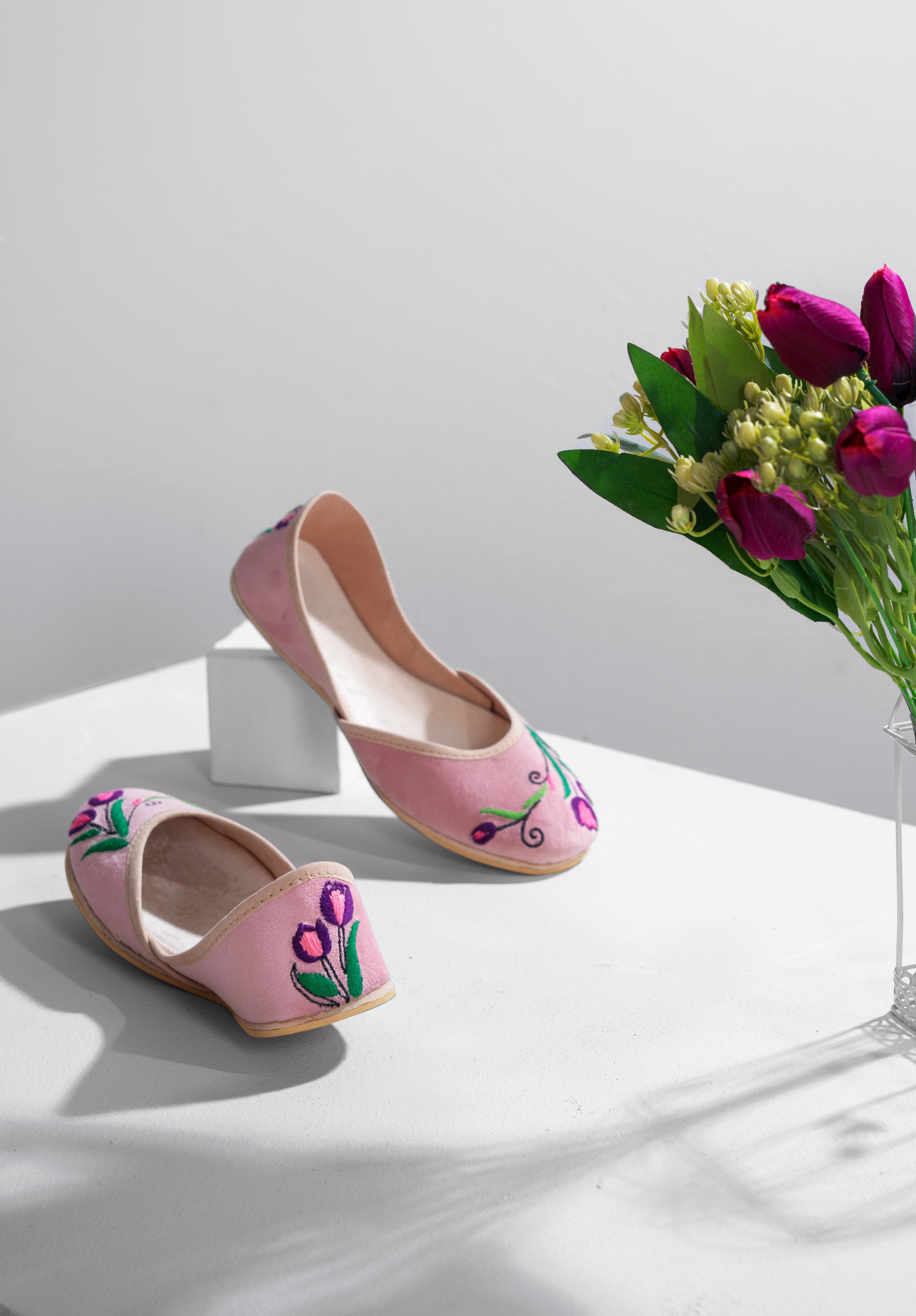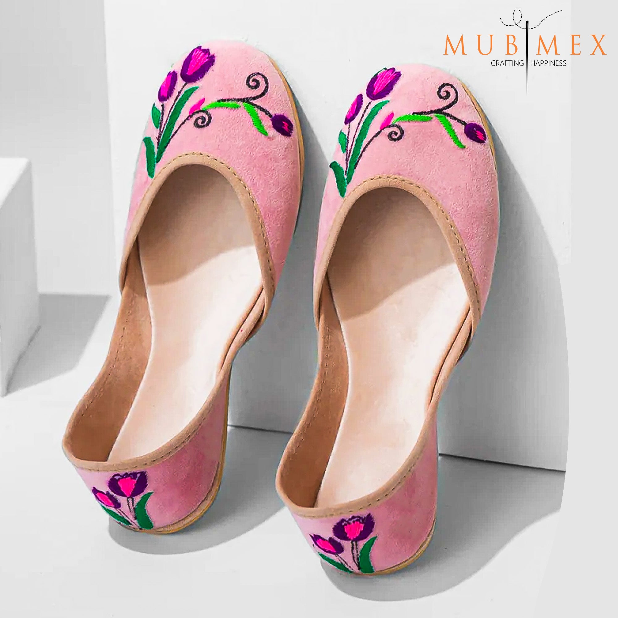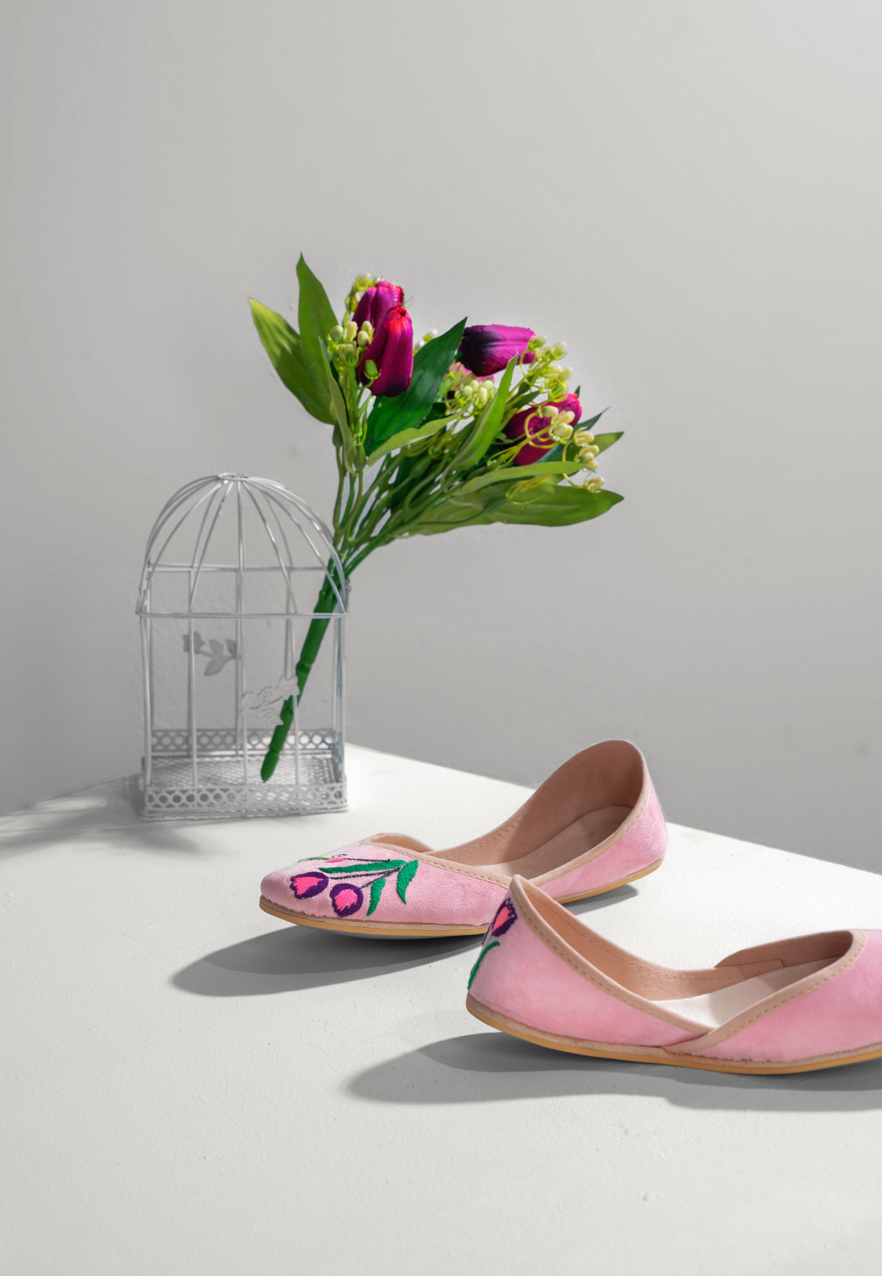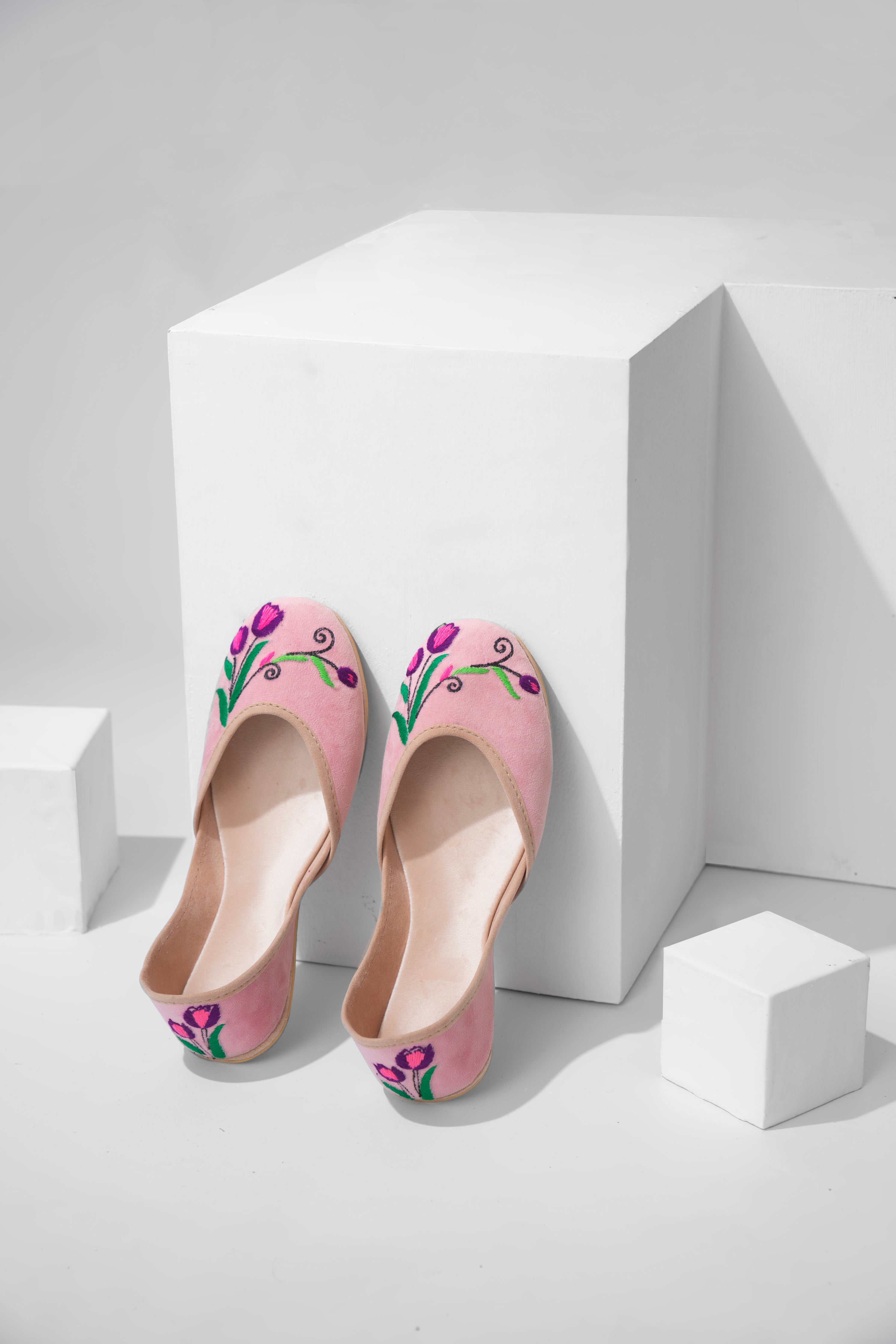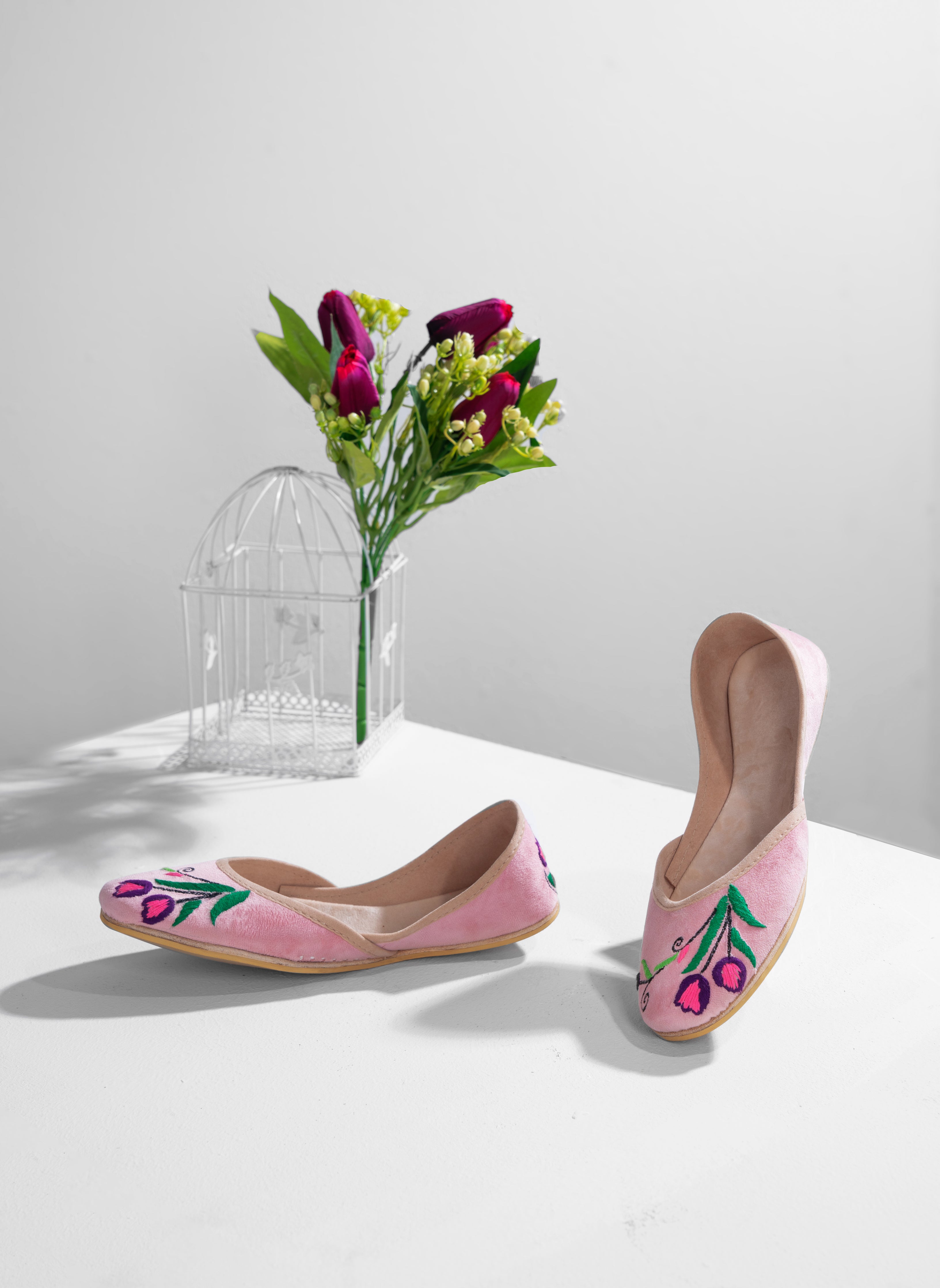 This gorgeous Khussa in baby pink valvet is a true work of art that embodies the perfect blend of minimalism and festivity. The understated yet elegant design features delicate floral embroidery on both the front and back of the shoe. The embroidery is precise and refined, with every stitch contributing to the overall beauty and harmony of the design.