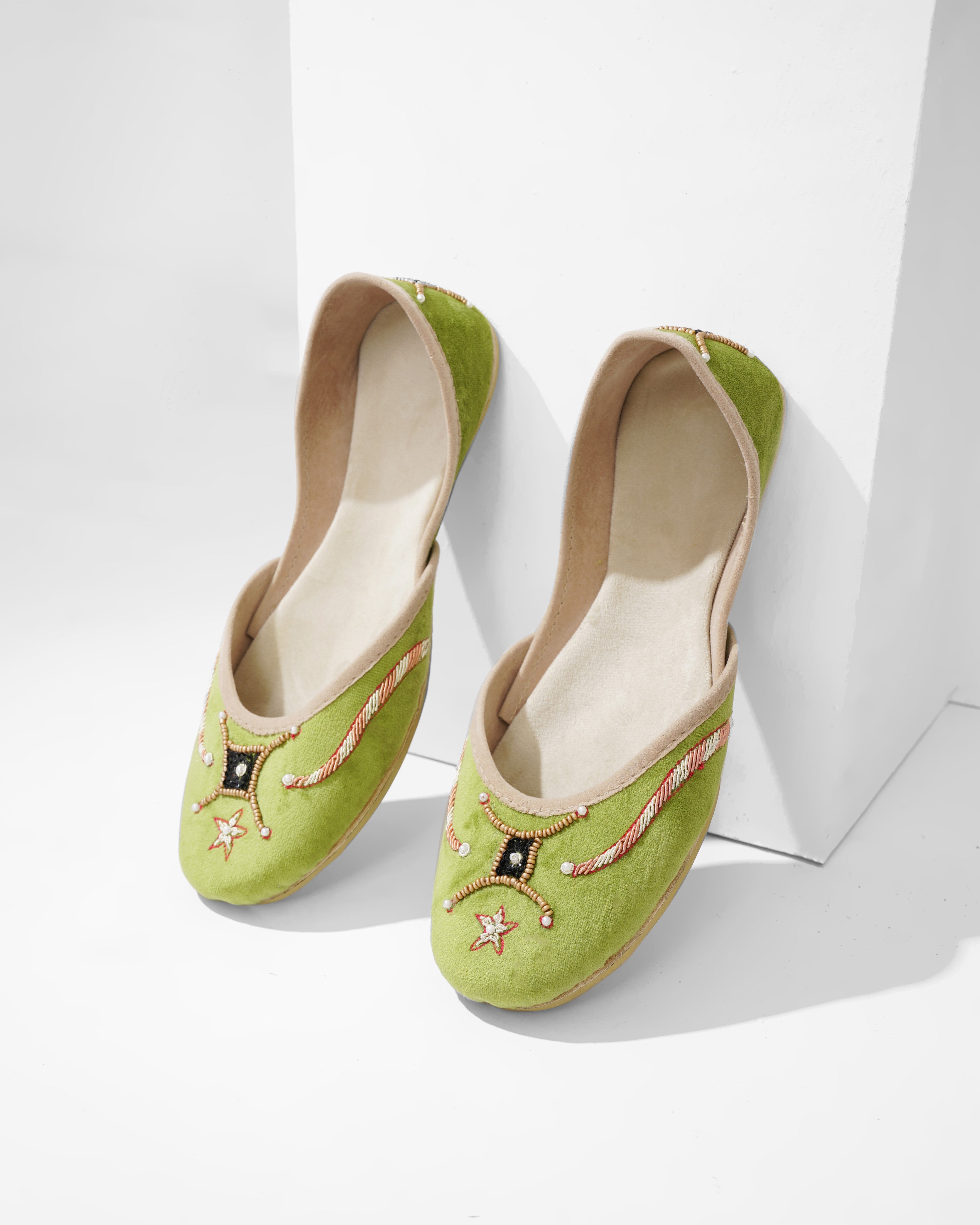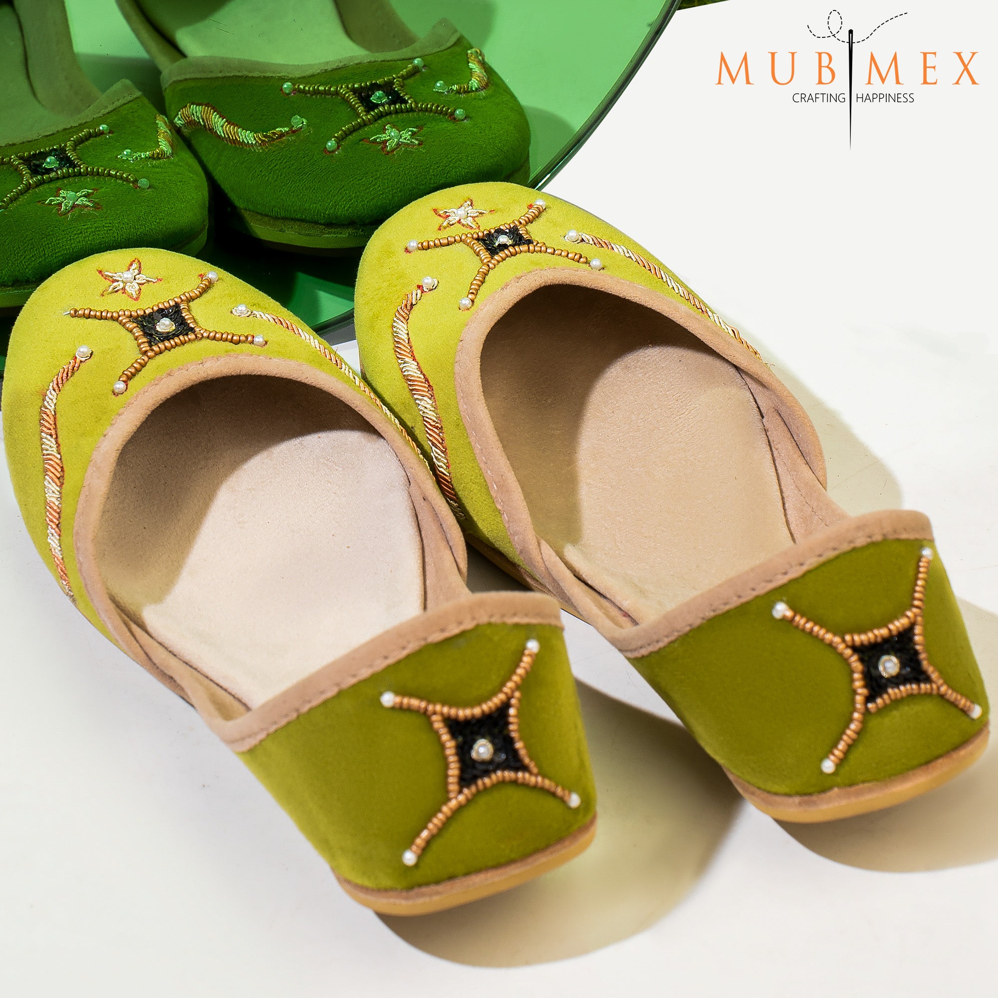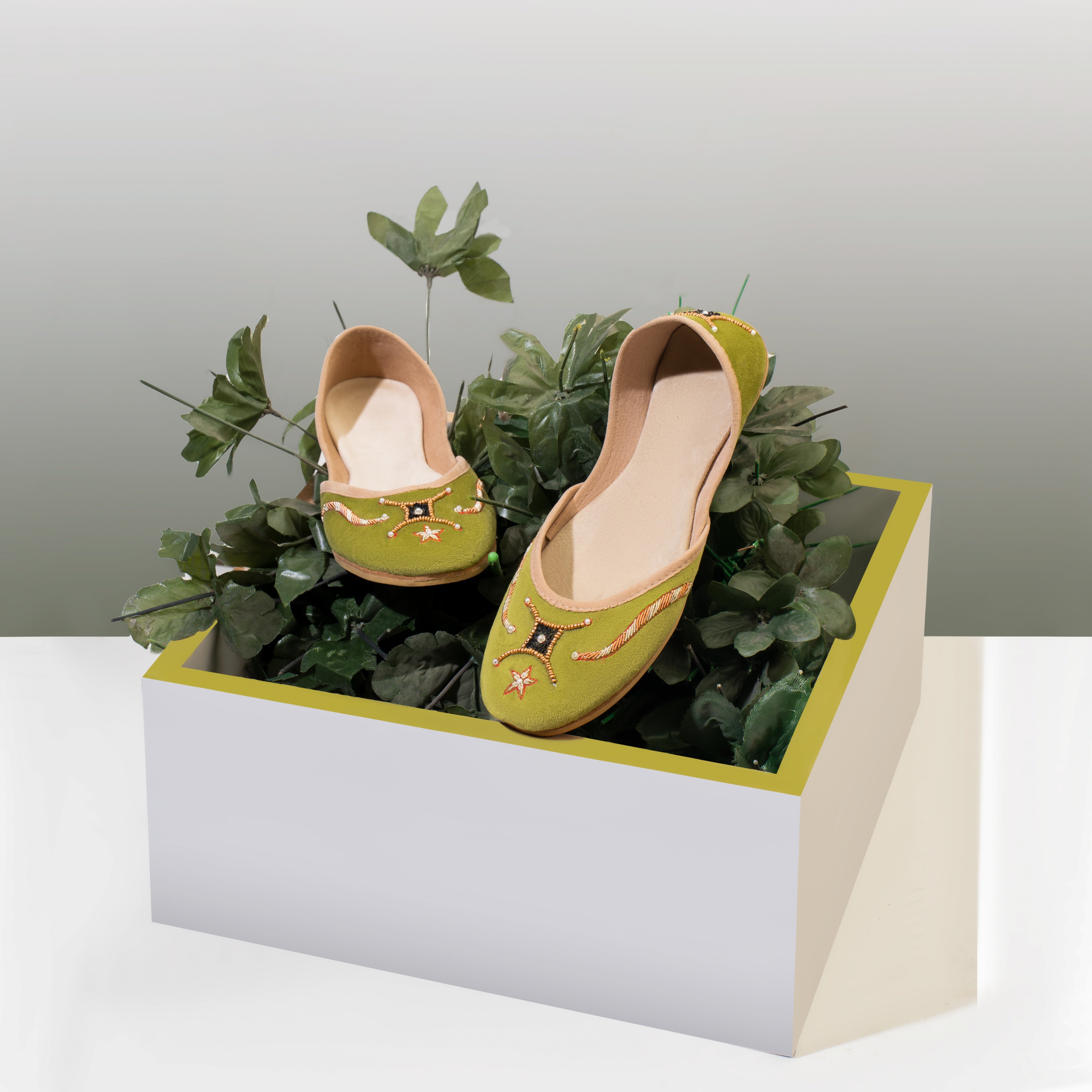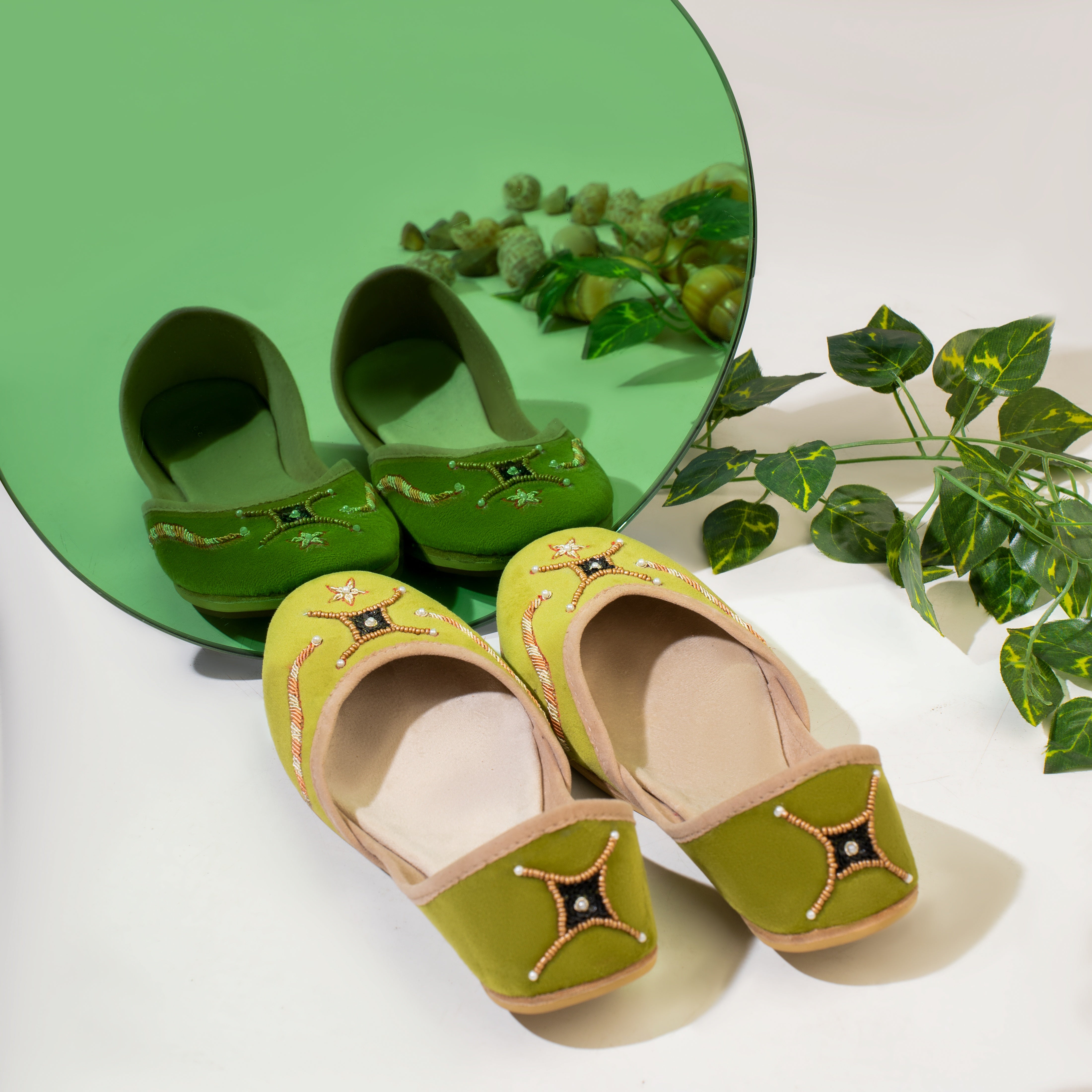 Introducing our exquisite and intricately crafted handmade velvet khussa, perfect for strolling through the lush and vibrant spring gardens. The iconic embroidery details, meticulously stitched by hand with fine threads in stunning shades of vibrant green, add a touch of traditional elegance to this modern and versatile style. The abstract design is a true work of art, showcasing the skilled precision and artistry of our masterful artisans. Each stitch is crafted with care, weaving together delicate threads into a tapestry of timeless beauty. The result is a stunning and unique piece, sure to turn heads and inspire admiration wherever you go. Slip on these exquisite khussas, and you'll feel like you're wearing a true masterpiece of traditional craftsmanship.