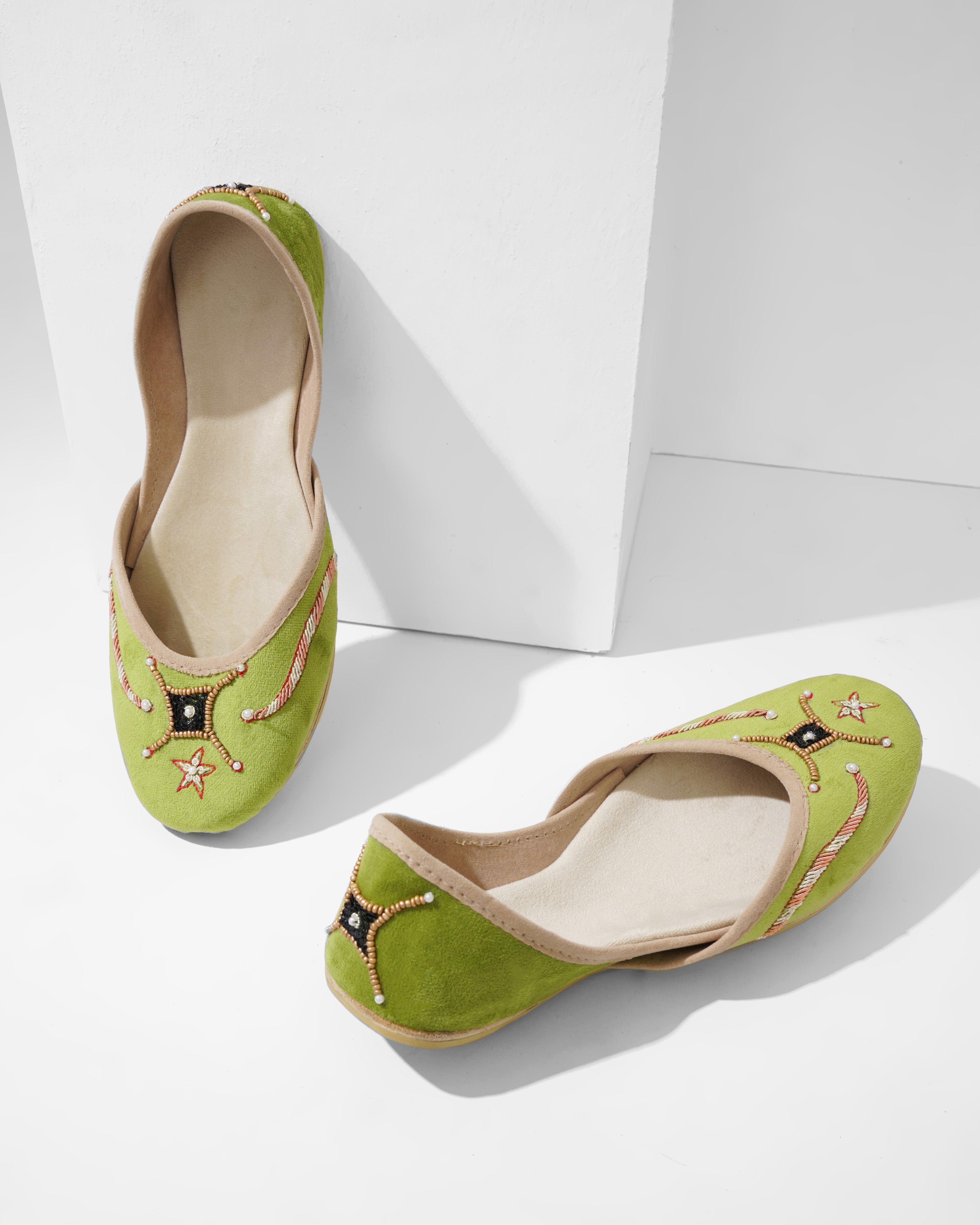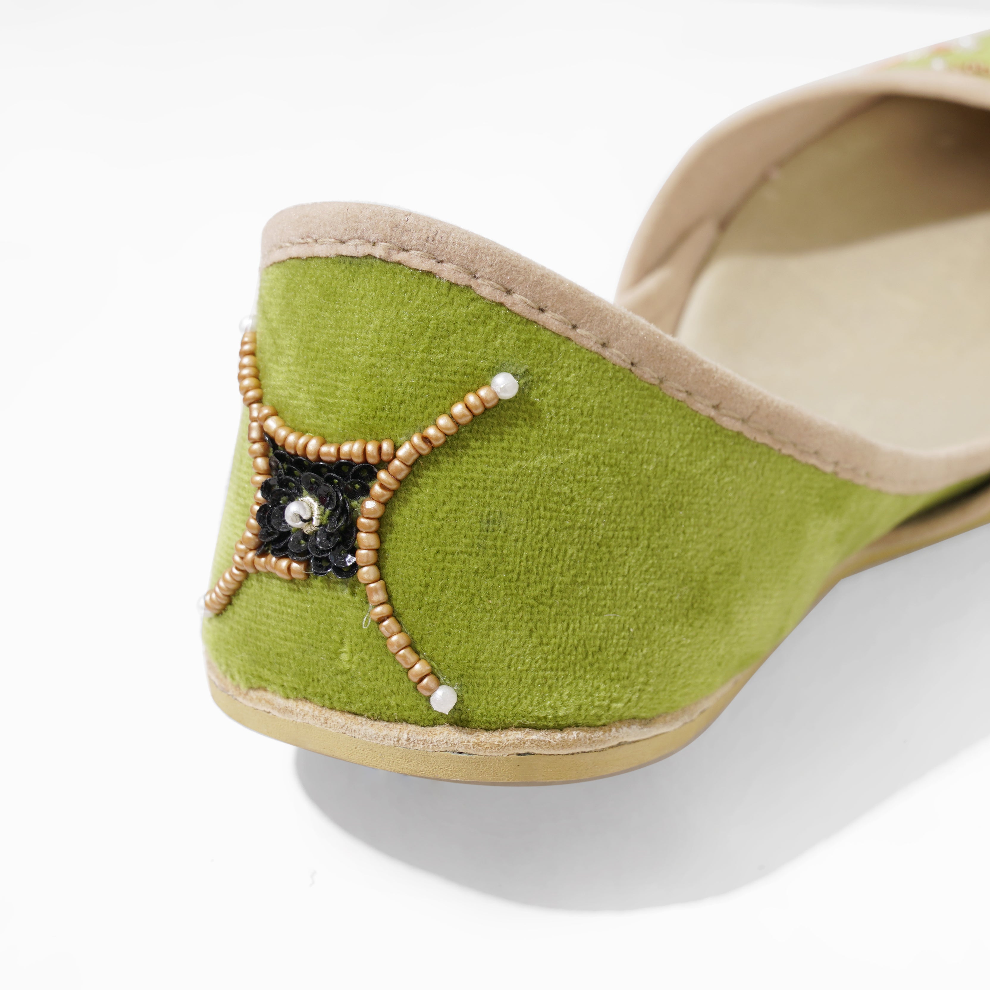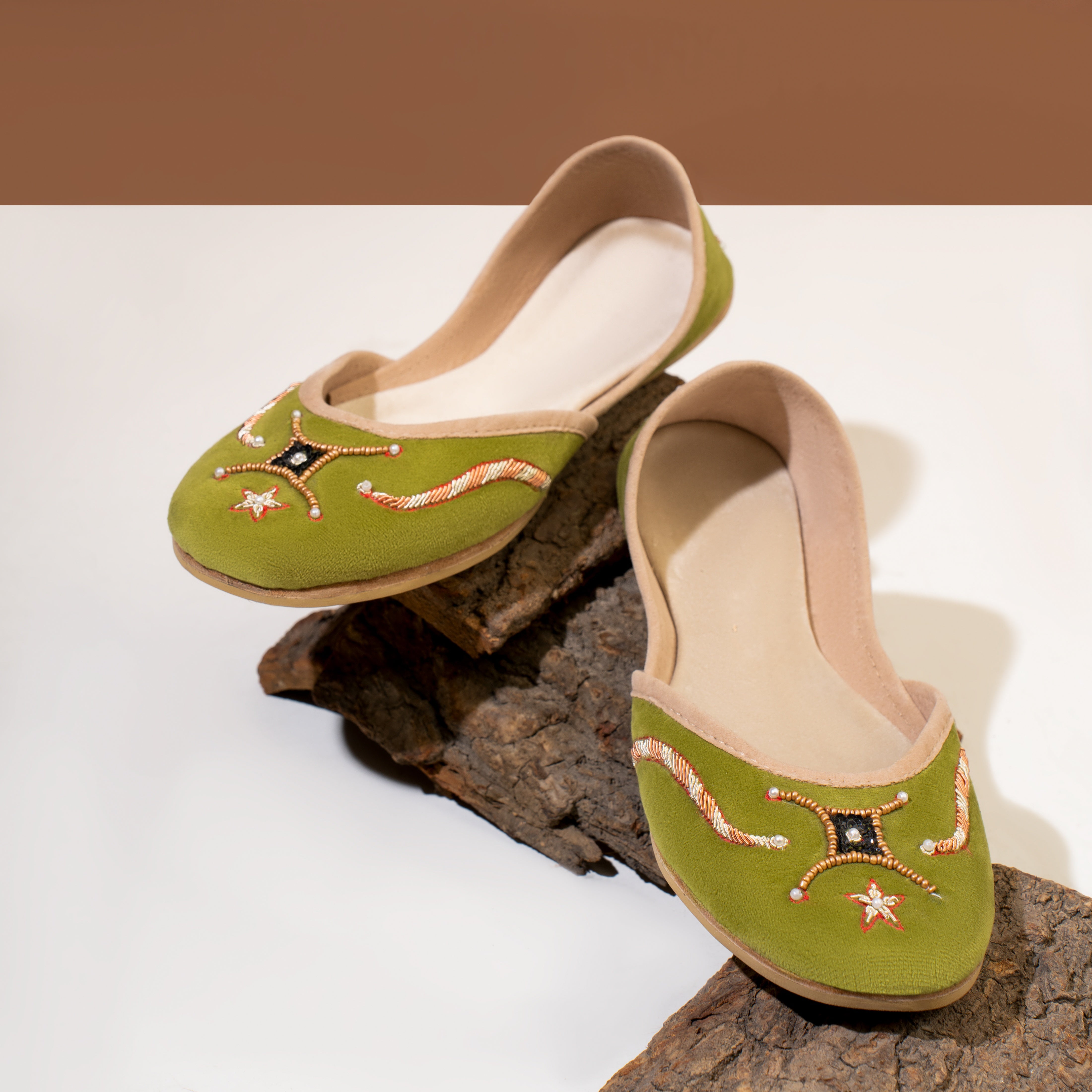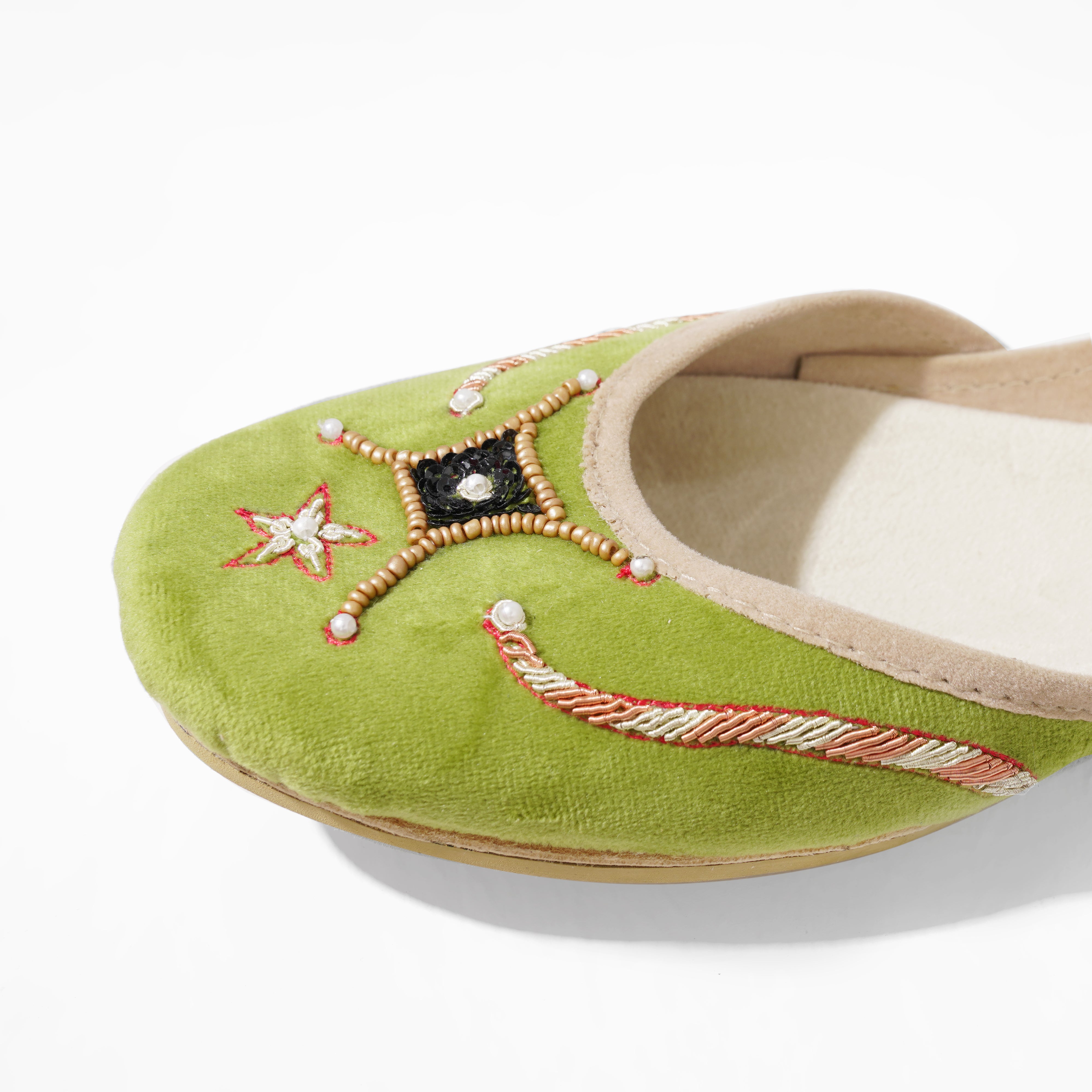 Introducing our exquisite and intricately crafted handmade velvet khussa, perfect for strolling through the lush and vibrant spring gardens. The iconic embroidery details, meticulously stitched by hand with fine threads in stunning shades of vibrant green, add a touch of traditional elegance to this modern and versatile style. The abstract design is a true work of art, showcasing the skilled precision and artistry of our masterful artisans. Each stitch is crafted with care, weaving together delicate threads into a tapestry of timeless beauty. The result is a stunning and unique piece, sure to turn heads and inspire admiration wherever you go. Slip on these exquisite khussas, and you'll feel like you're wearing a true masterpiece of traditional craftsmanship.